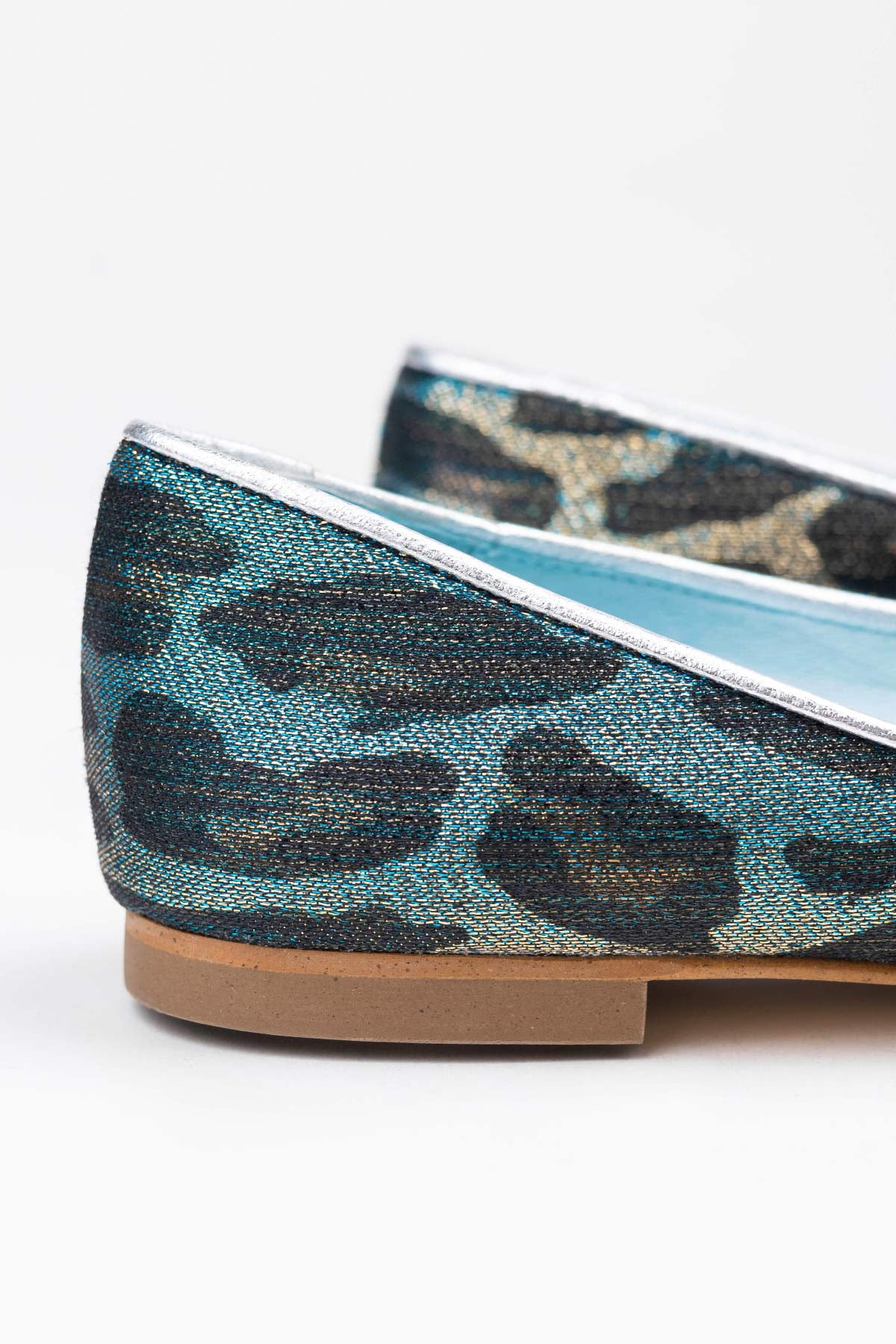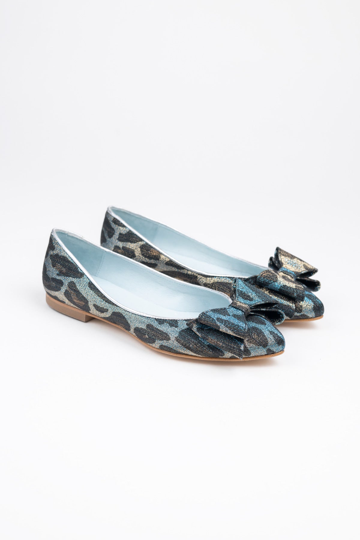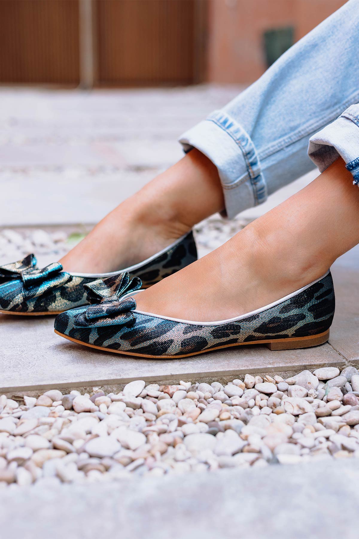 Praga Flower es una bailarina de temporada, elaborada con una hilatura de seda que va dando forma al estampado en print. Presentan un maxi lazo doble en el mismo tejido y en el contorno llevan un ribete de piel plateada.