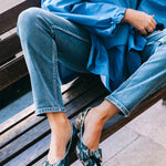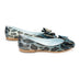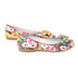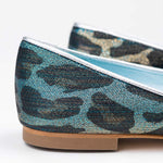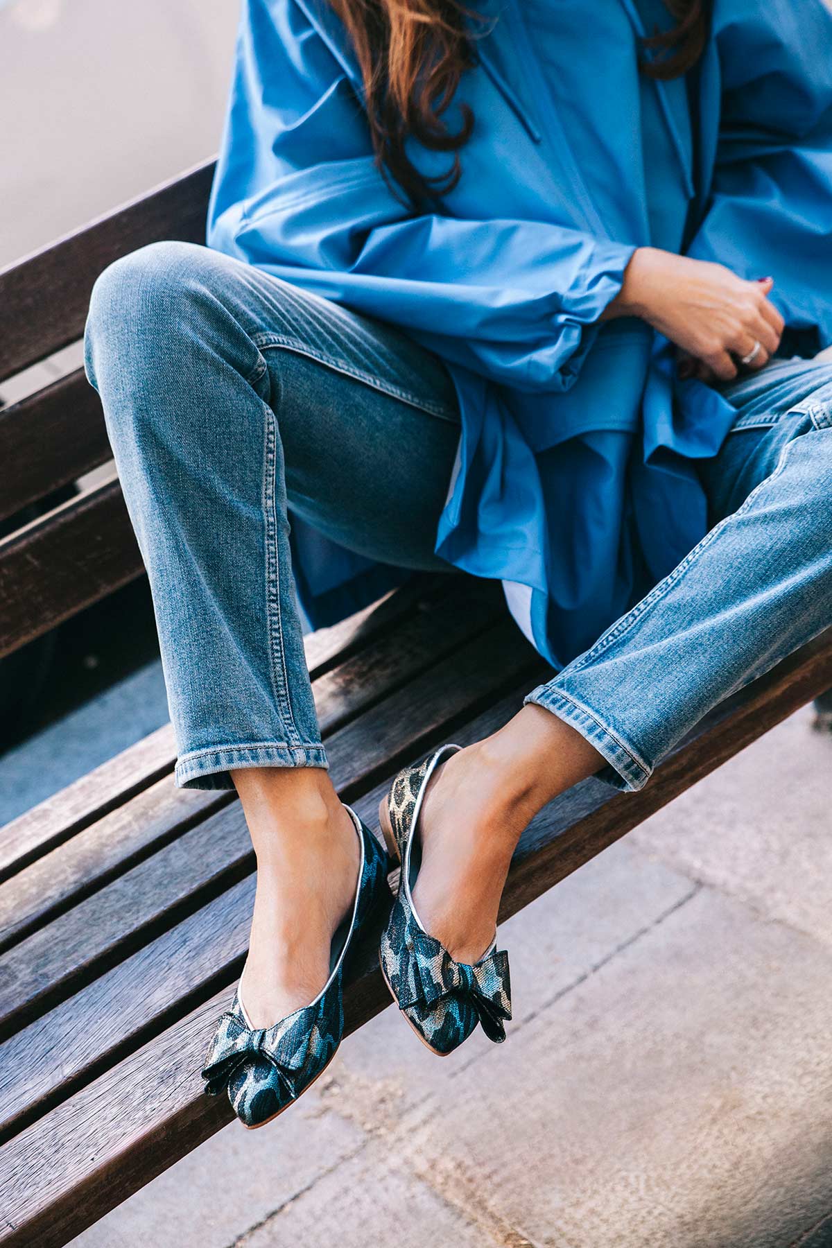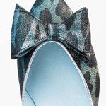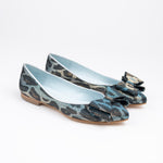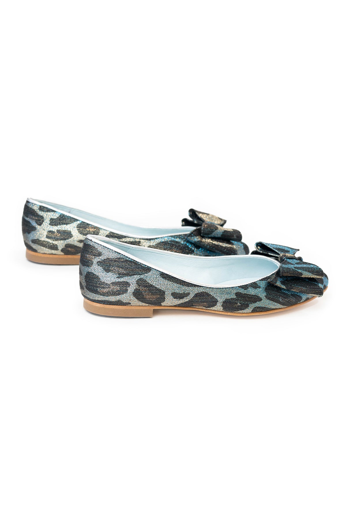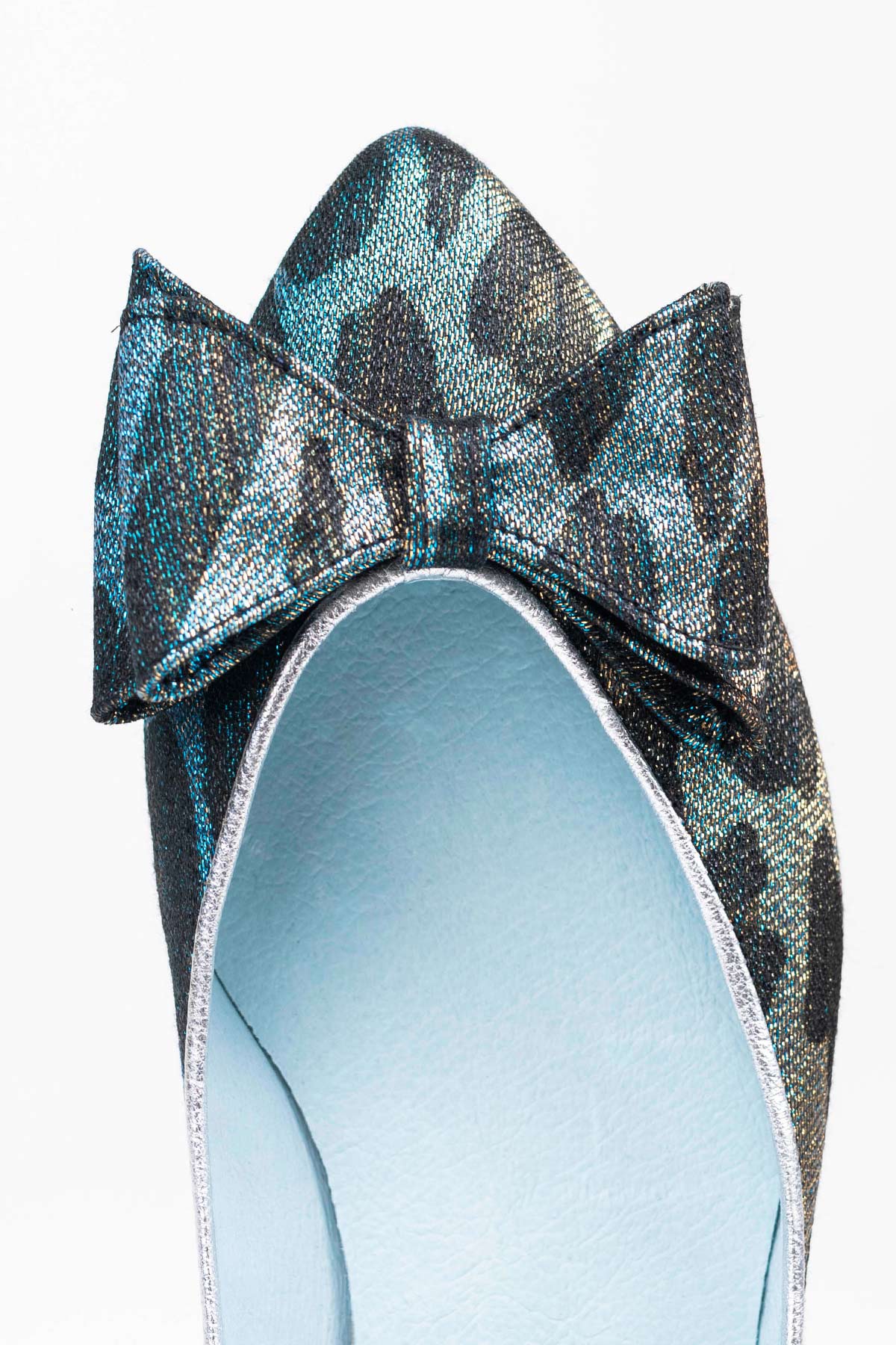 Praga Flower es una bailarina de temporada, elaborada con una hilatura de seda que va dando forma al estampado en print. Presentan un maxi lazo doble en el mismo tejido y en el contorno llevan un ribete de piel plateada.