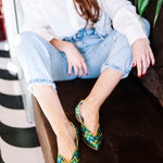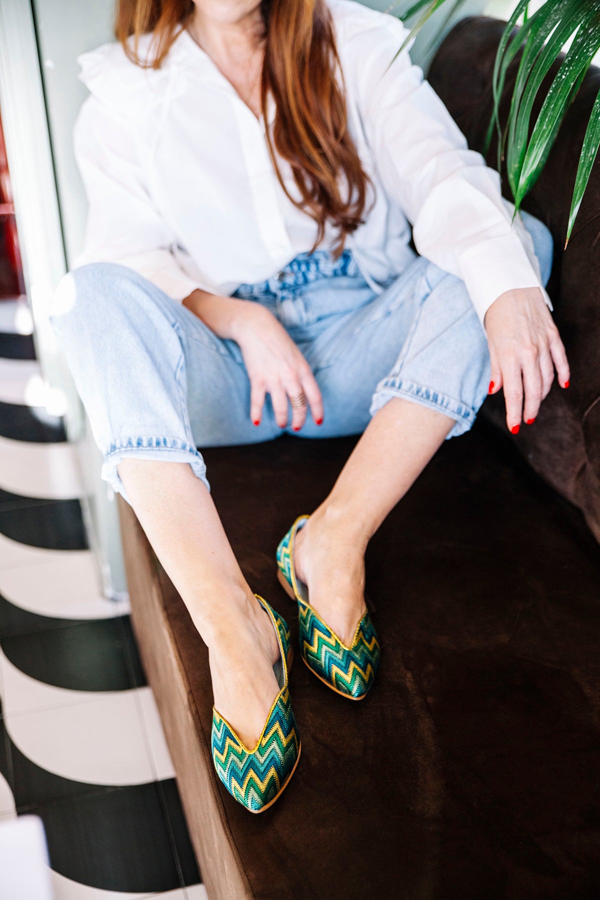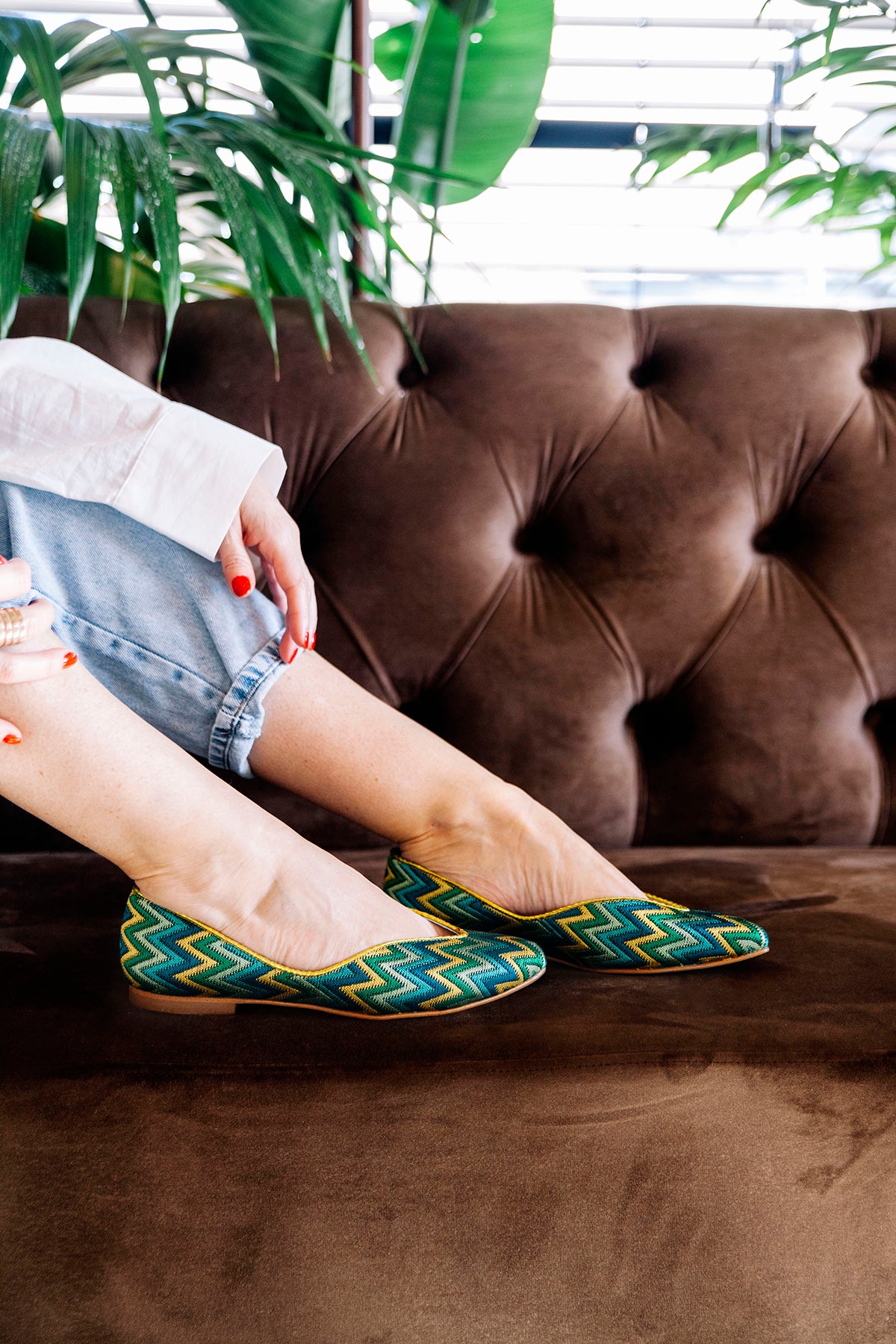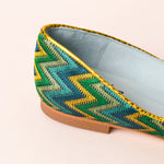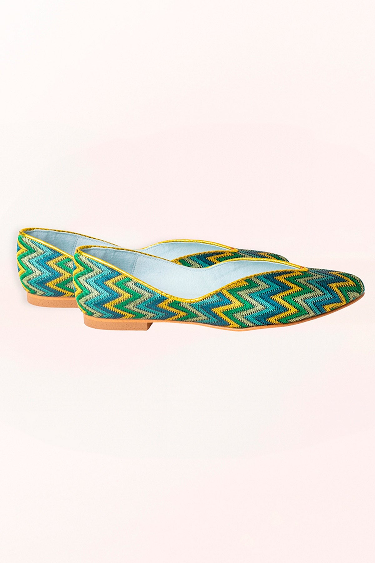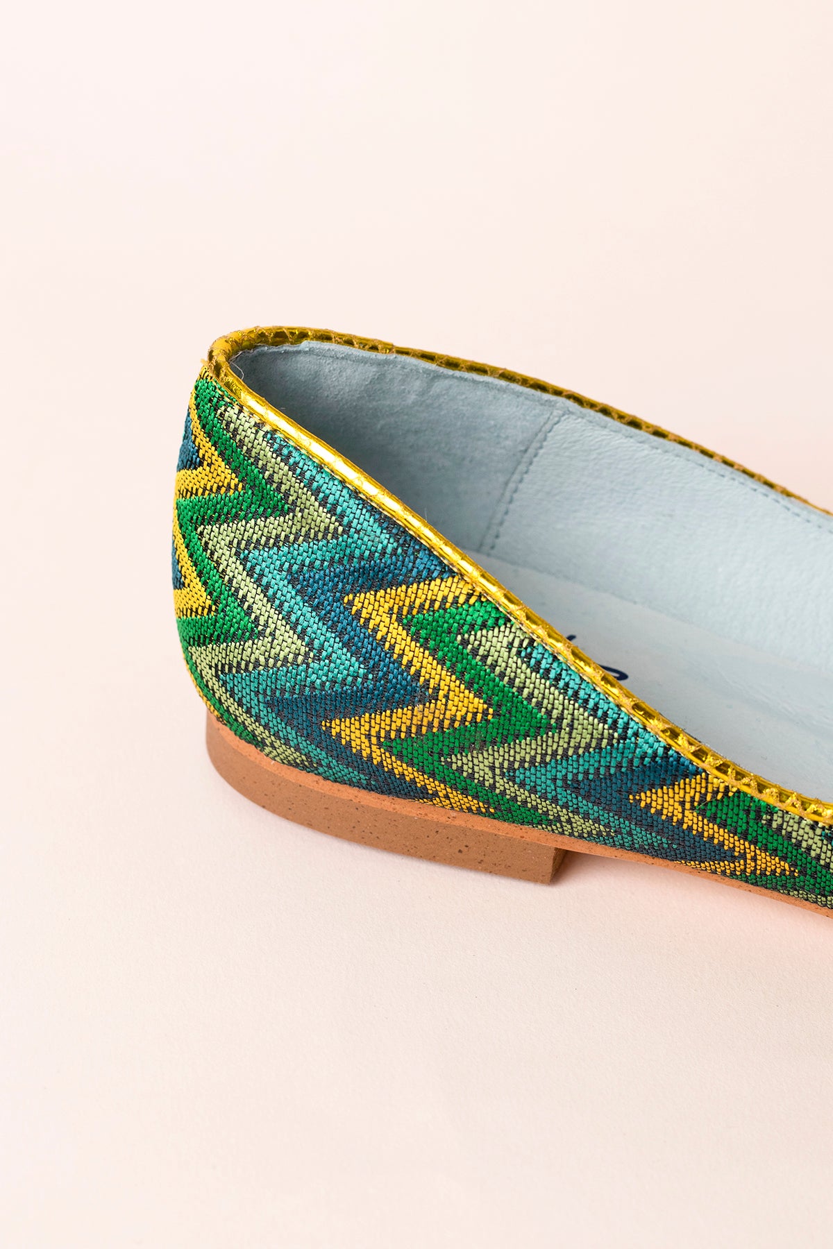 Bailarina con tejido en zig zag en tono verde. Diseñados y producidos de forma artesanal 100% en España.  Están elaborados con materias primas de alta calidad, seleccionadas al detalle.