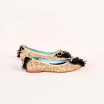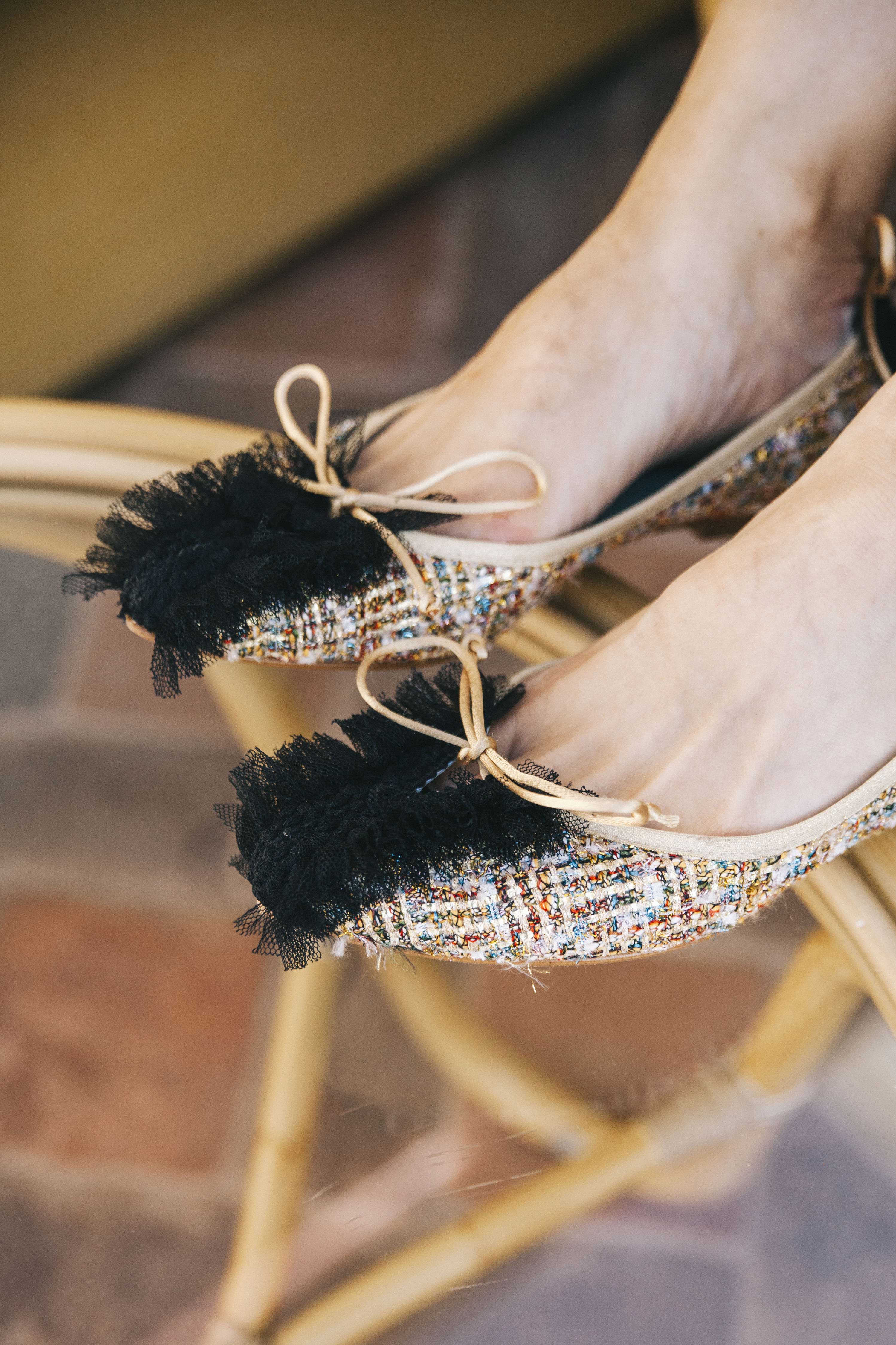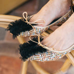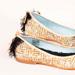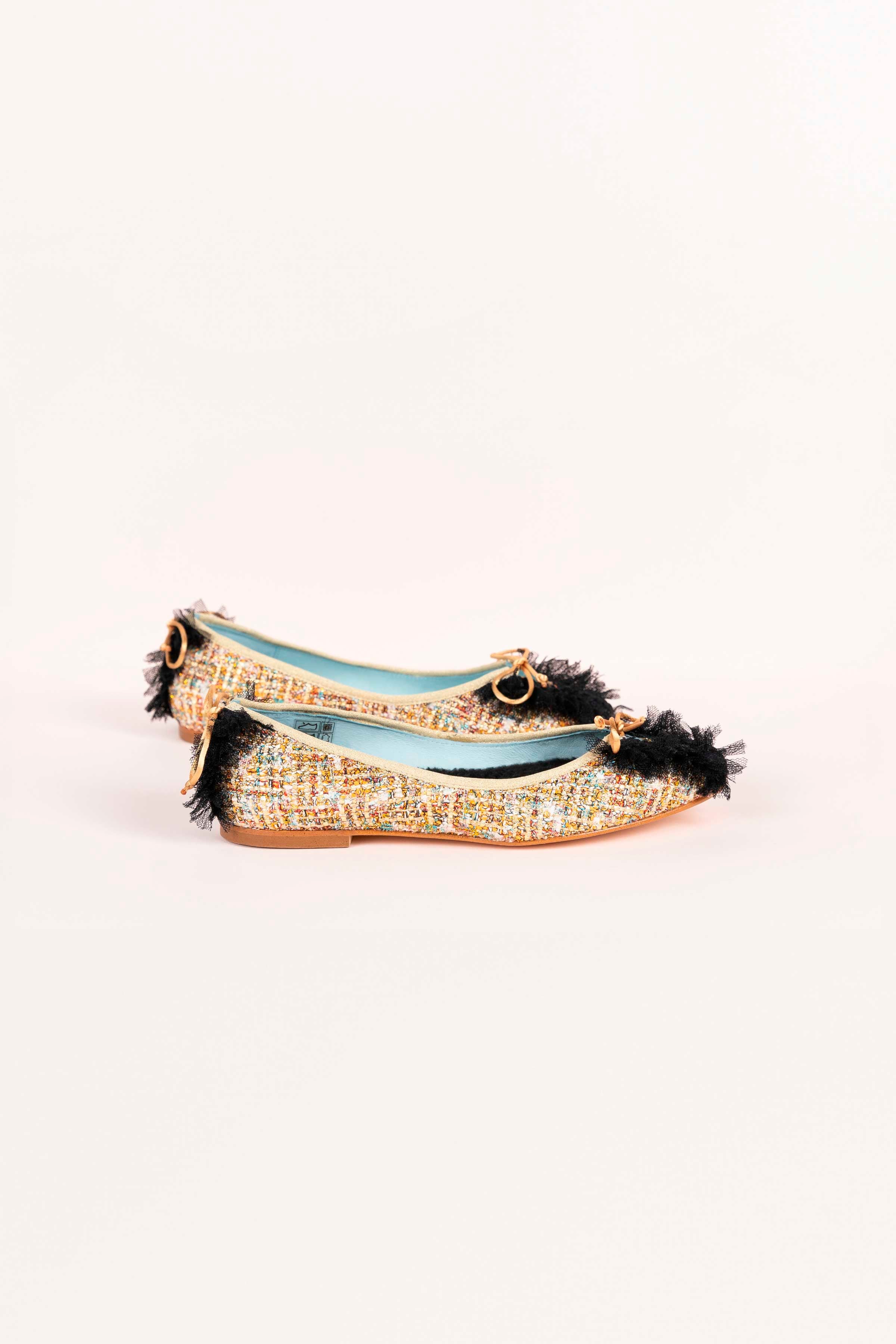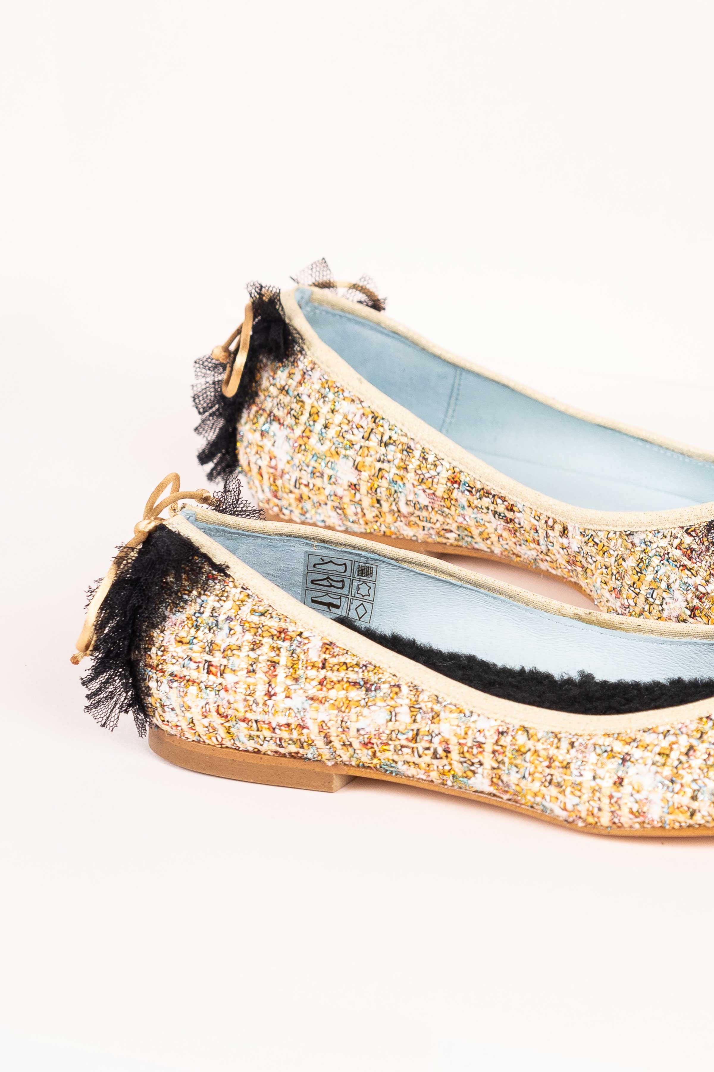 Bailarinas en base de tweed con detalle de volante en pala y latón. Diseñados y producidos de forma artesanal 100% en España. Están elaborados con materias primas de alta calidad, seleccionadas al detalle.
