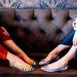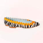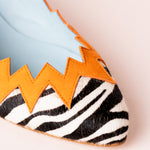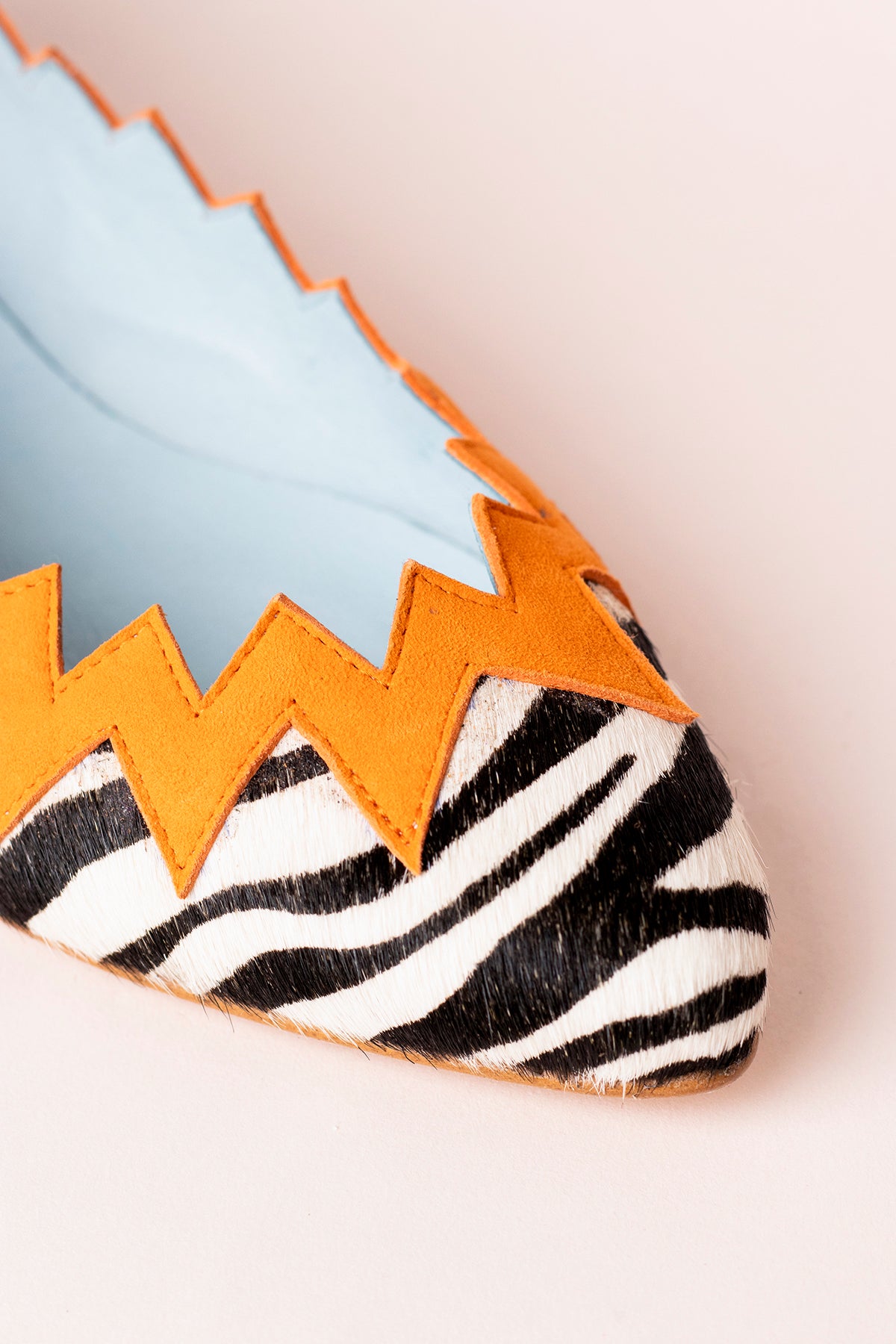 Bailarina de raso estampado en animal print de cebra con ante en contraste naranja en zigzag.