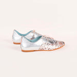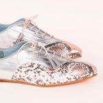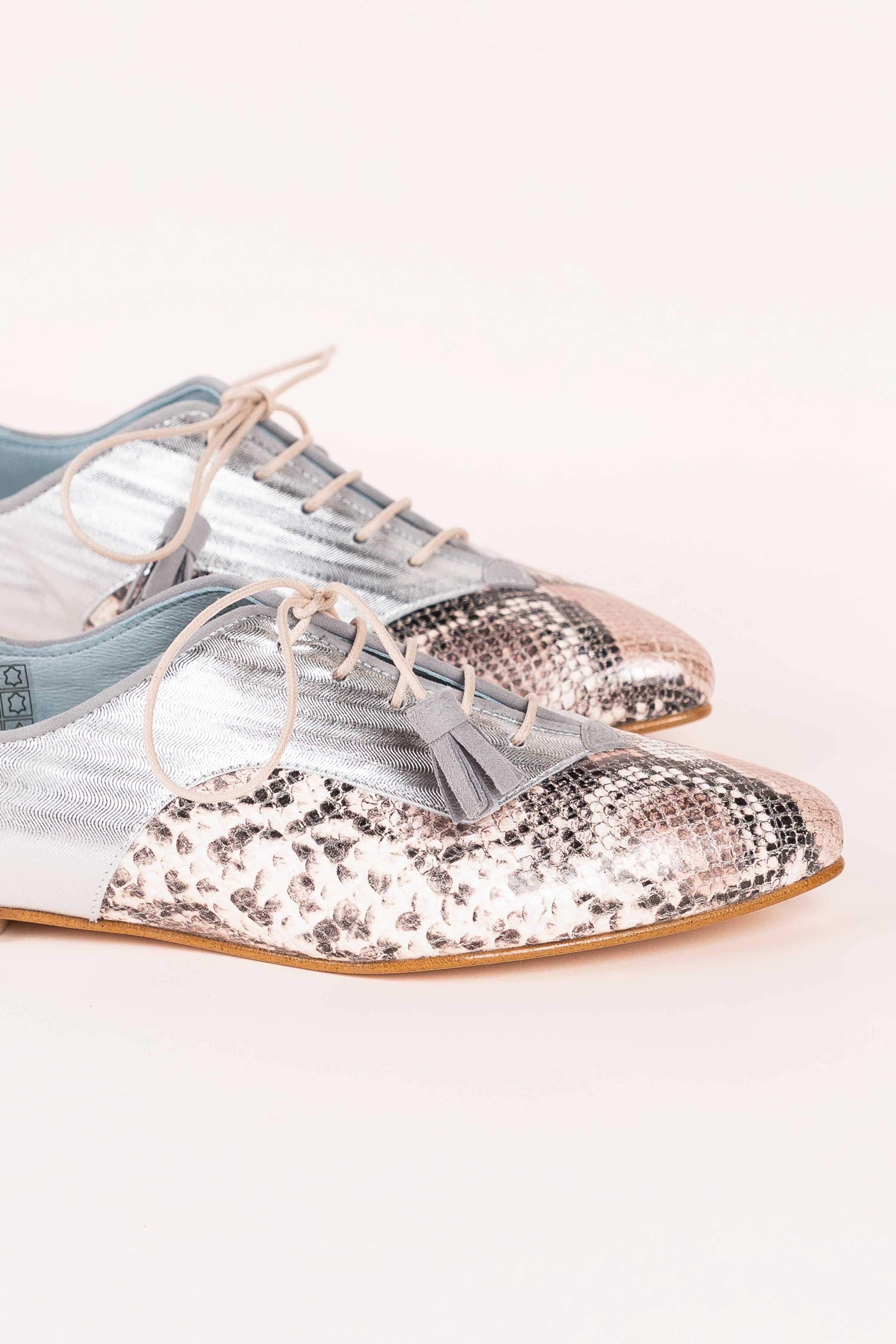 Blucher de cordones combinado con piel estampada y napa en tonos plata + rosa • PLANTILLA INTERCAMBIABLE • Made in Spain. Todos nuestros modelos poseen una cuña interna de 1,5cm. Interior 100% piel. Suela de cuero. Modelo exclusivo de defloresyfloreros, diseñado y fabricado en España.