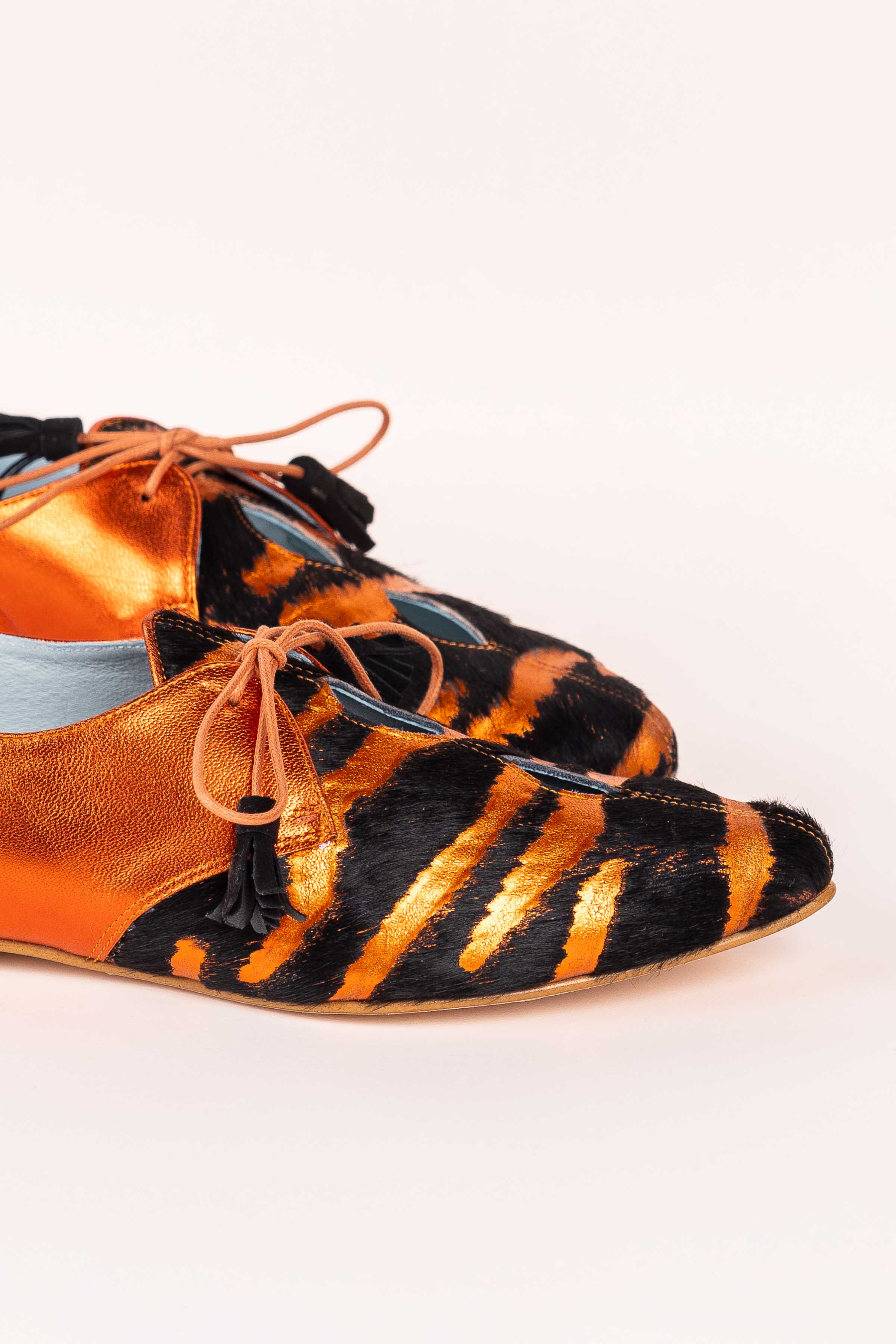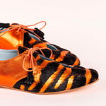 Blucher plano con pala de doble abertura y combinado de napa y piel con pelo con motivo animal print. Talón a contraste de napa brillante• PLANTILLA INTERCAMBIABLE• Made in Spain. Todos nuestros modelos poseen una cuña interna de 1,5cm. Interior 100% piel. Suela de cuero. Modelo exclusivo de defloresyfloreros, diseñado y fabricado en España.