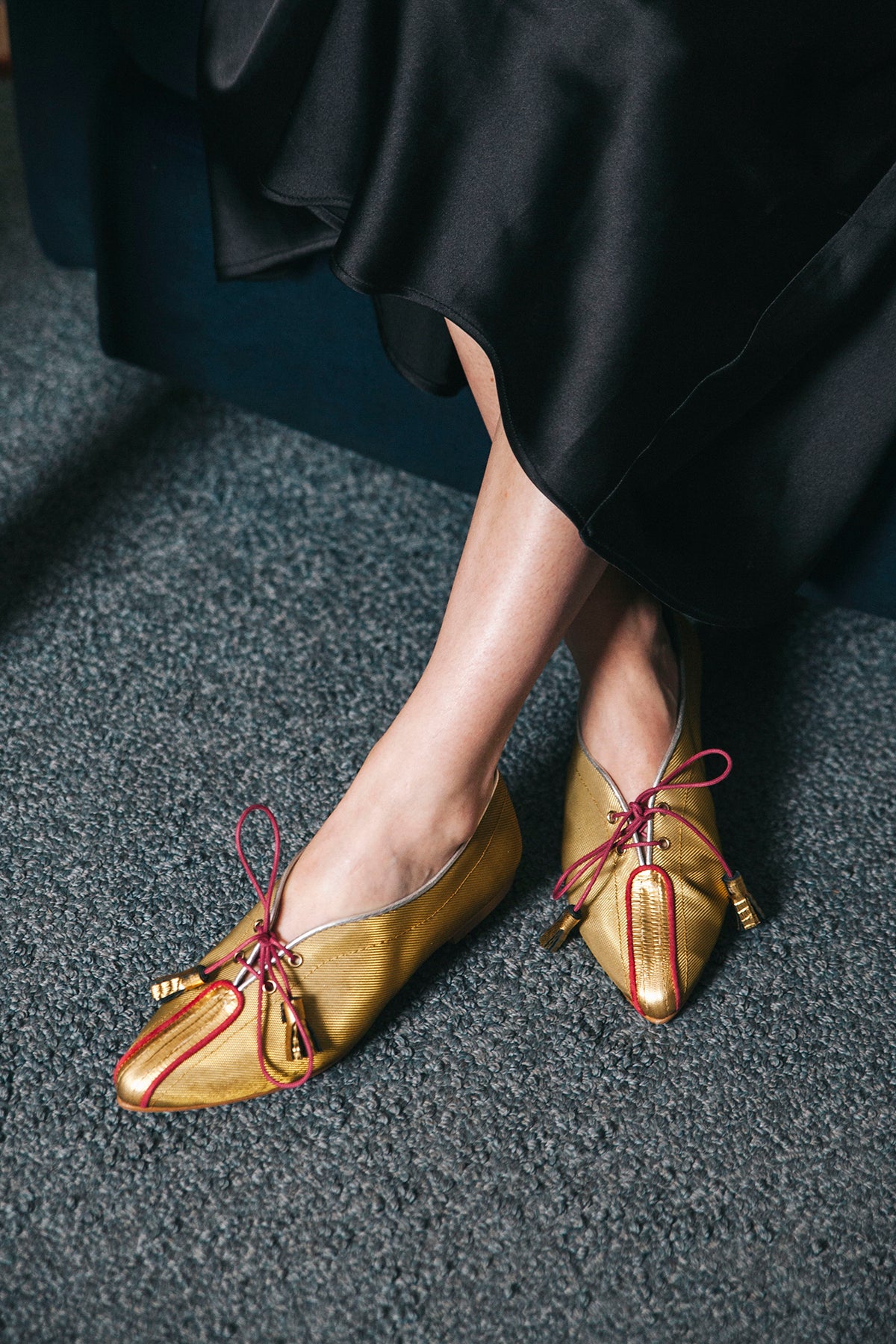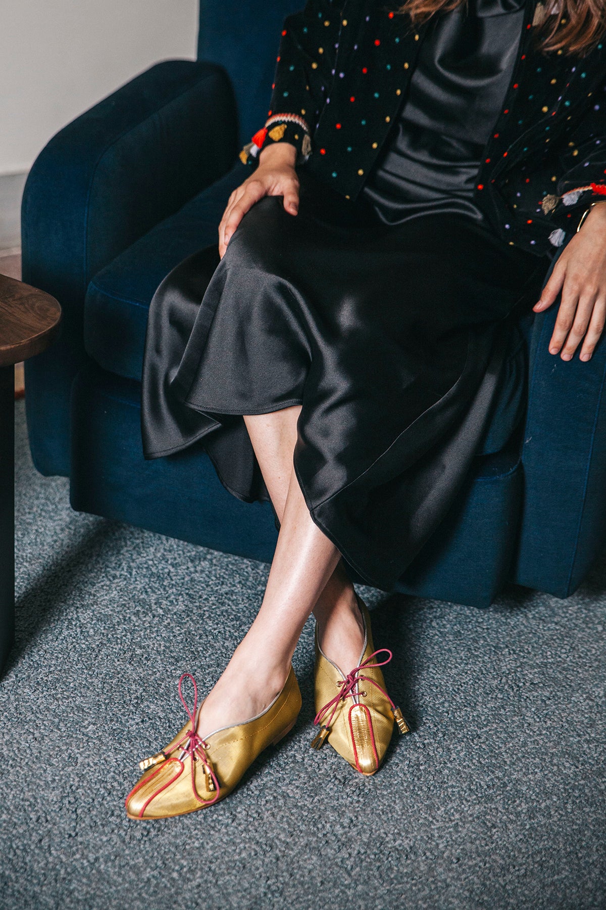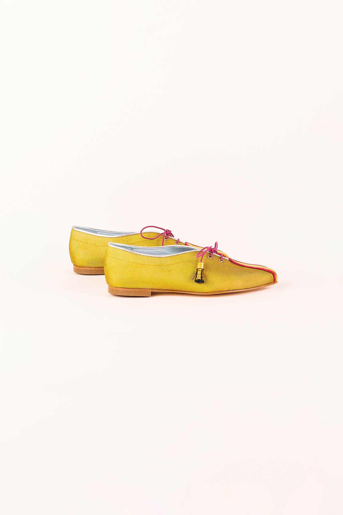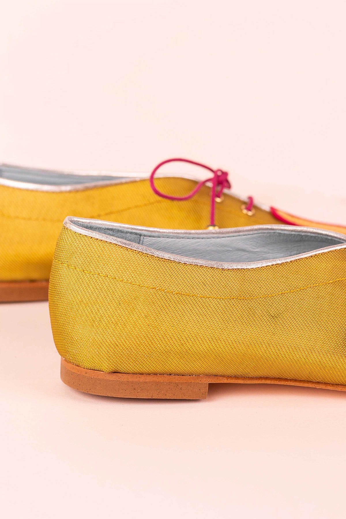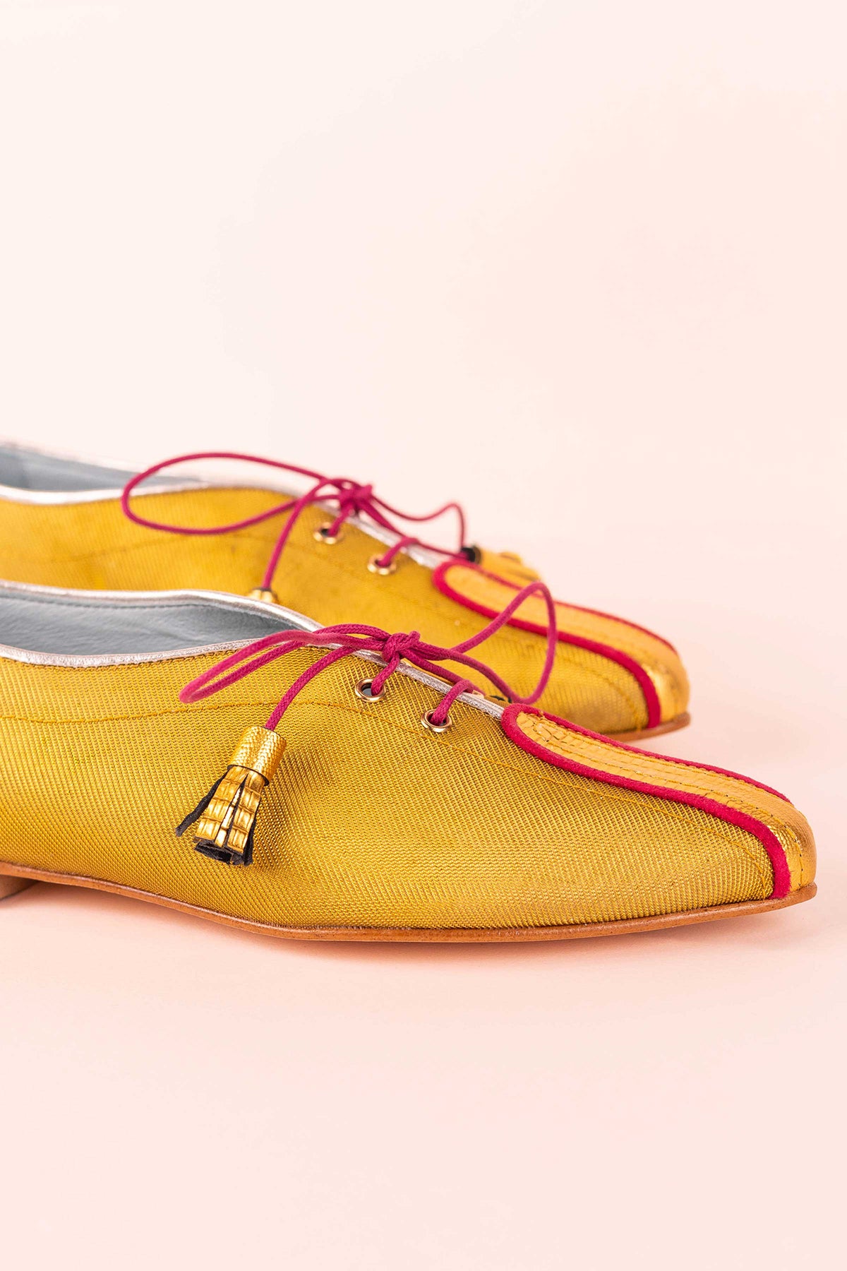 Zapatos tipo blucher de tejido en un color dorado oliva con cordones y ribete a contraste. Diseñados y producidos de forma artesanal 100% en España. Están elaborados con materias primas de alta calidad, seleccionadas al detalle.