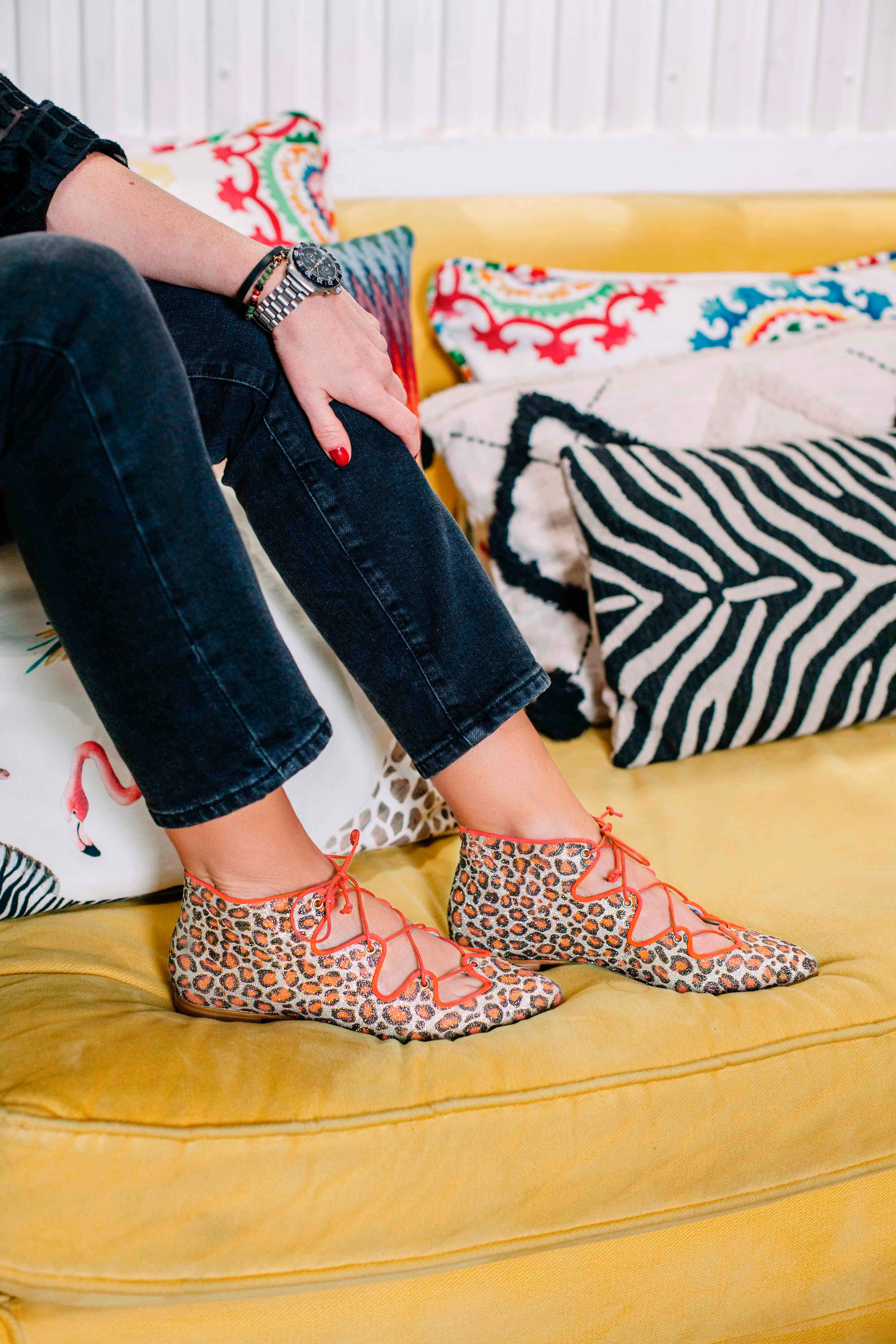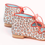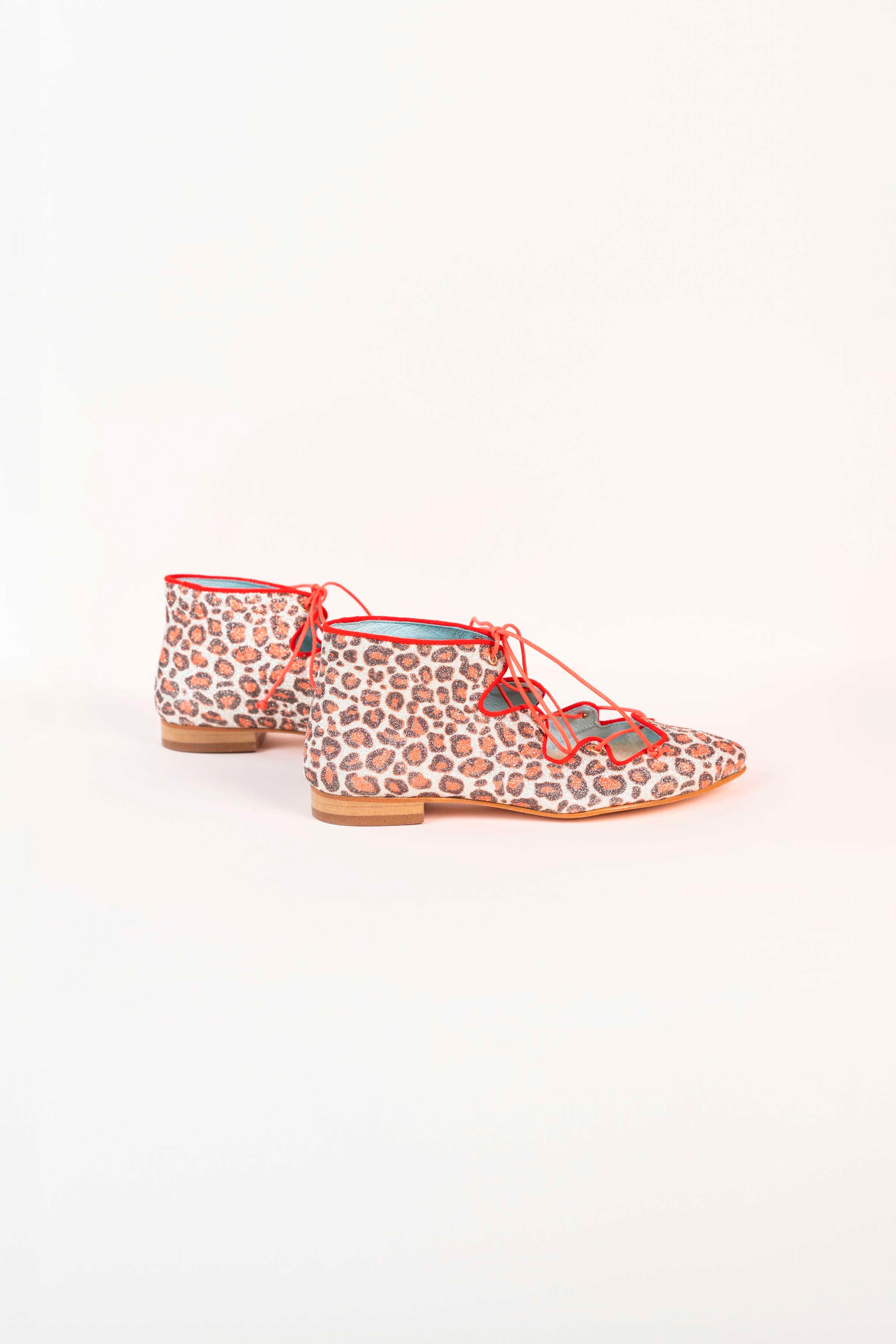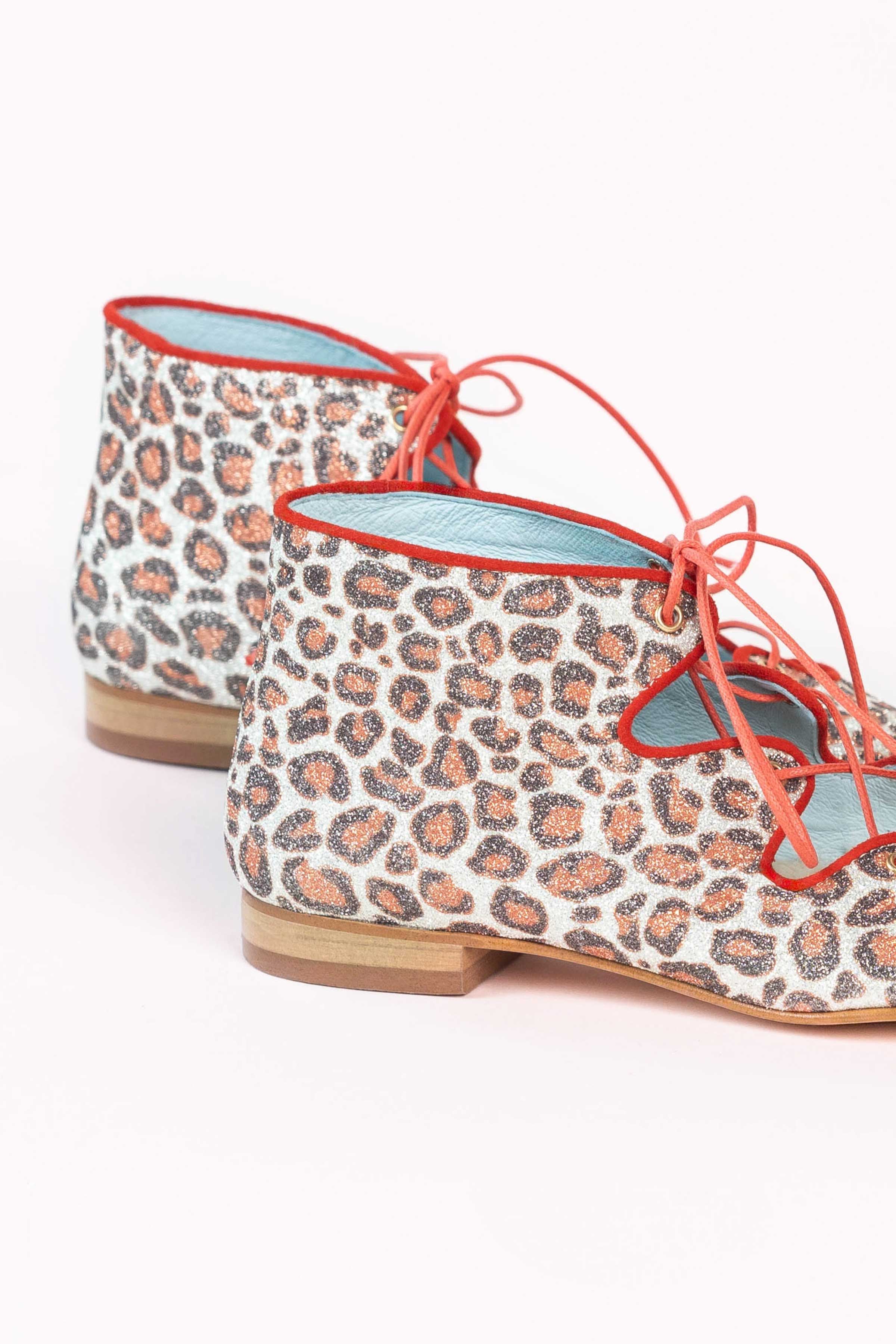 Blucher combinado en animal print en glitter y acordonado en parte central • PLANTILLA INTERCAMBIABLE • Made in Spain. Todos nuestros modelos poseen una cuña interna de 1,5cm. Interior 100% piel. Suela de cuero. Modelo exclusivo de defloresyfloreros, diseñado y fabricado en España.