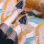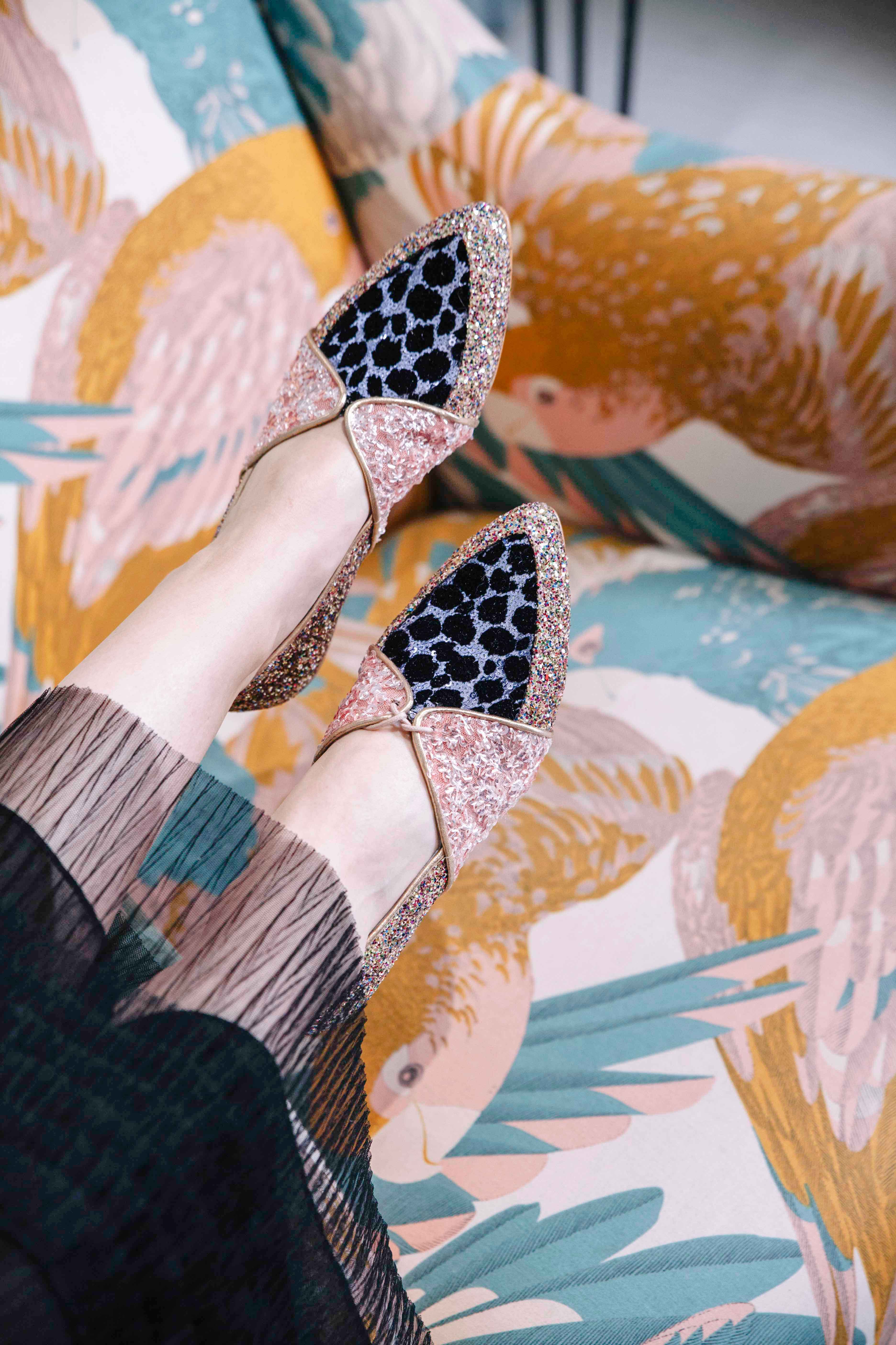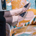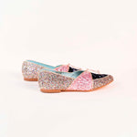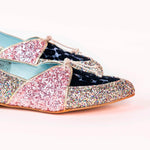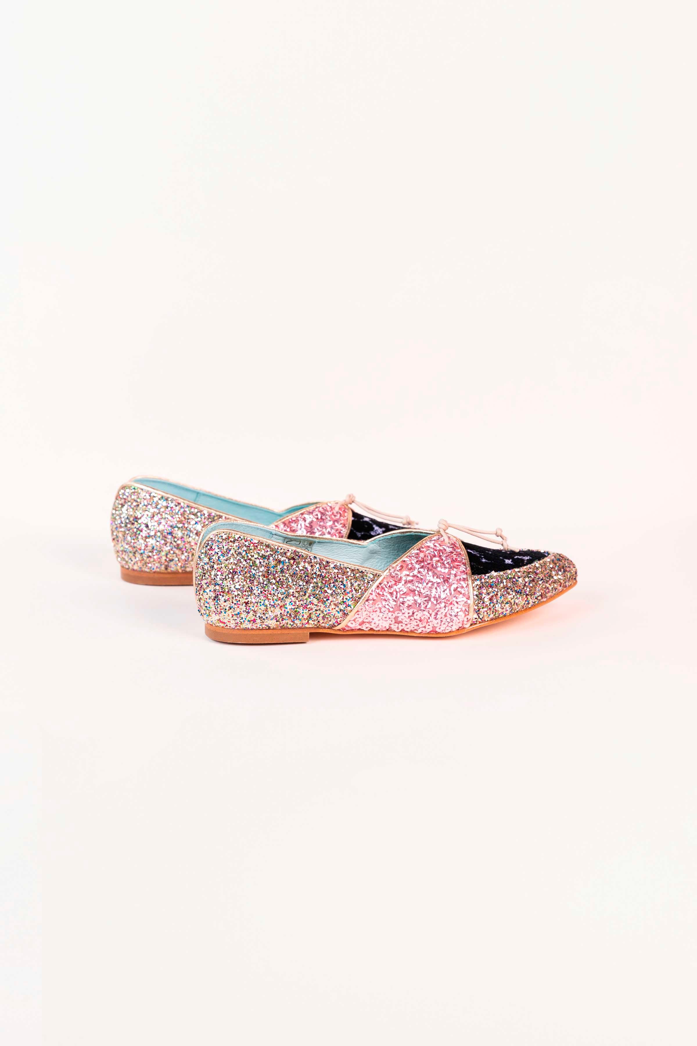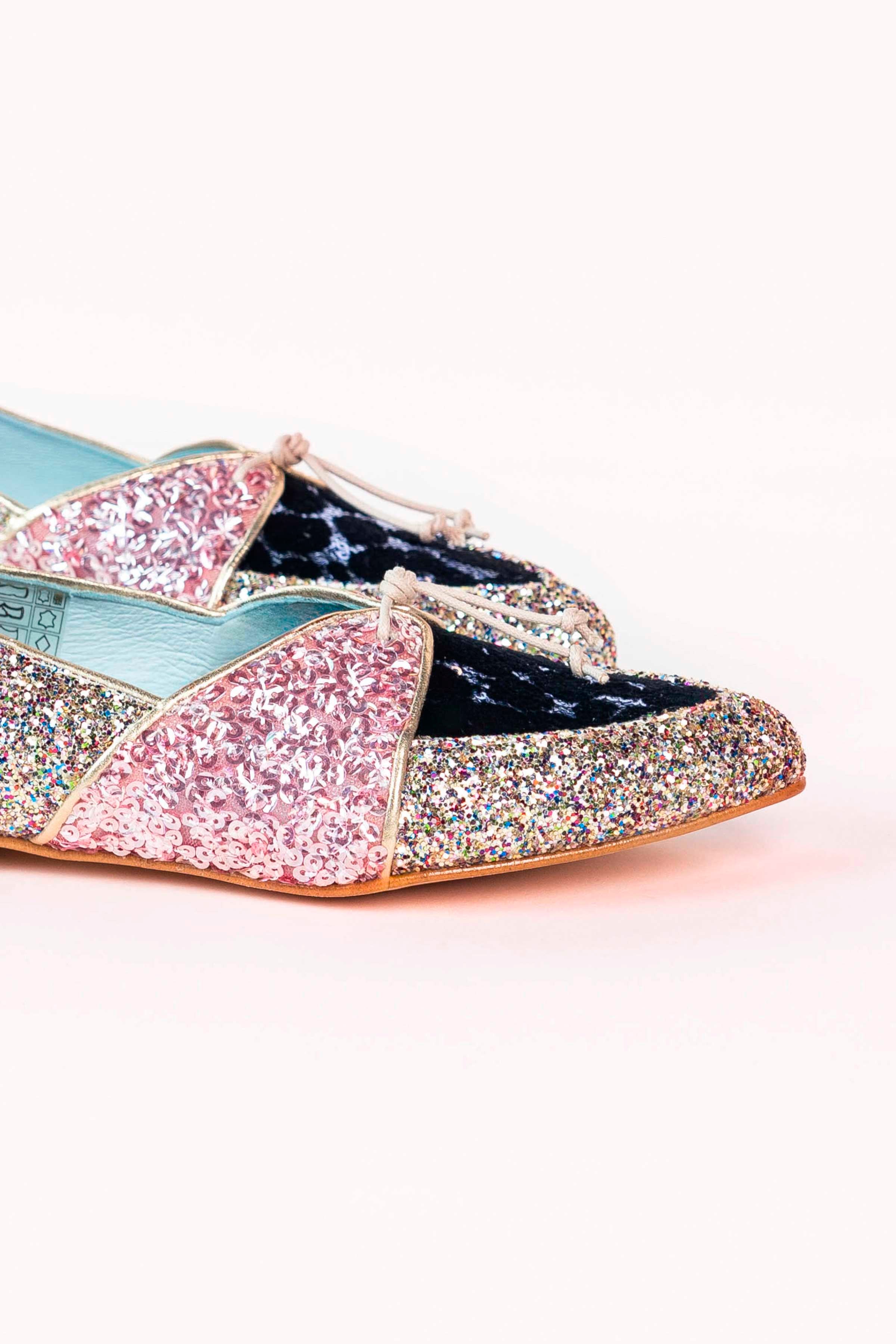 Blucher con piezas geométricas en glitter y lentejuelas blocadas. Anudado en pala superior con cordón • PLANTILLA INTERCAMBIABLE • Made in Spain. Todos nuestros modelos poseen una cuña interna de 1,5cm. Interior 100% piel. Suela de cuero. Modelo exclusivo de defloresyfloreros, diseñado y fabricado en España.