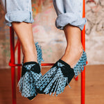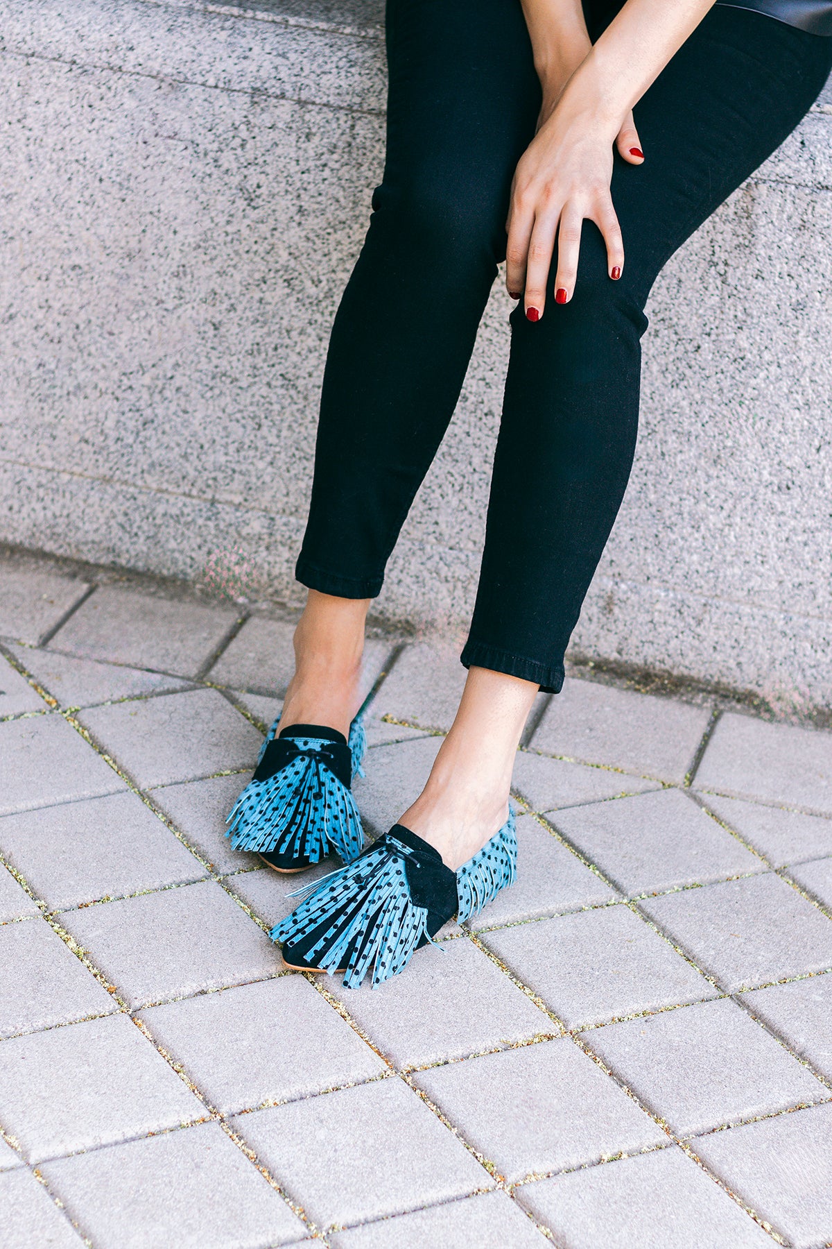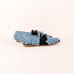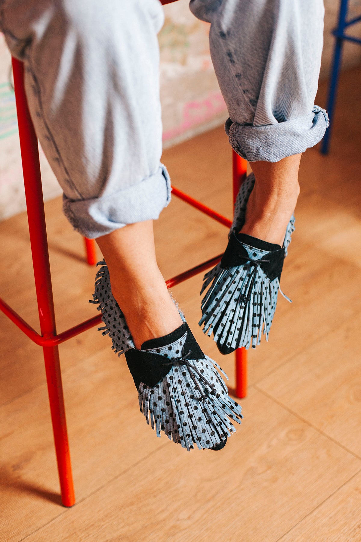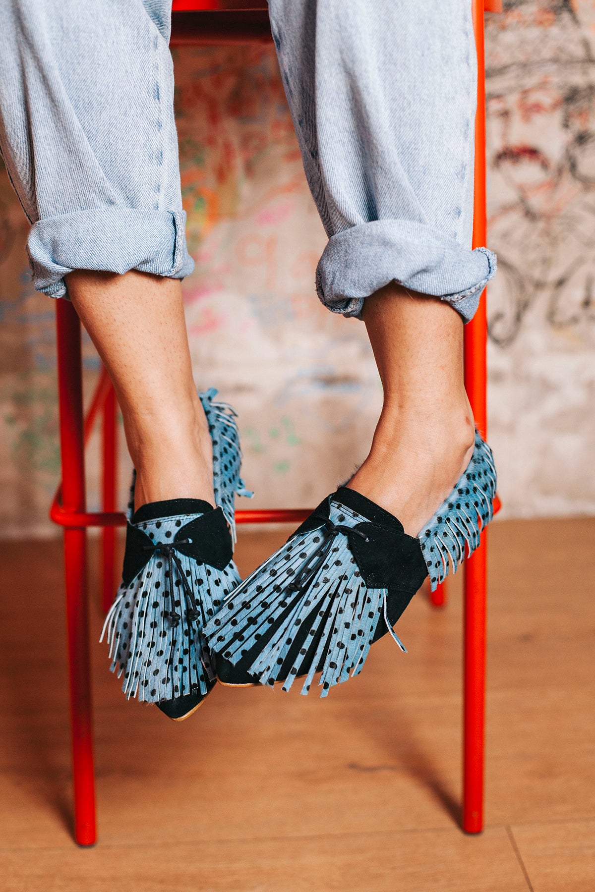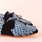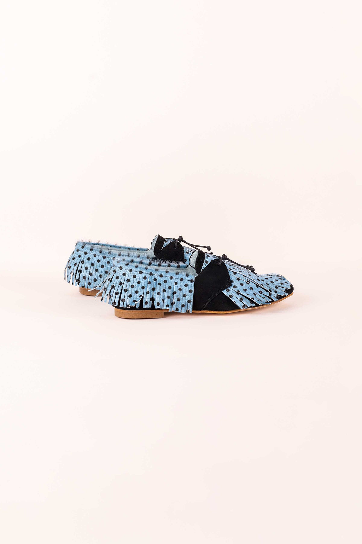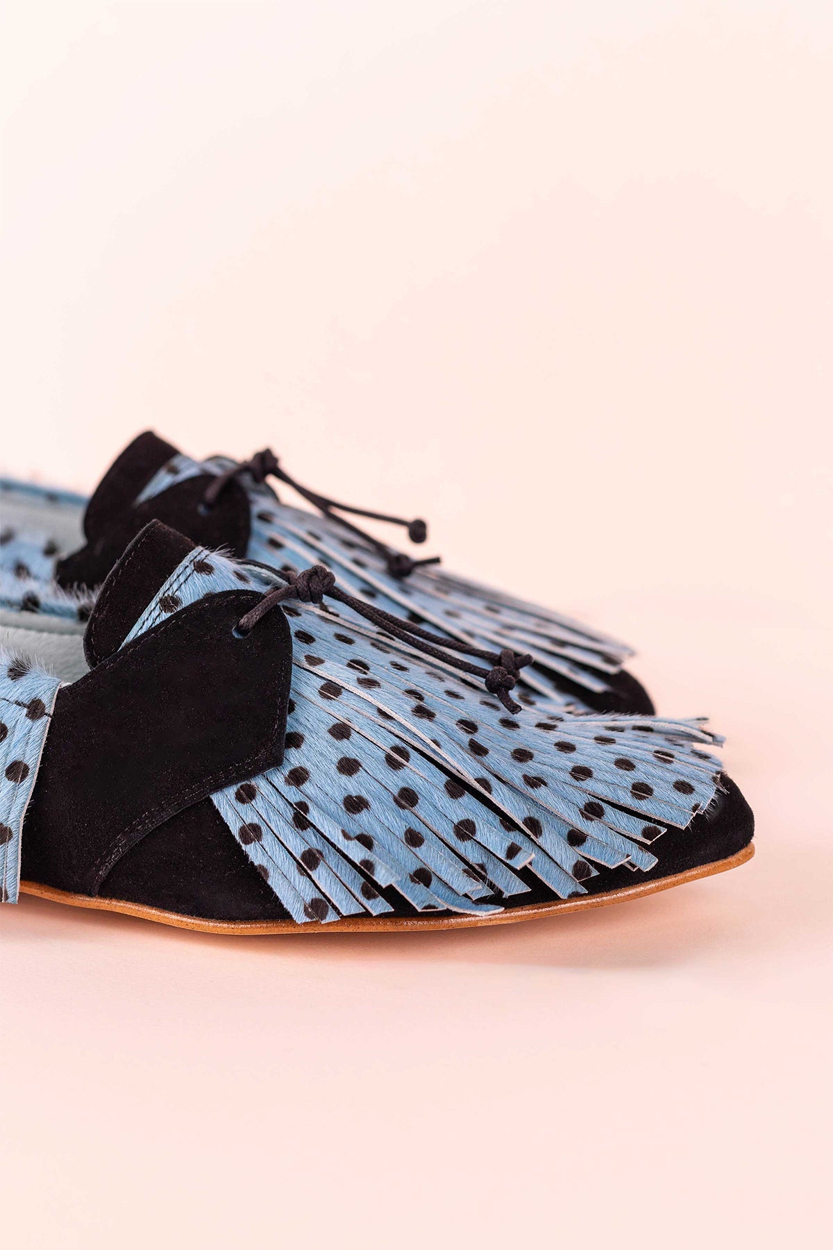 Zapatos tipo blucher en combinación de animal print y ante. Con flecos en combinación de azul y negro, diseñados y producidos de forma artesanal 100% en España. Están elaborados con materias primas de alta calidad, seleccionadas al detalle.