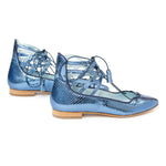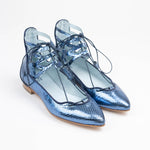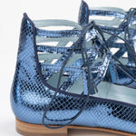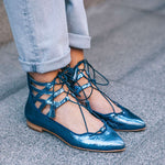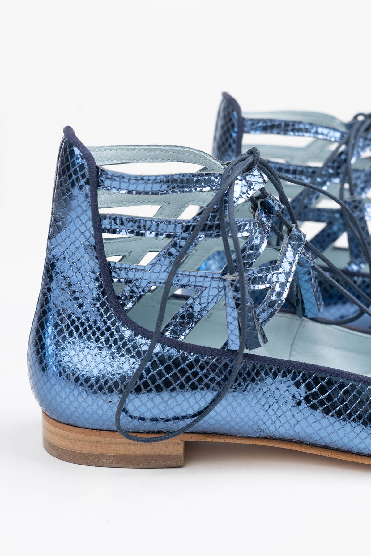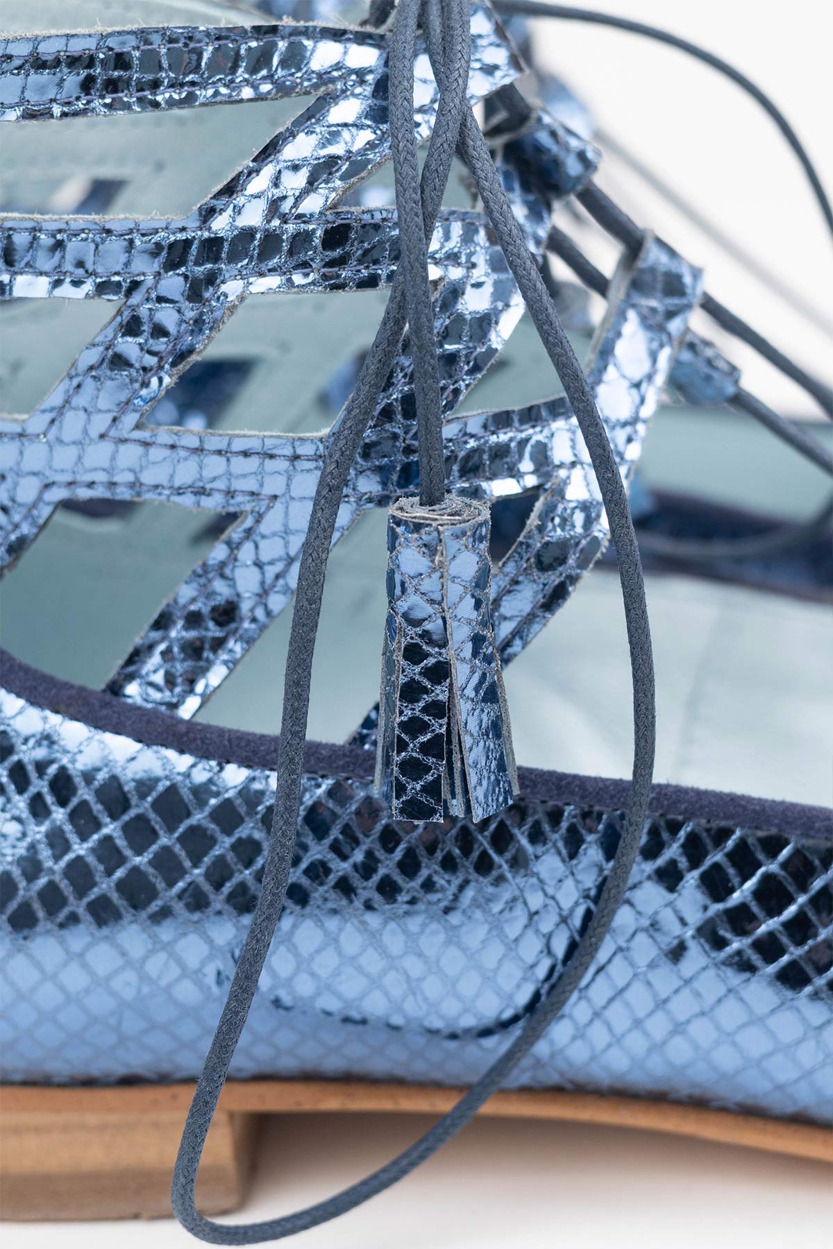 Dublín Edén es un modelo semi-botín que recoge el tobillo con una pieza de piel y va atado en la zona delantera, con un cordón de algodón rematado en borlas. Dublín favorece la silueta del pie por su gran escote delantero y por la pieza del tobillo, con múltiples calados cortados de forma manual, con bisturí, que recoge sin acortar. Una de sus claves es el ribete negro, cosido con precisión y que hace que el zapato favorezca a cualquier tono de piel. El tejido es de piel.