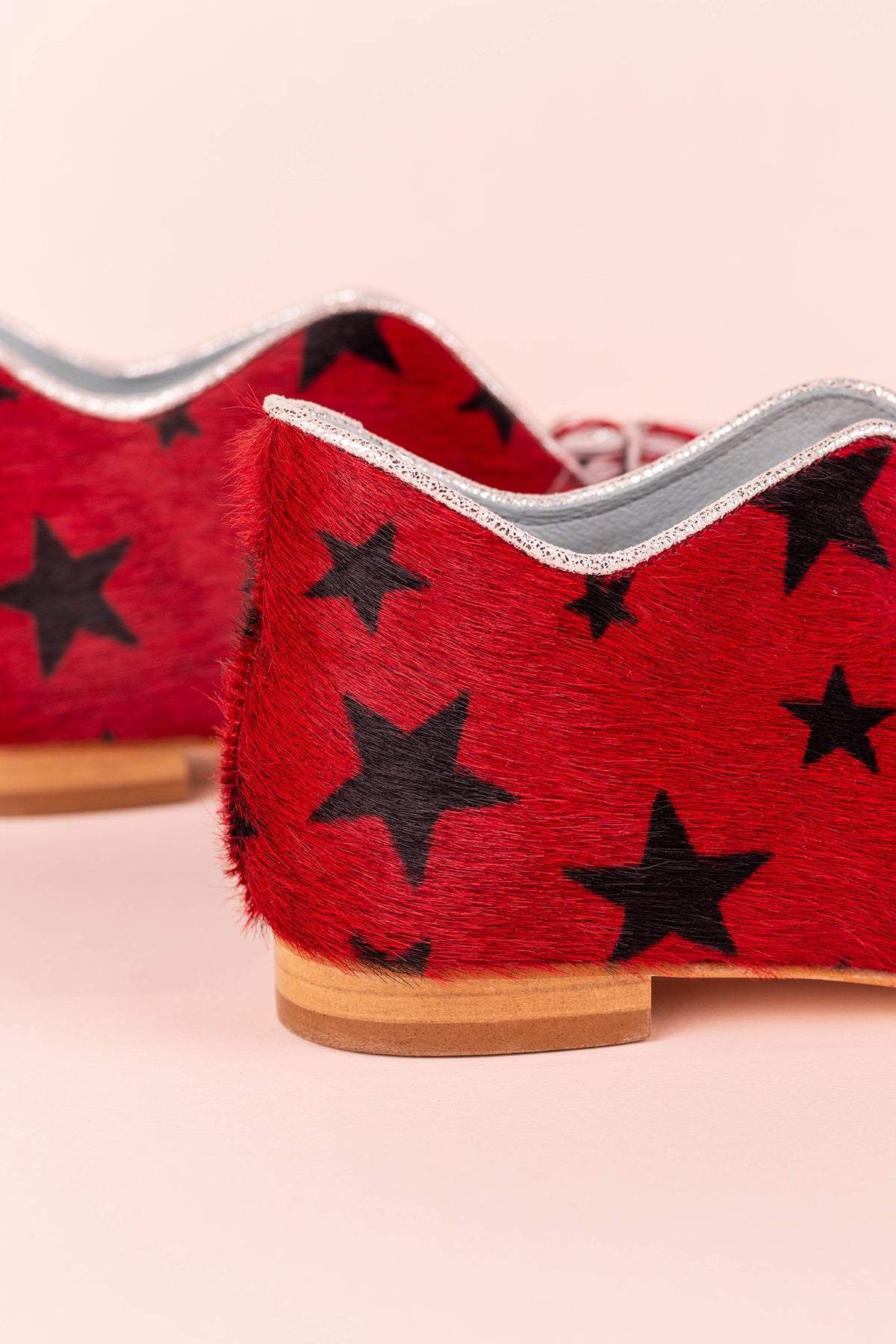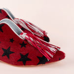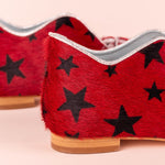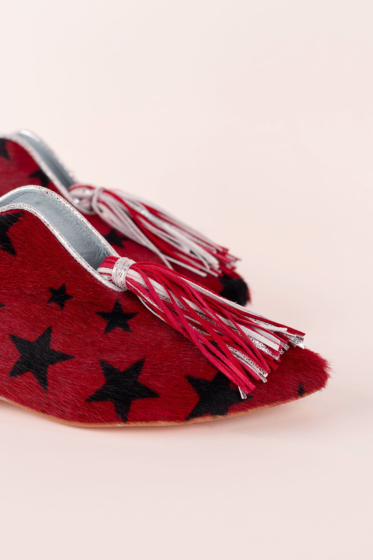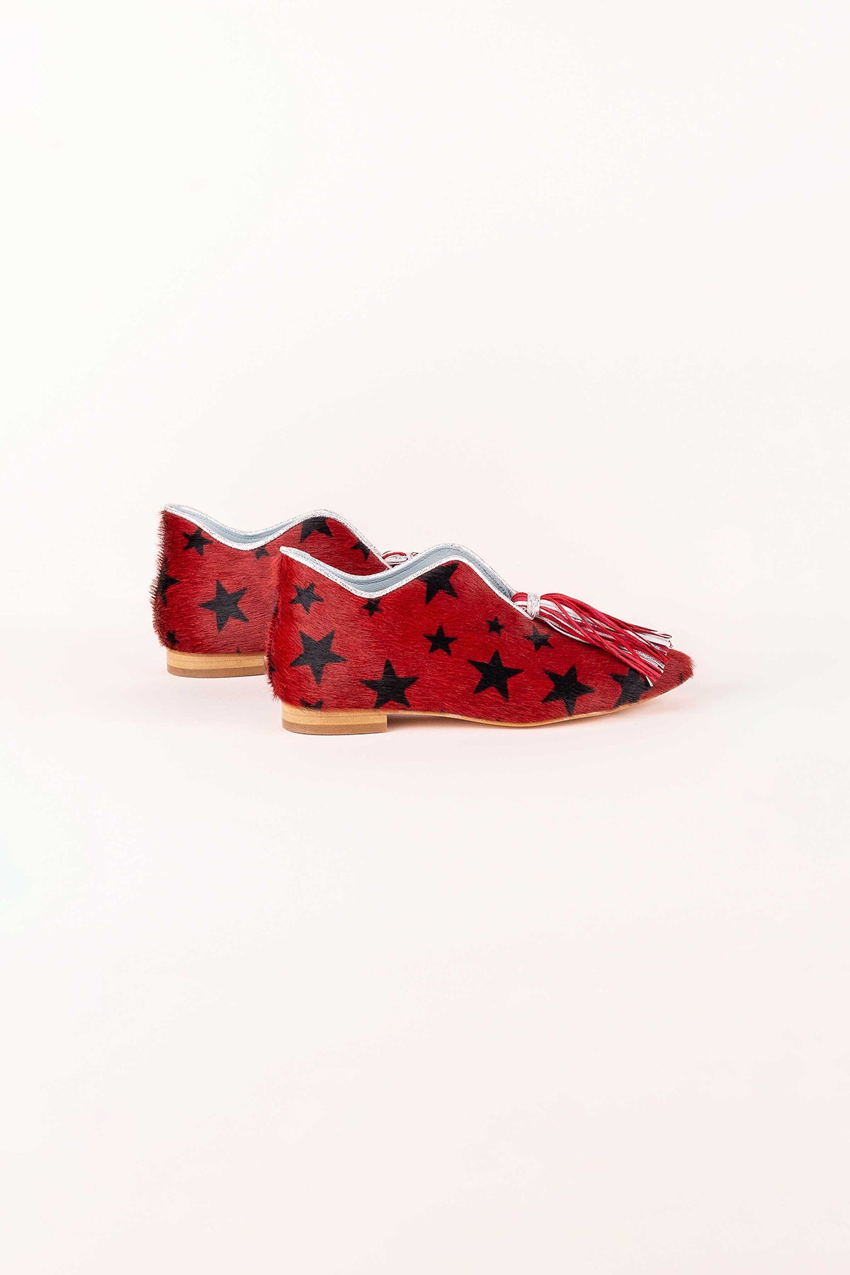 Botín de piel de pony abierto en pala con borlón de ante combinado, en rojo con estrellas pintadas a mano en negro. Diseñados y producidos de forma artesanal 100% en España. Están elaborados con materias primas de alta calidad, seleccionadas al detalle.