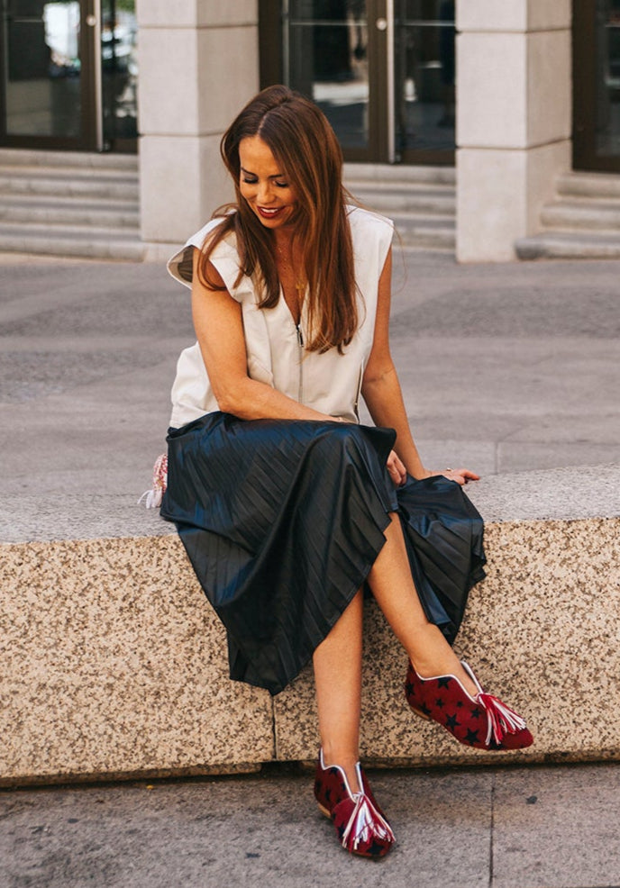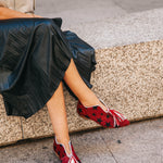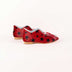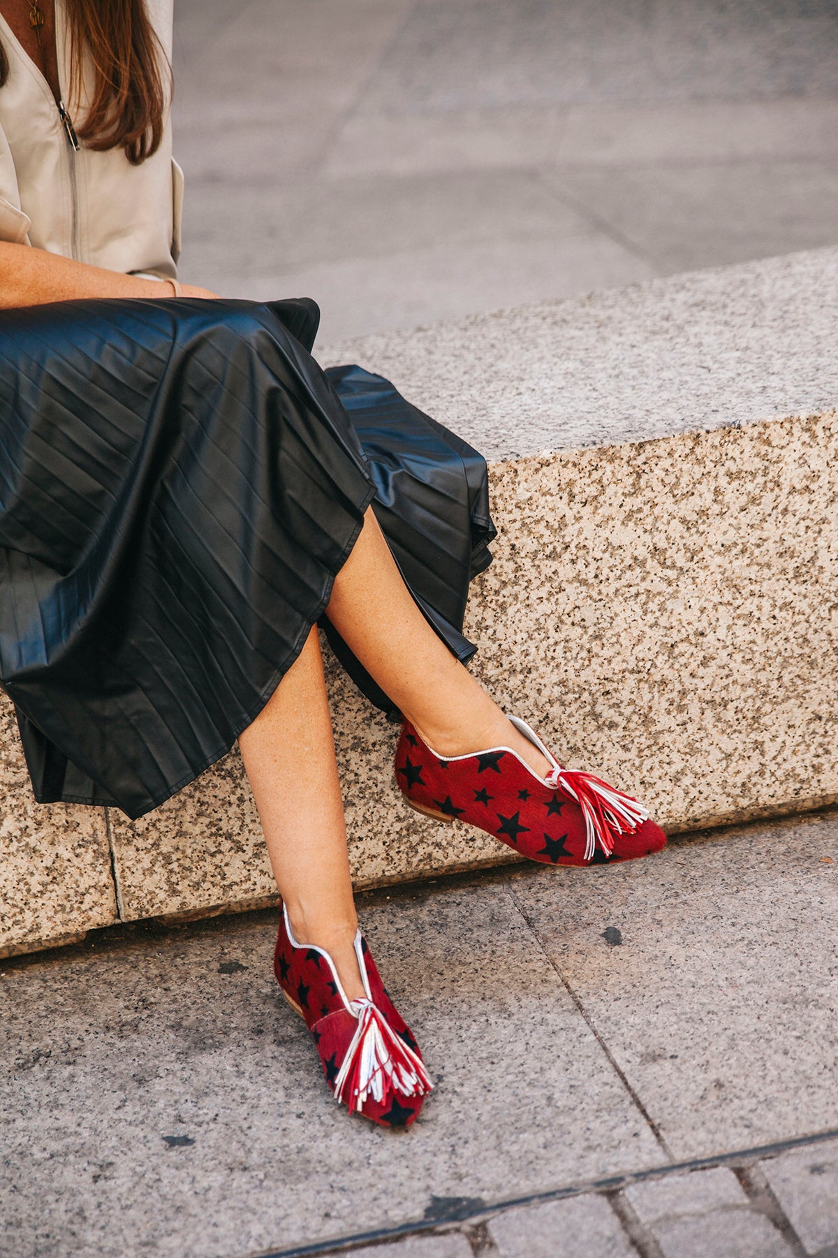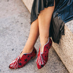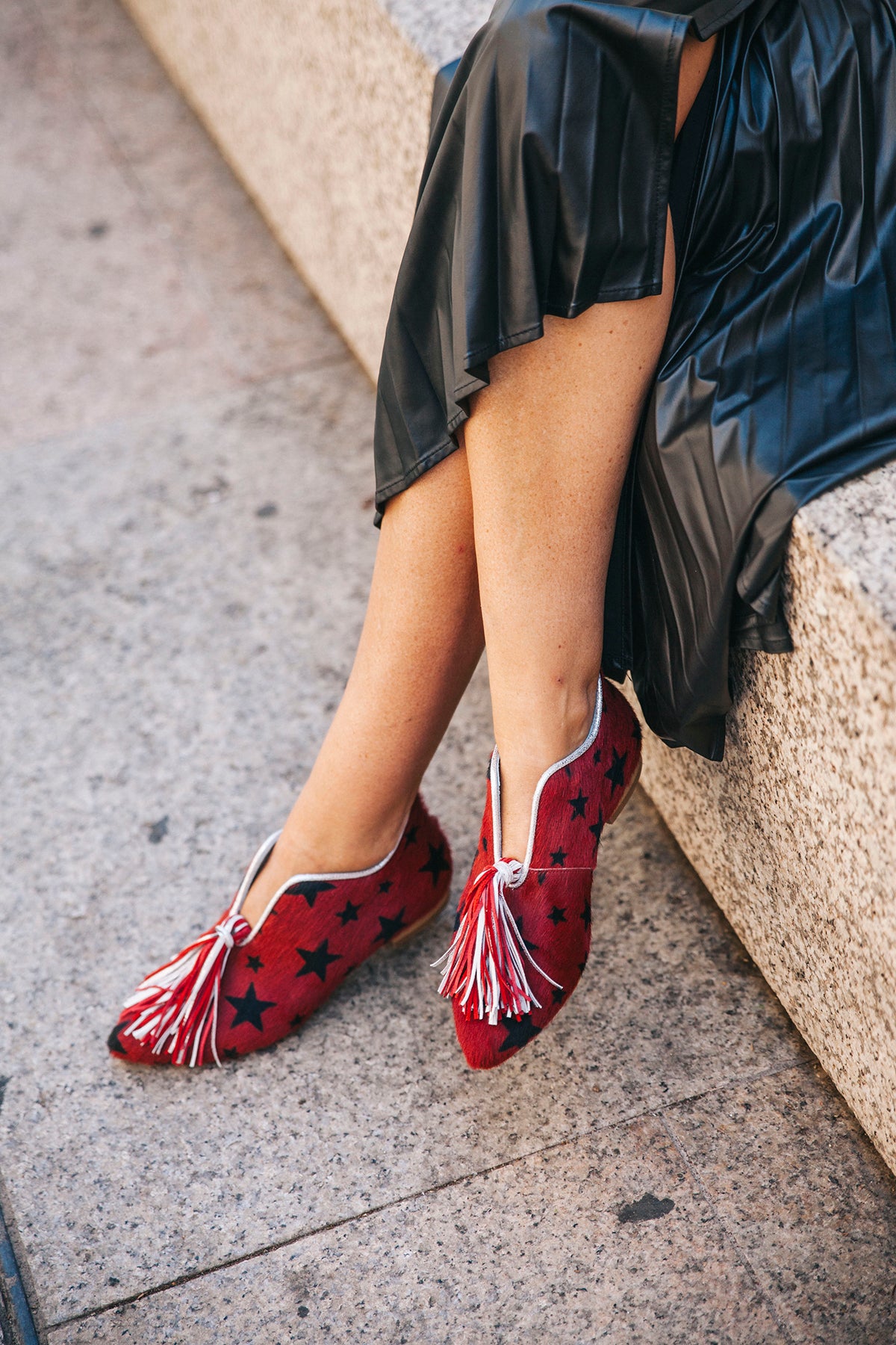 Botín de piel de pony abierto en pala con borlón de ante combinado, en rojo con estrellas pintadas a mano en negro. Diseñados y producidos de forma artesanal 100% en España. Están elaborados con materias primas de alta calidad, seleccionadas al detalle.
