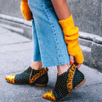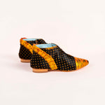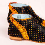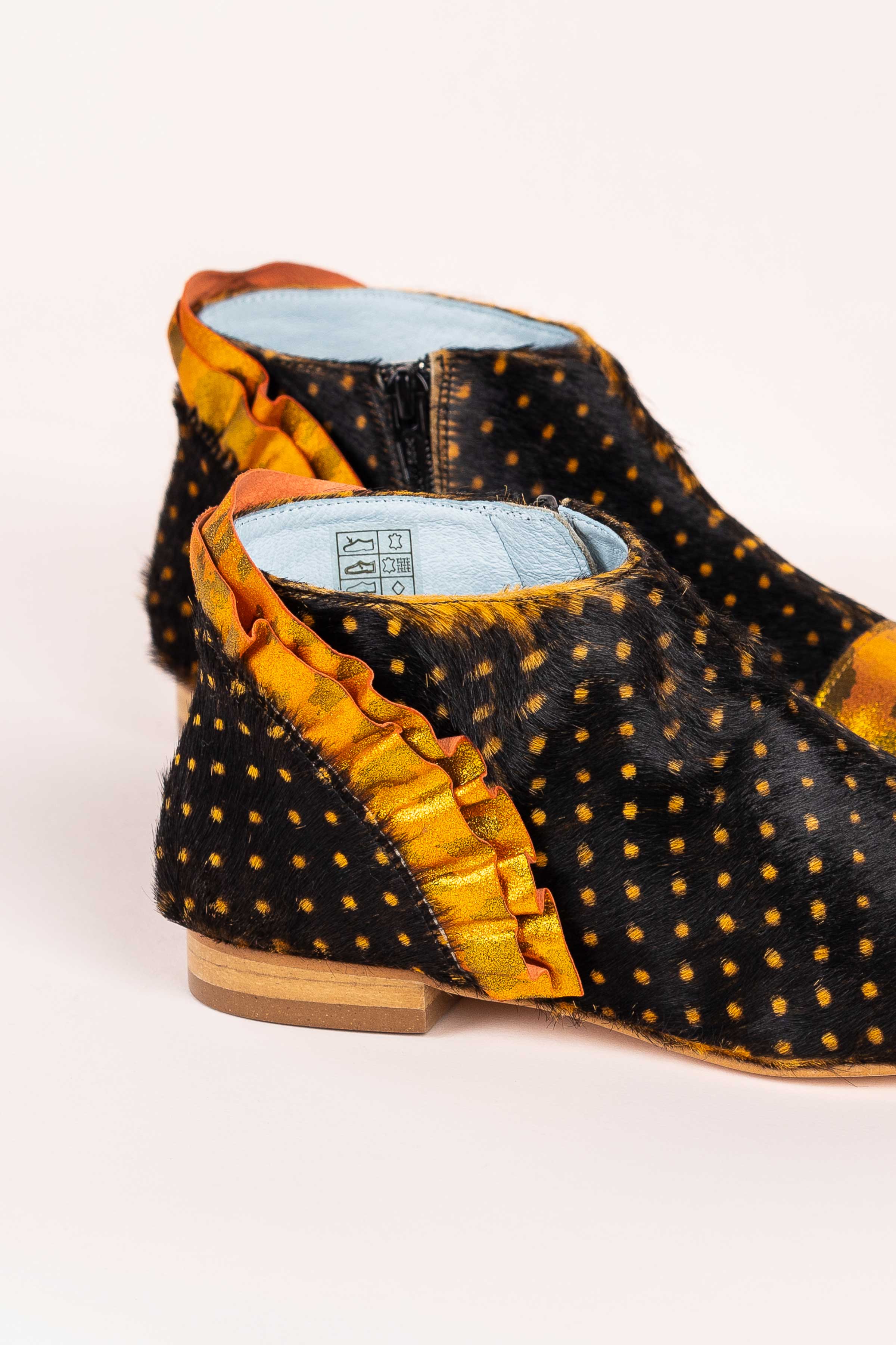 Botín plano en base de pelo negro con topos con detalles a contraste en punta y talón. Diseñados y producidos de forma artesanal 100% en España. Están elaborados con materias primas de alta calidad, seleccionadas al detalle.