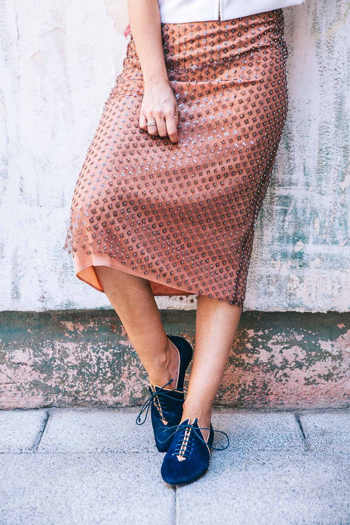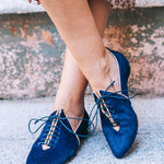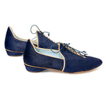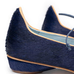 Florencia navy es un zapato de pelo pony, con cierre de cordones y diseñado con una geometría muy particular. Sus tres piezas de piel están rematadas con un ribete ocre de ante a contraste y, tanto la zona del empeine, como la del talón, se elevan dibujando una silueta muy especial. Es un zapato cerrado pero con amplia abertura lateral. Su tacón, de 2cm está forrado en el mismo material principal y presenta una particular forma de lágrima.