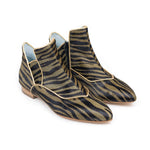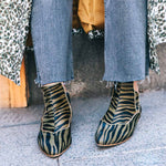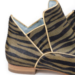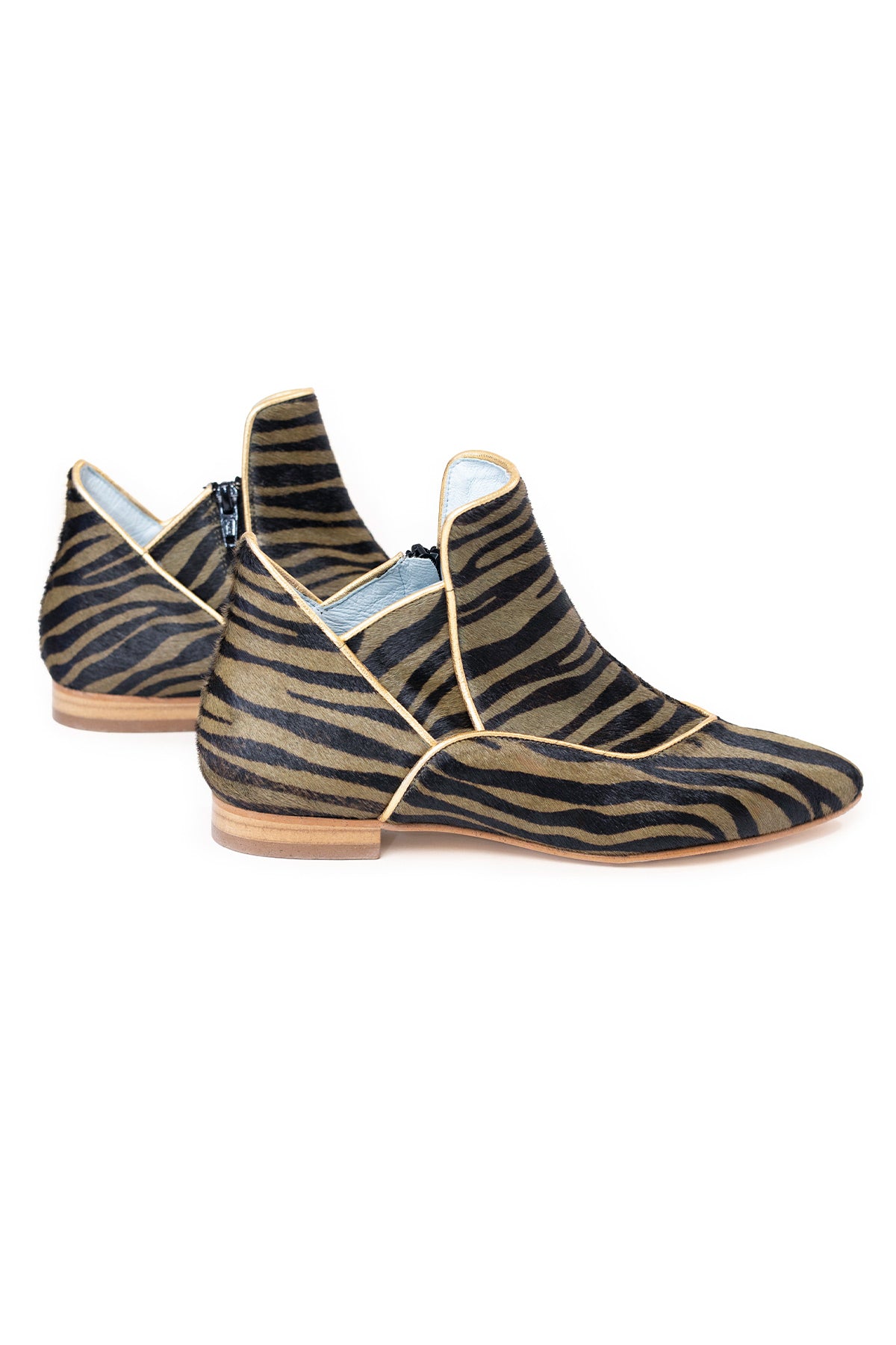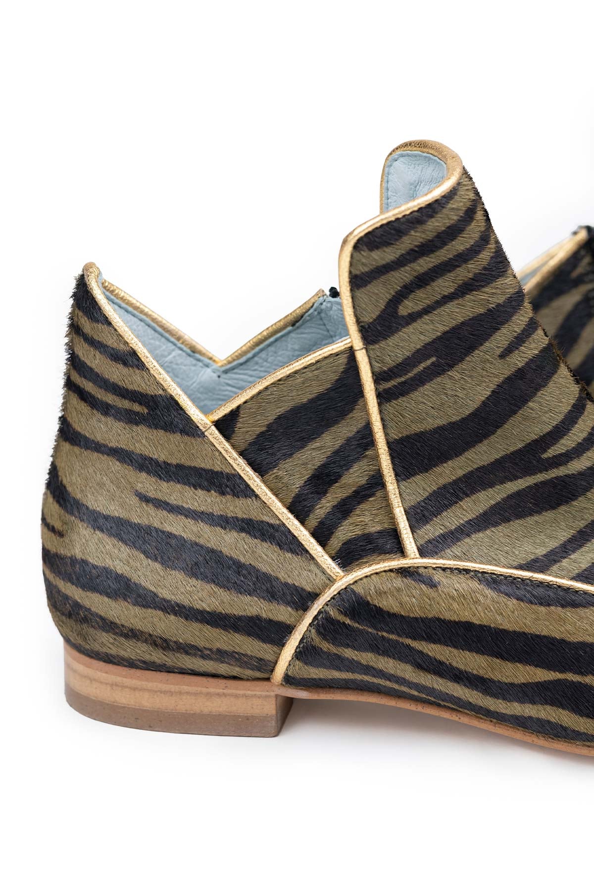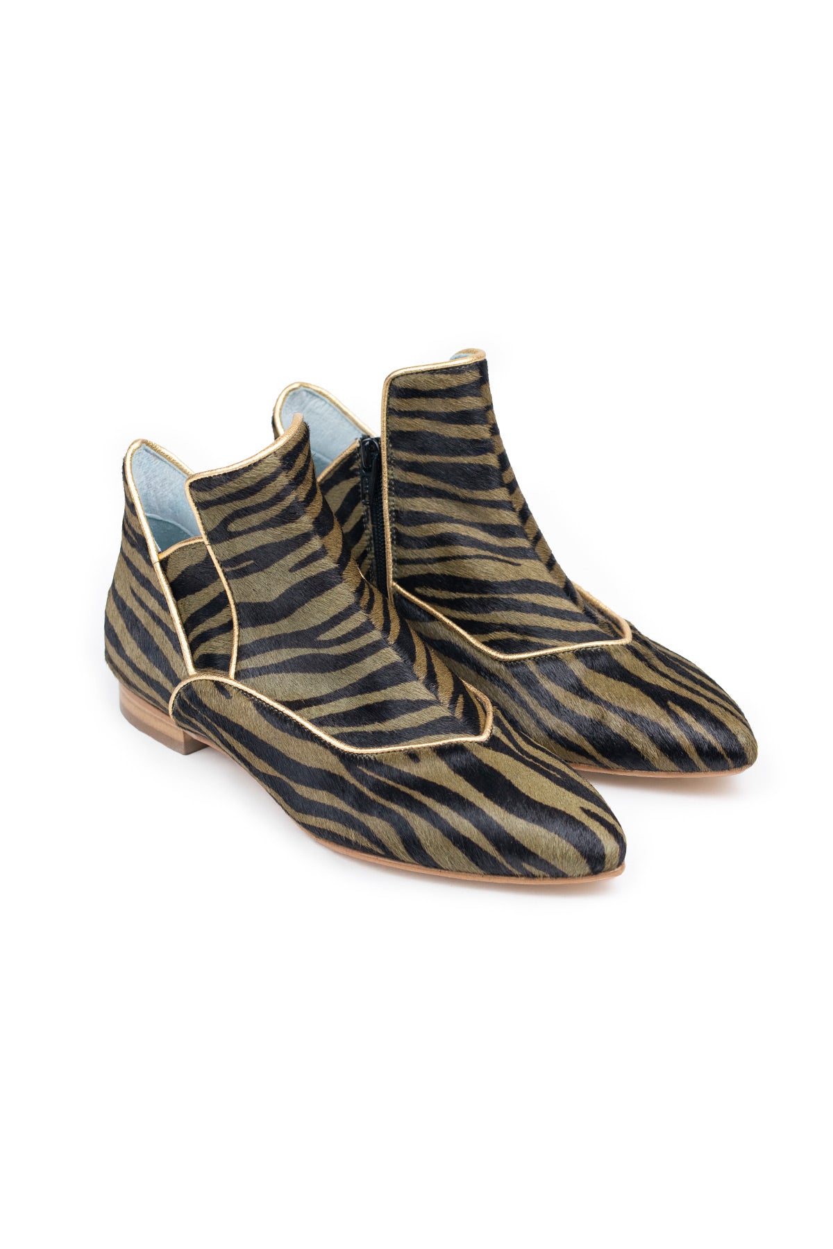 Brujas Gold es un botín de diseño original. Se estructura en varias piezas de la misma materia prima en piel animal color verde. La pieza frontal se eleva más allá del empeine para estilizar la pierna. Por dentro incorpora un forro en zigzag para mayor confort y evitar la tirantez en el empeine. Un botín exclusivo, de gran calidad