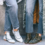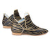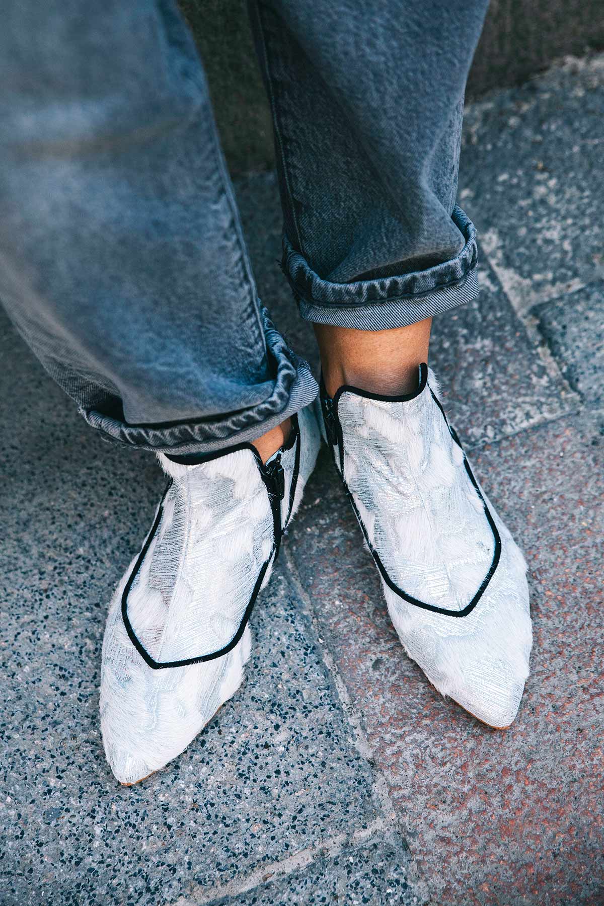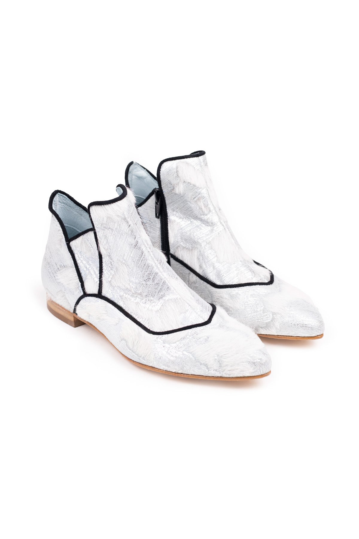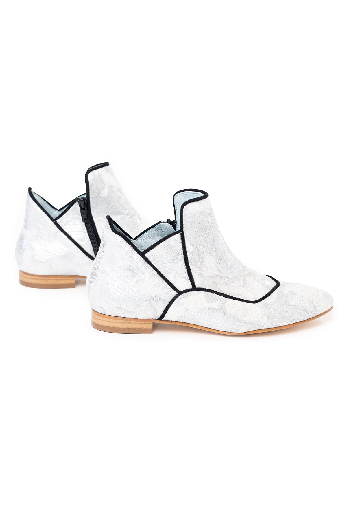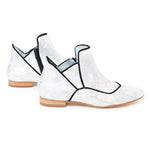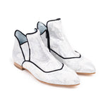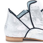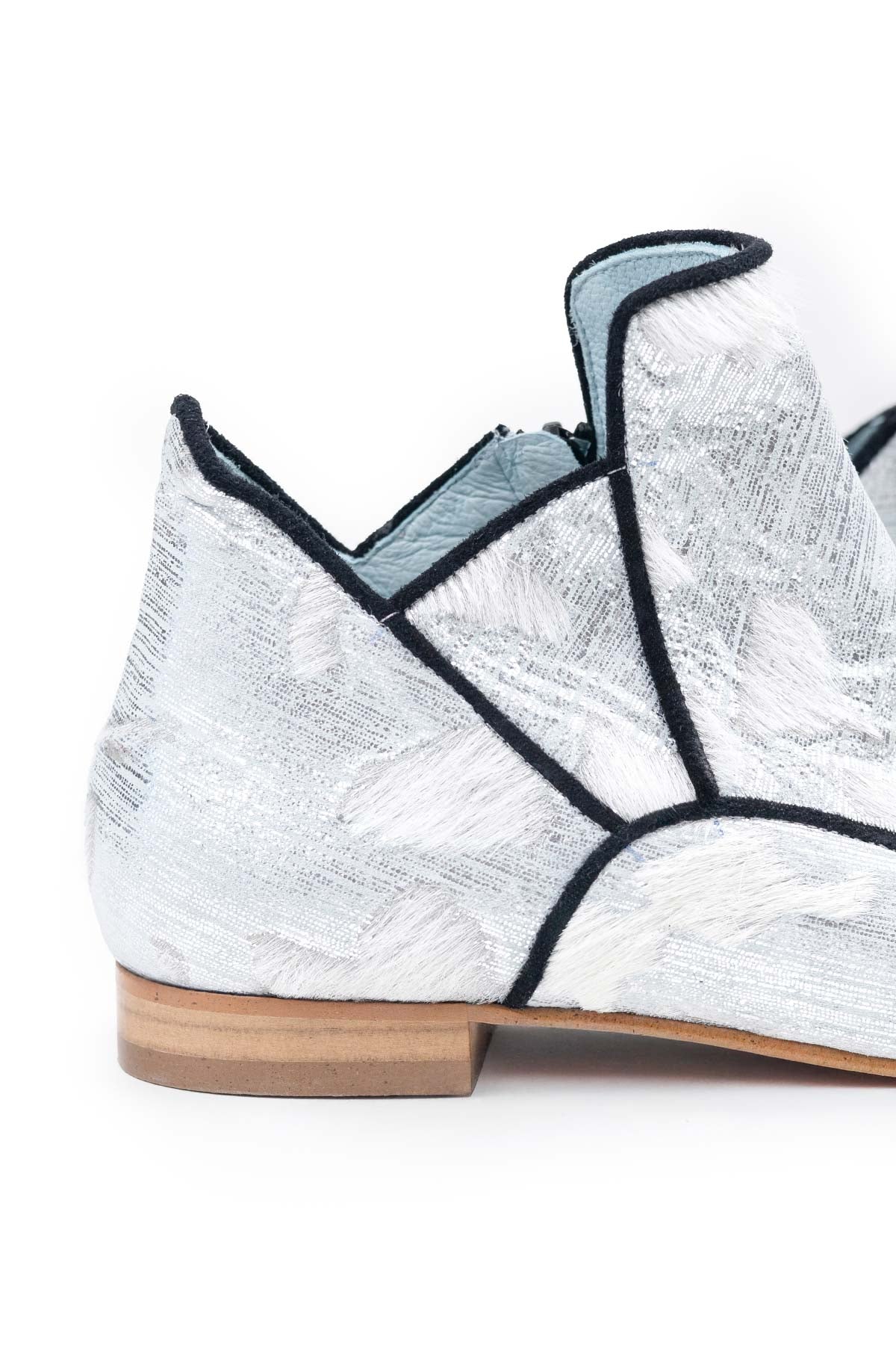 Brujas Plata es un botín de diseño original. Se estructura en varias piezas de la misma materia prima en piel, con contraste de ante en negro. La pieza frontal se eleva más allá del empeine para estilizar la pierna. Por dentro incorpora un forro en zigzag para mayor confort y evitar la tirantez en el empeine. Un botín exclusivo, de gran calidad