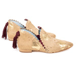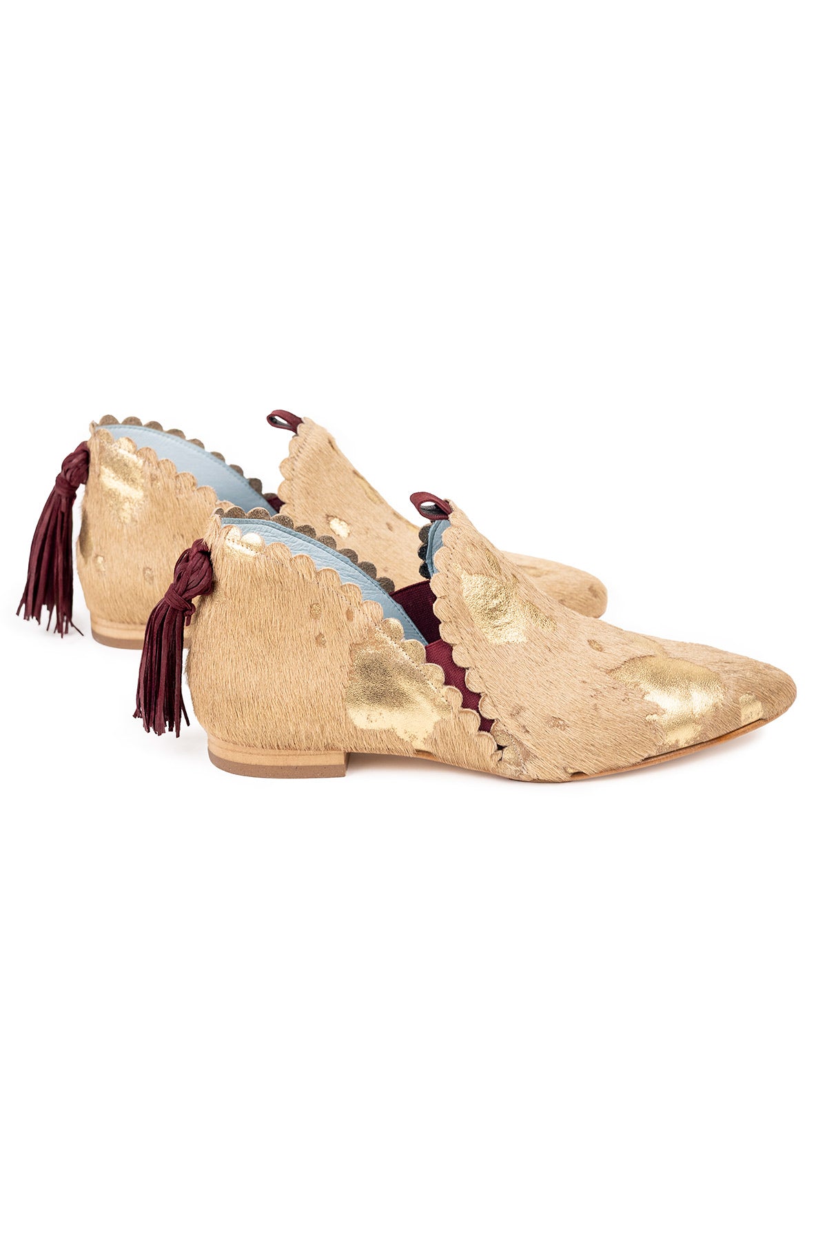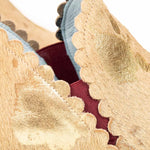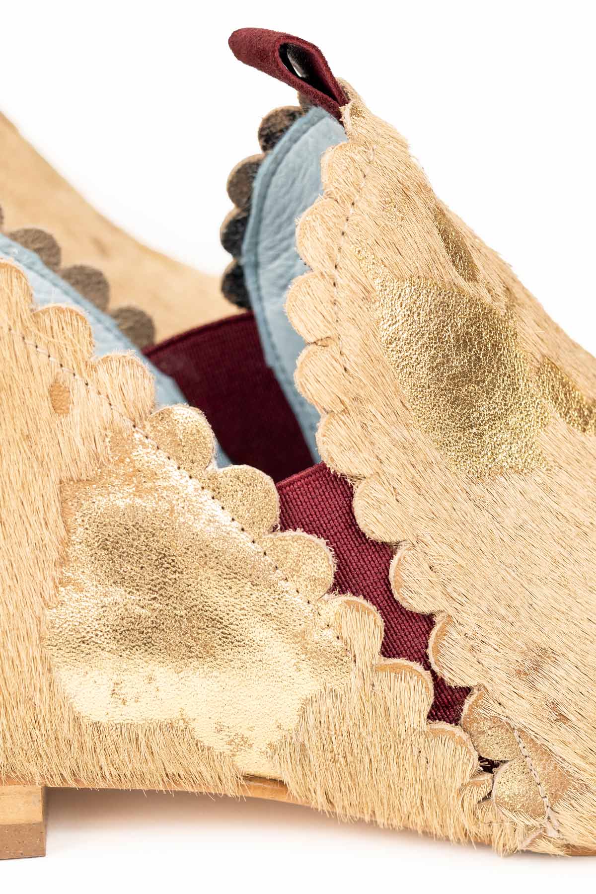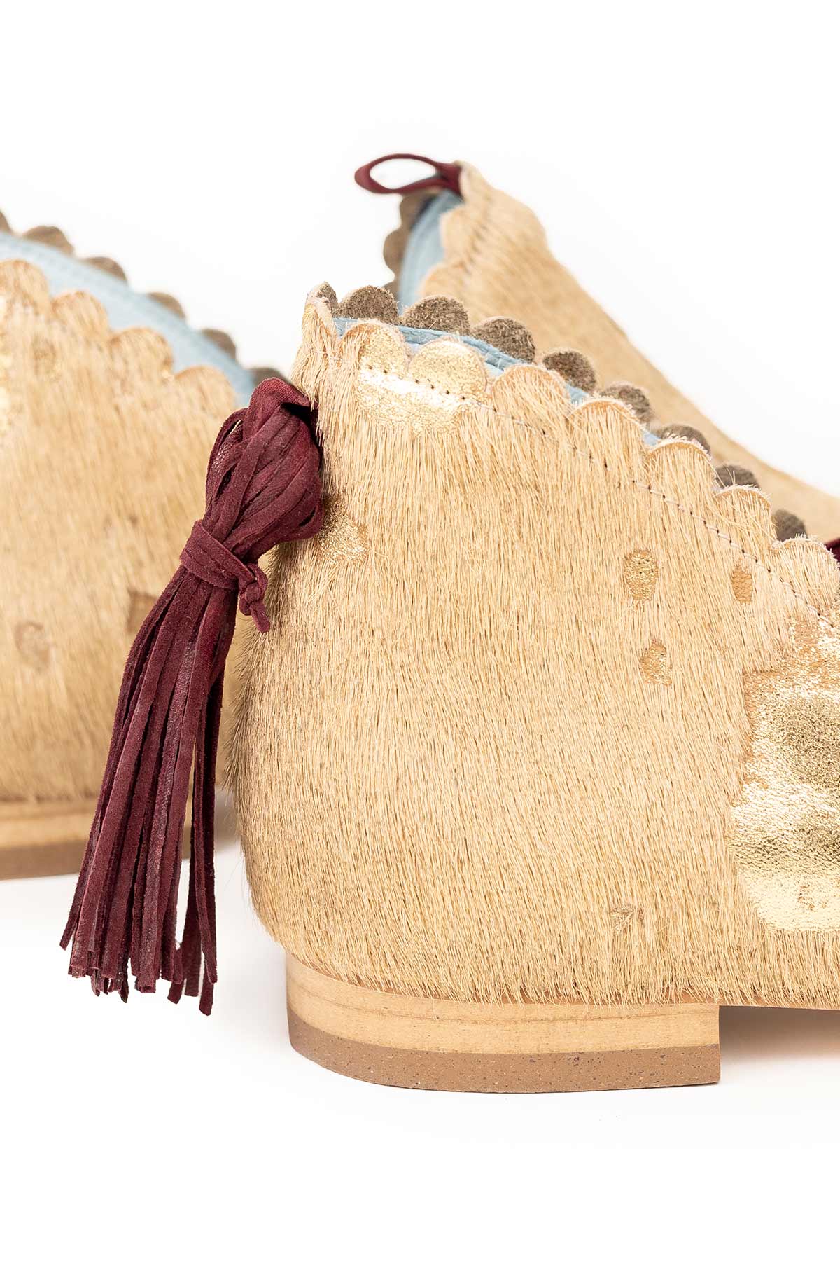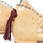 Ginebra Pony es un botín de piel beige con manchas estratégicas en dorado. Se divide en dos piezas: delantera y trasera, ambas con troquel, y en su unión tiene una separación que marca las aberturas aberturas laterales que le confieren un diseño muy especial. Tiene ajuste con gomas y un detalle que las hace auténticas: un borlón trasero de ante granate.