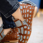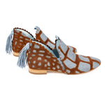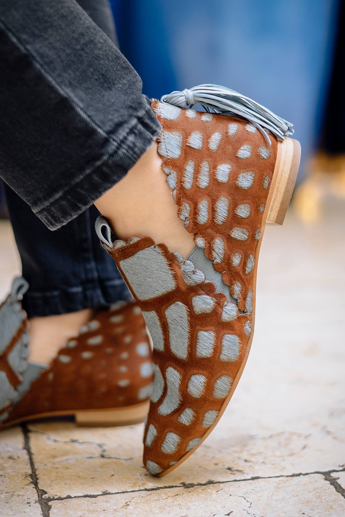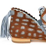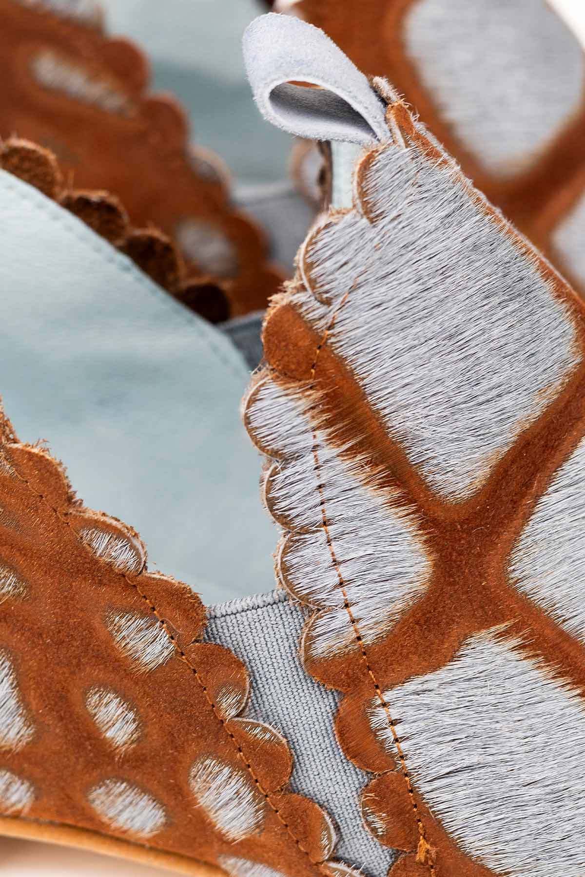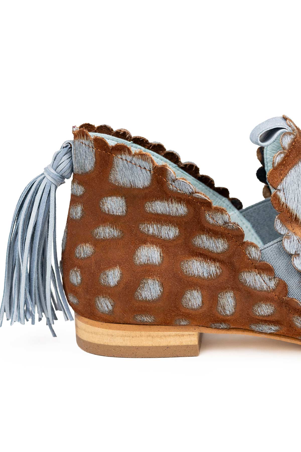 Ginebra Tostado es un botín de piel de potro en azul y marrón, una combinación única con una textura que recuerda a las manchas de una jirafa. Se divide en dos piezas: delantera y trasera, ambas con troquel, y en su unión tiene una separación que marca las aberturas aberturas laterales que le confieren un diseño muy especial. Tiene ajuste con gomas y un detalle que las hace auténticas: un borlón trasero de ante en el azul empolvado.