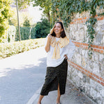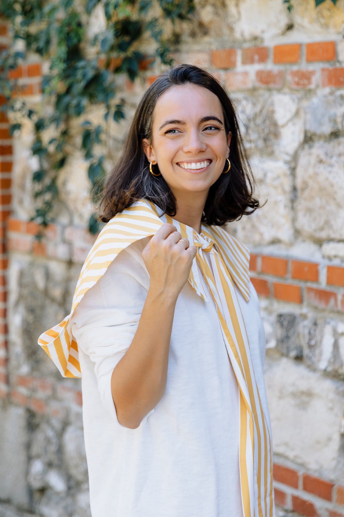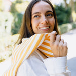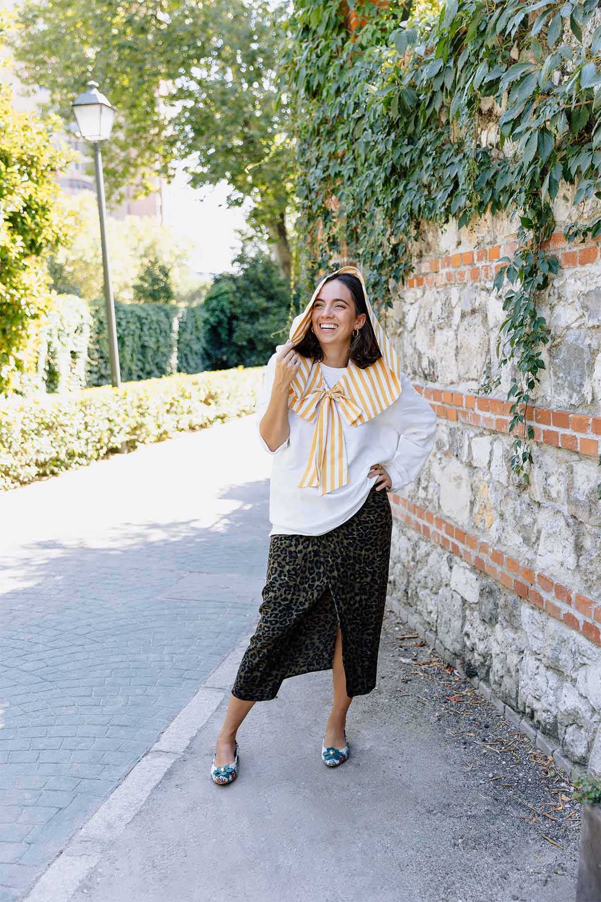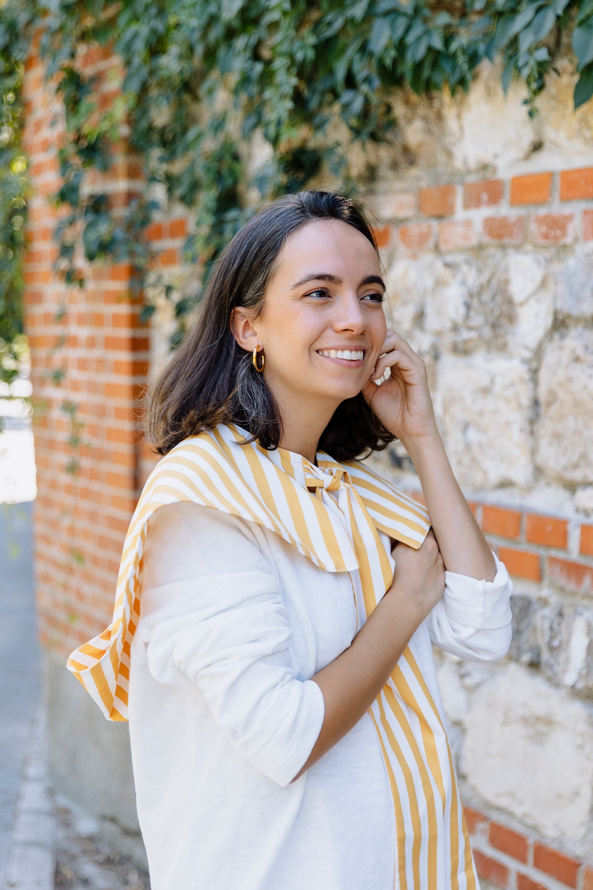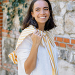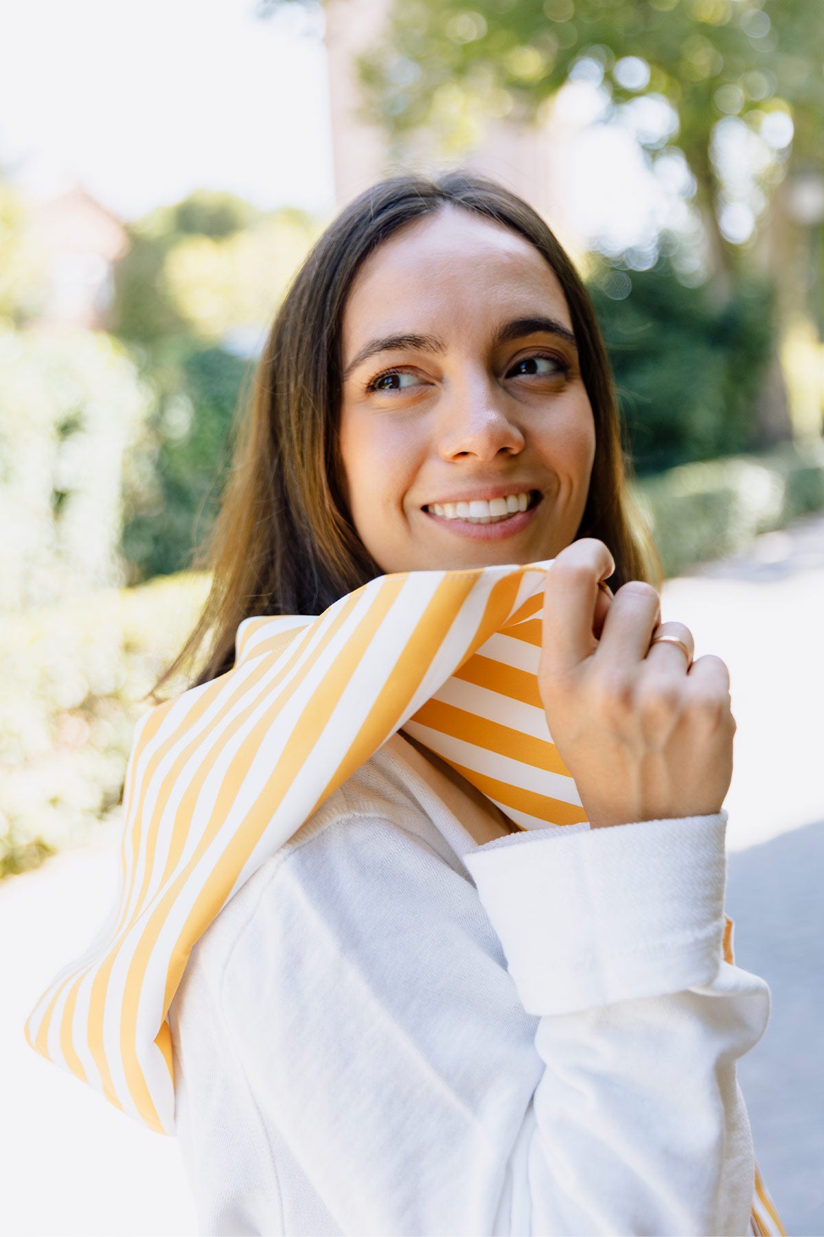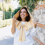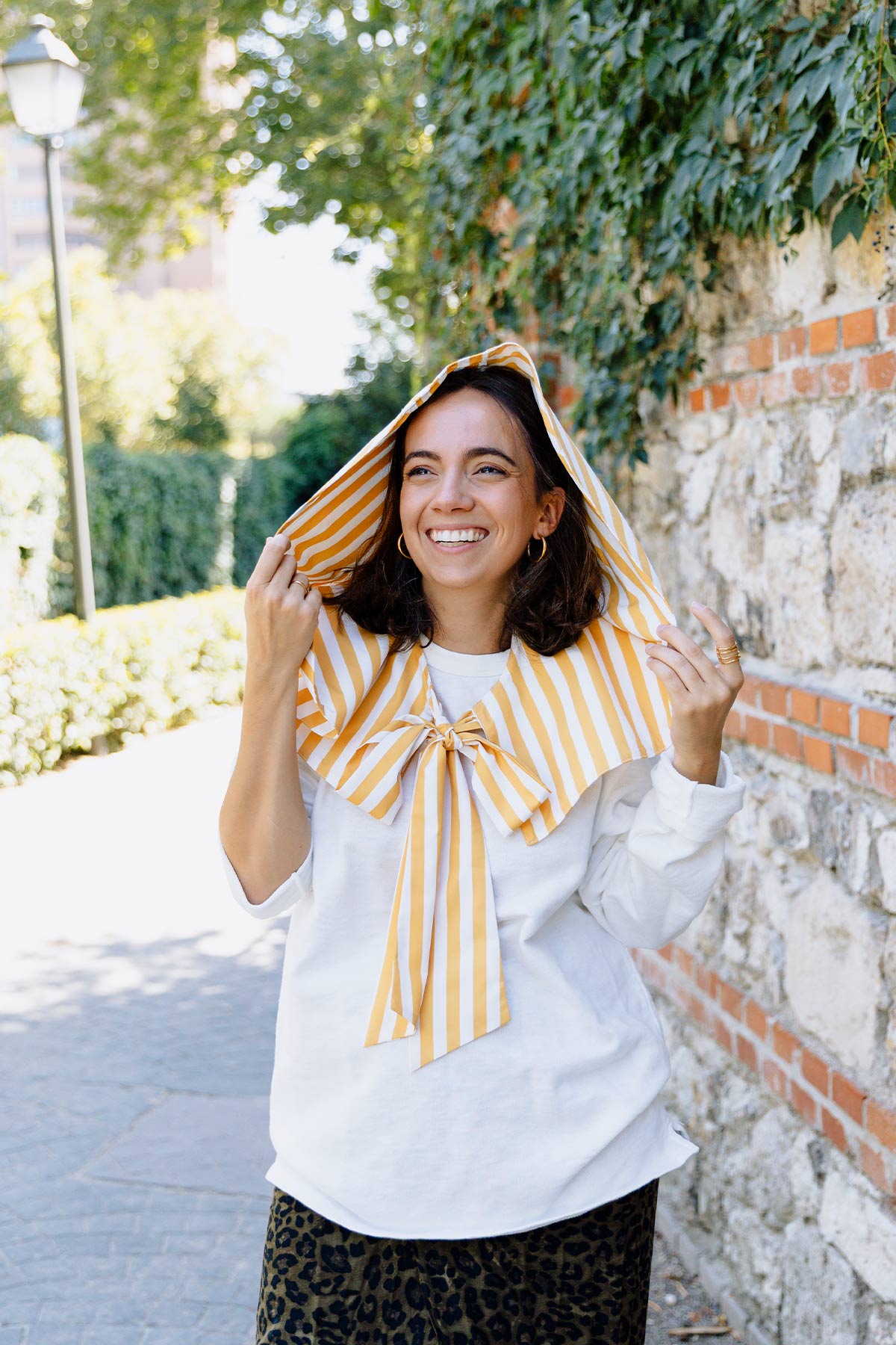 Maxi capucha diseñada y confeccionada 100% en nuestros talleres de España. Está elaborada con tejido de raso con estampado de rayas amarillas y blancas y soportada en sarga. Presenta un maxi lazo como cierre. Es el accesorio ideal para dar un toque original a tus looks de temporada.