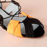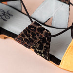 Sandalia plana combinando diferentes materiales: terciopelo de seda, seda flocada y glitter.