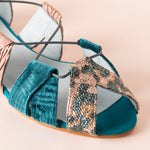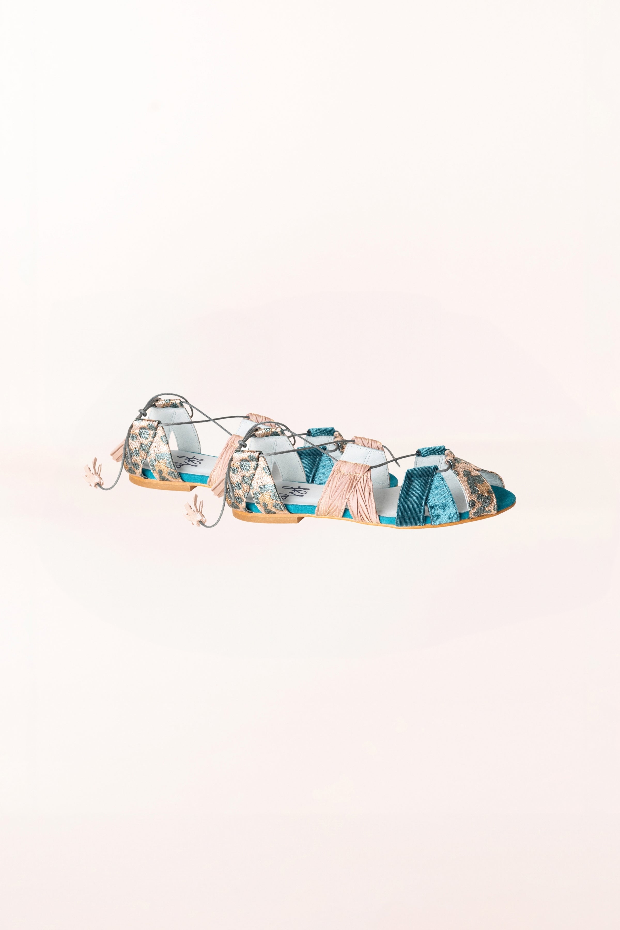 Sandalia plana combinando diferentes materiales: terciopelo de seda, seda flocada y glitter.