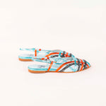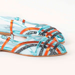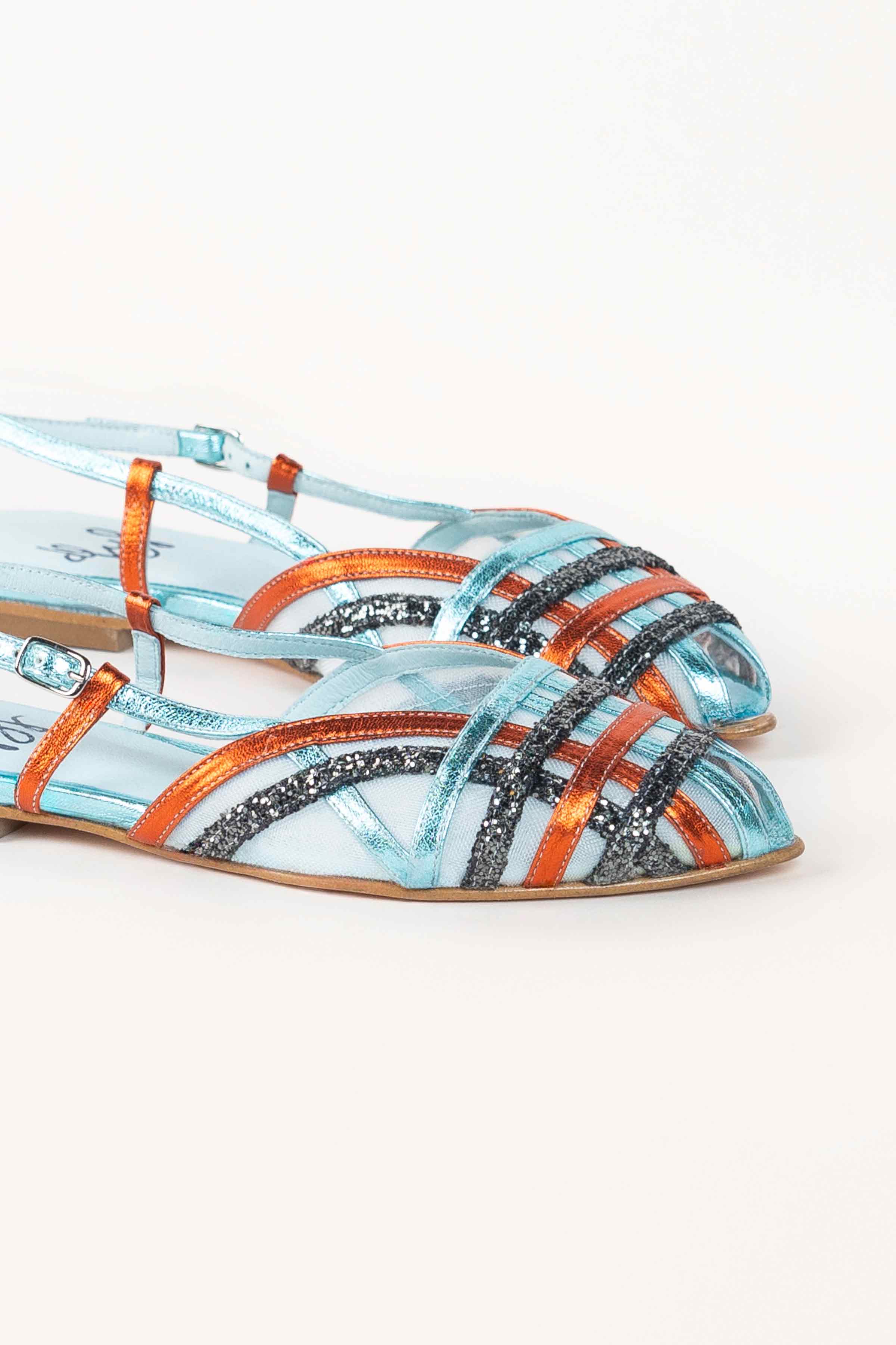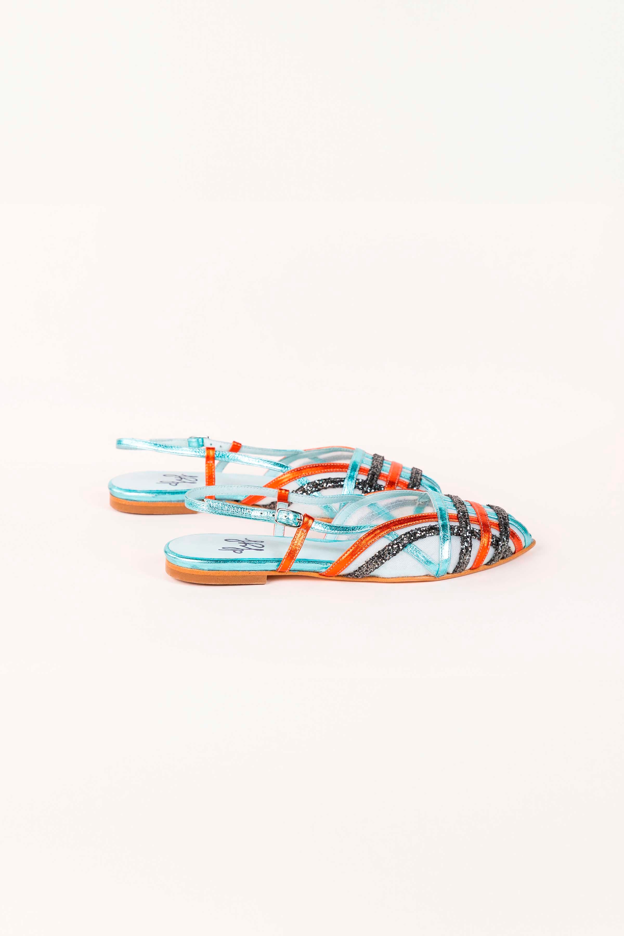 Cangrejera con tiras cruzadas en piel y glitter con un Interior de piel azul celeste. Modelo exclusivo de defloresyfloreros, diseñado y fabricado en España.
