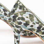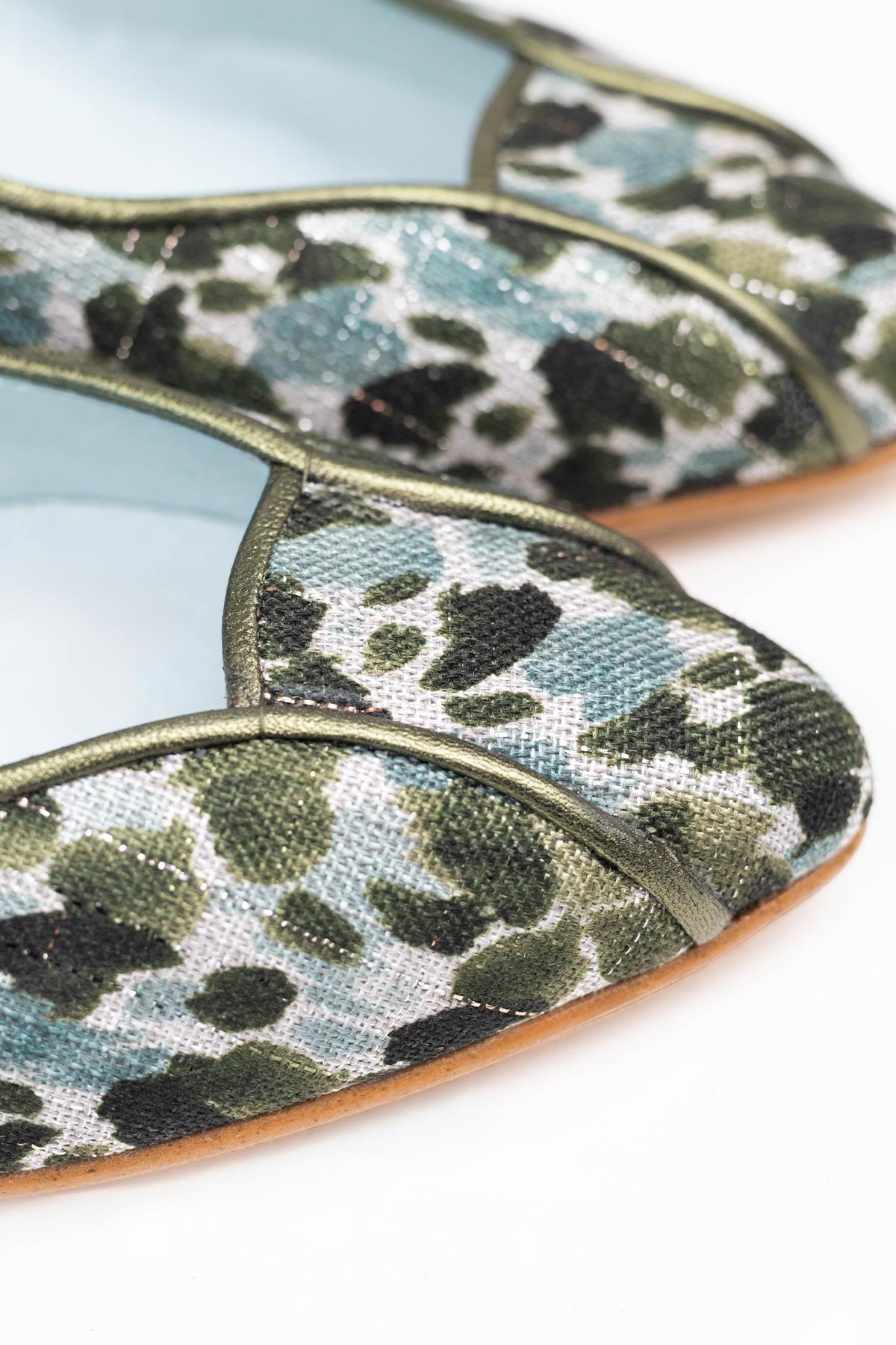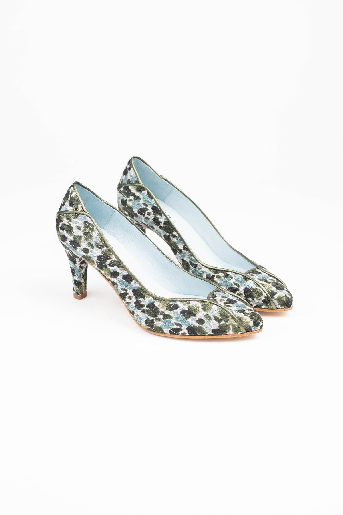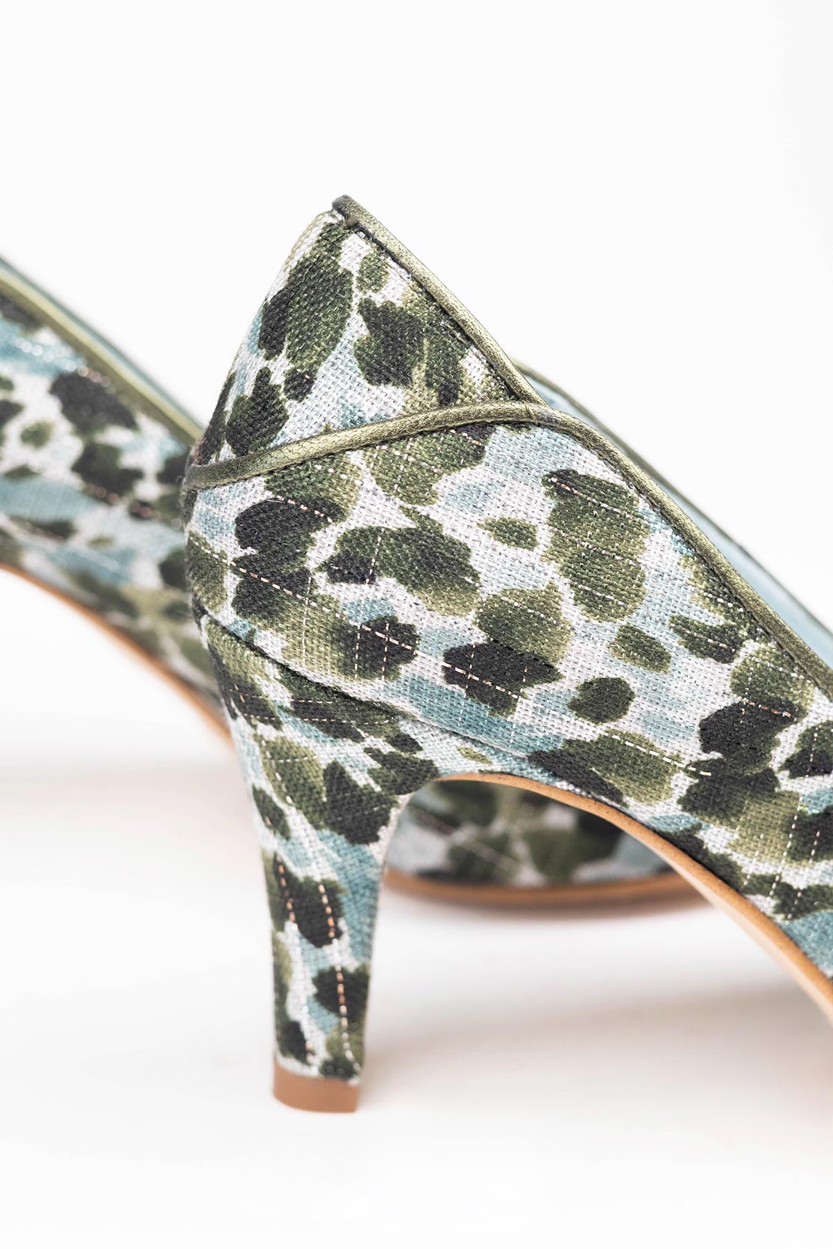 Munich Caza es un clásico salón en arpillera estampada en tonos verdes. Este diseño presenta cuatro piezas muy bien diferenciadas: puntera, laterales y talonera, todos divididos por ribetes de piel tornasoalda, que le confieren una línea muy elegante y una trasera distinguida.