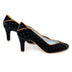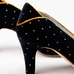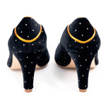 Munich Natrón es una joya de la corona. Un salón clásico en terciopelo negro de seda con aplicaciones de plata. Este diseño presenta cuatro piezas muy bien diferenciadas: puntera, laterales y talonera, todos divididos por ribetes en piel tornasolada, que le confieren una línea muy elegante y una trasera distinguida.