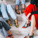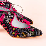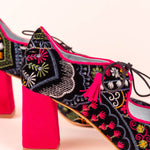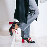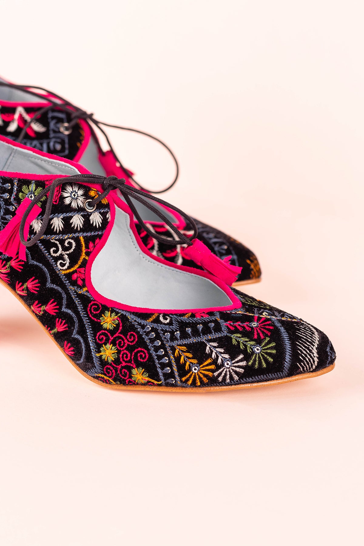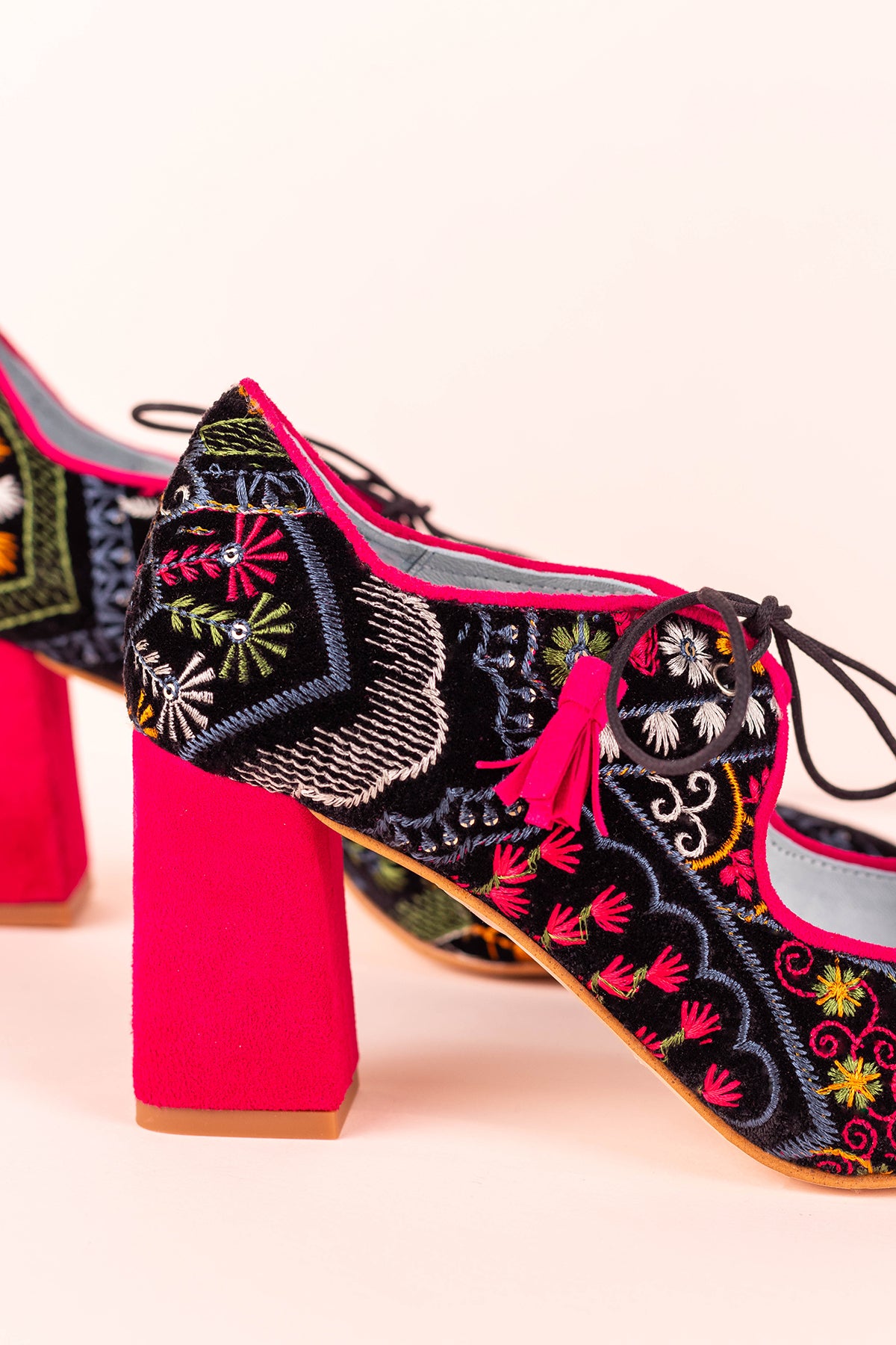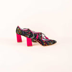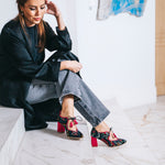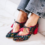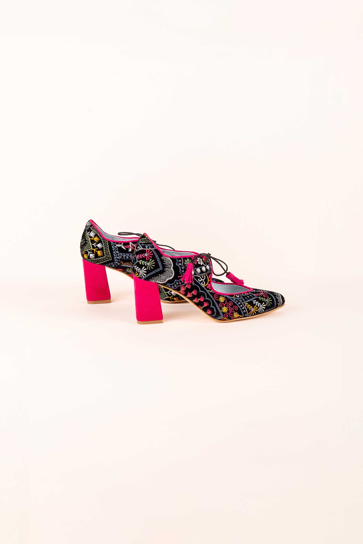 Tacón de 6 cm de altura en tejido y tacón cuadrado. INTERIOR DE PIEL CELESTE. Made in Spain. Todos nuestros modelos poseen una cuña interna de 1,5 cm. Interior 100% piel. Suela de cuero. Modelo exclusivo de Defloresyfloreros, diseñado y fabricado en España.