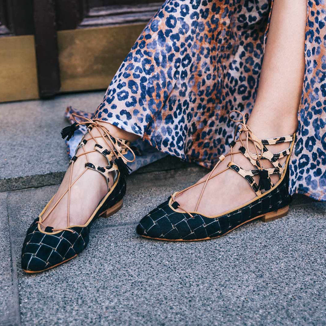 Dublín Black es un modelo semi-botín que recoge el tobillo con una pieza de piel animal print y va atado en la zona delantera, con un cordón de algodón rematado en borlas. Dublín favorece la silueta del pie por su gran escote delantero y por la pieza del tobillo, con múltiples calados cortados de forma manual, con bisturí, que recoge sin acortar. Una de sus claves es el ribete ocre, cosido con precisión y que hace que el zapato favorezca a cualquier tono de piel. El tejido es pelo de potro.