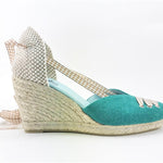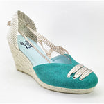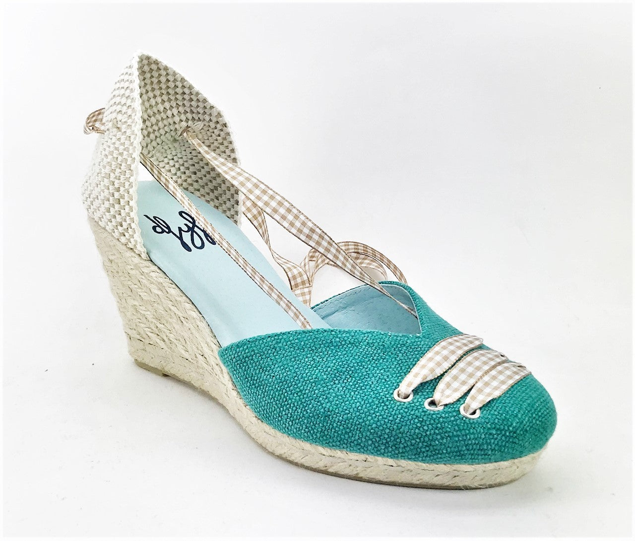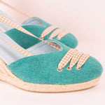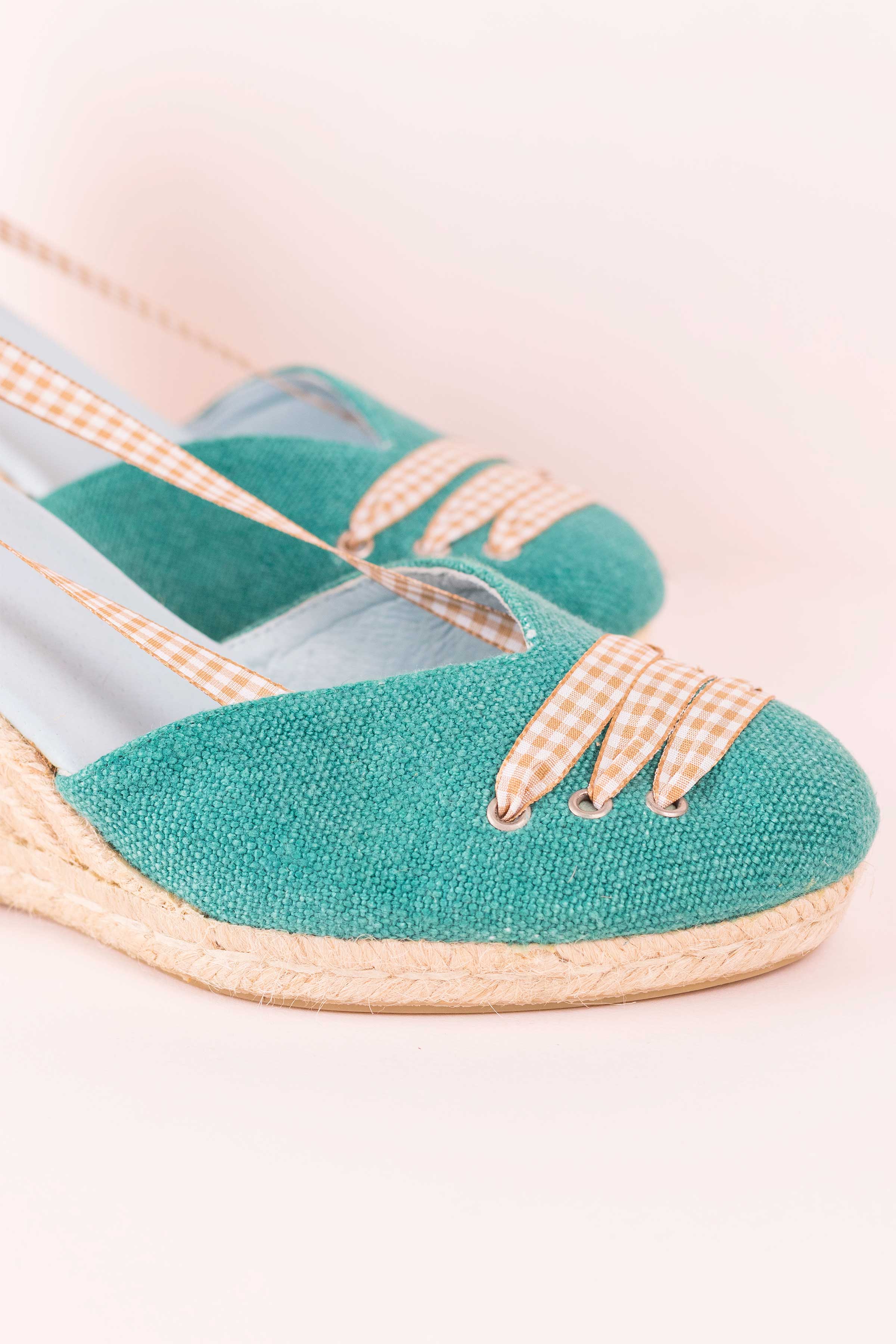 Alpargata de yute de 6 cuerdas de altura (8cm) con pala en algodón y cuña de rafia cosida a mano. Lazo de terciopelo en azul marino. Interior de piel azul celeste acolchado. Suela forrada en piso en goma. Modelo en exclusiva de defloresyfloreros, diseñado y fabricado en España.