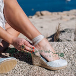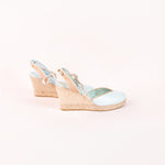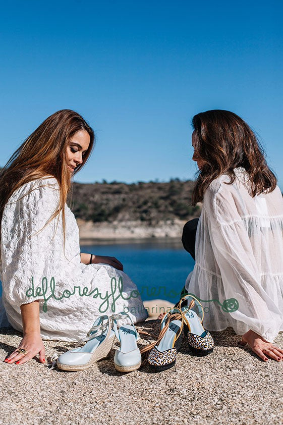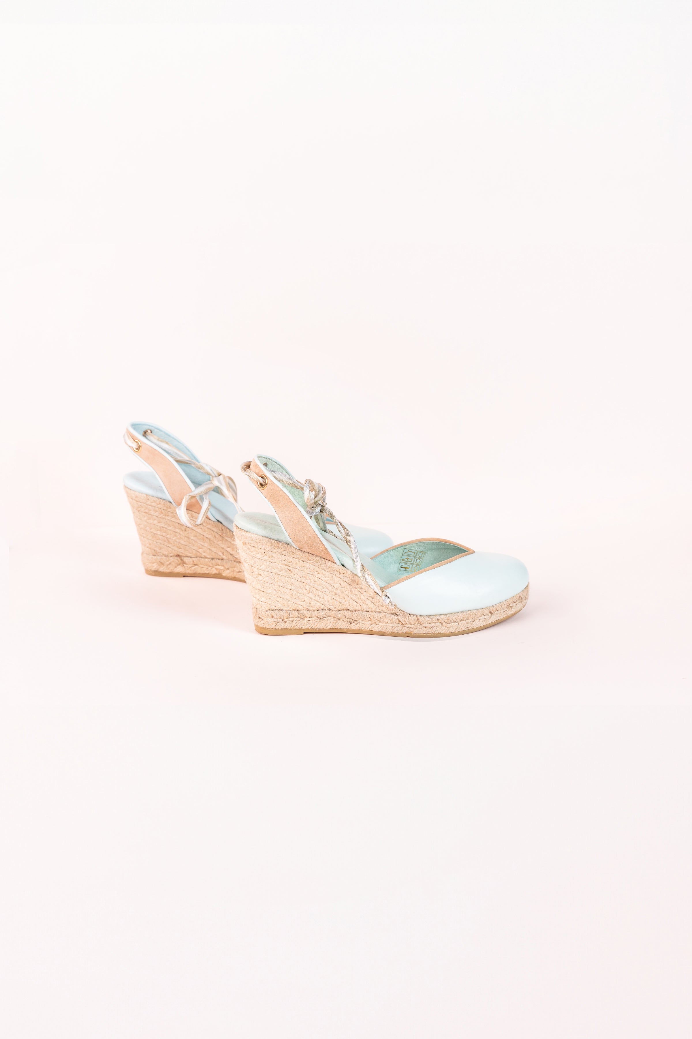 Cuña de yute en napa brillante en tono cielo y ribete en ante color crema. Cinta de pasamanería que se ata en el tobillo. Made in Spain. Todos nuestros modelos poseen una cuña interna de 1,5 cm. Interior 100% piel. Modelo exclusivo de Defloresyfloreros, diseñado y fabricado en España.