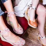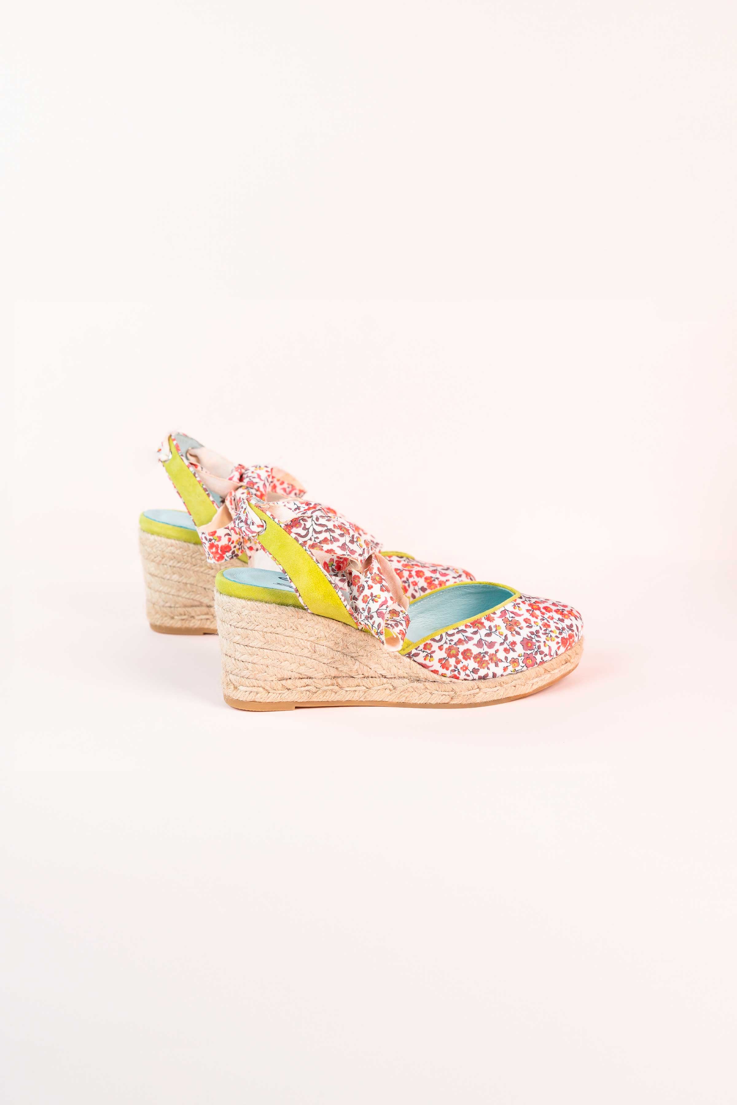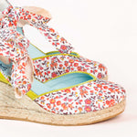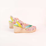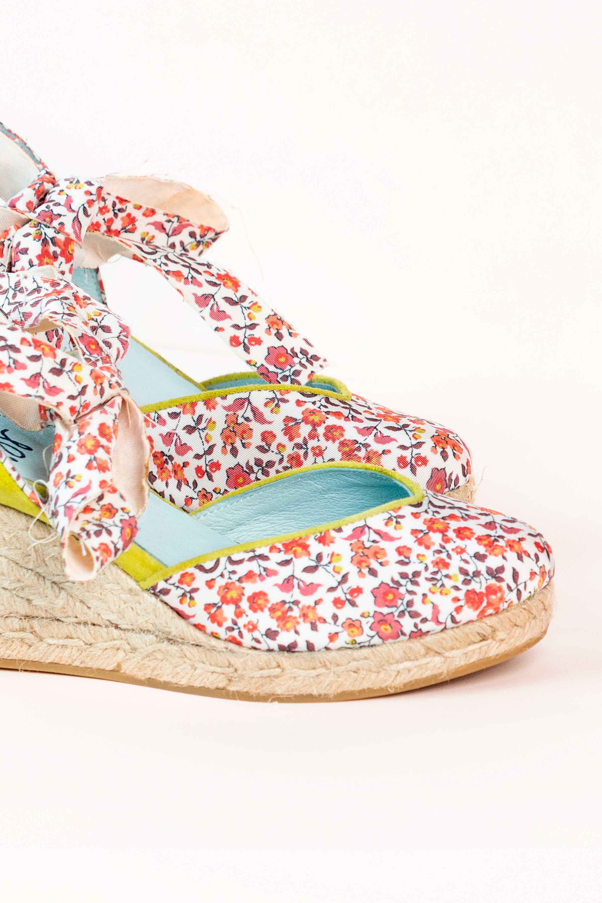 Cuña de yute de 5 cuerdas con 5 cm de alto, con punta de 100% algodón personalizado. Interior de piel. Cordón de cinta 'Made in Spain'. Interior 100% piel. Suela de cuero. Modelo exclusivo de defloresyfloreros, diseñado y fabricado en España.