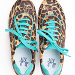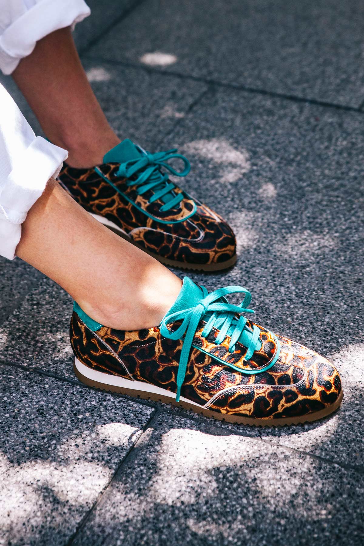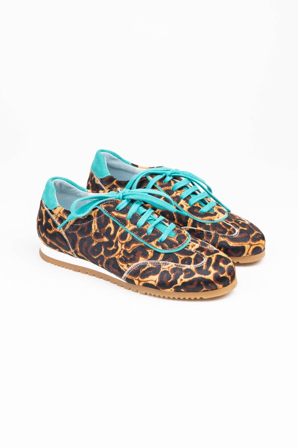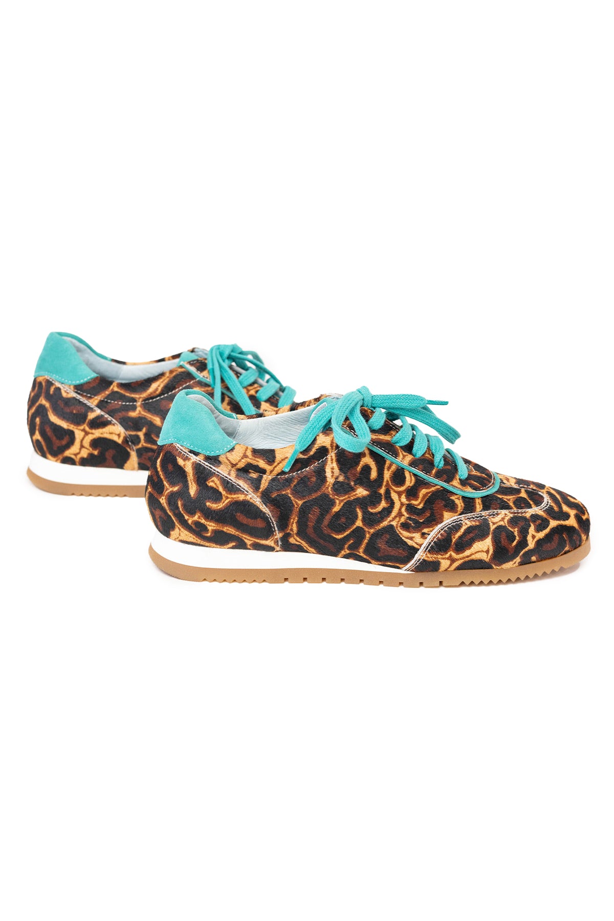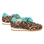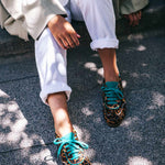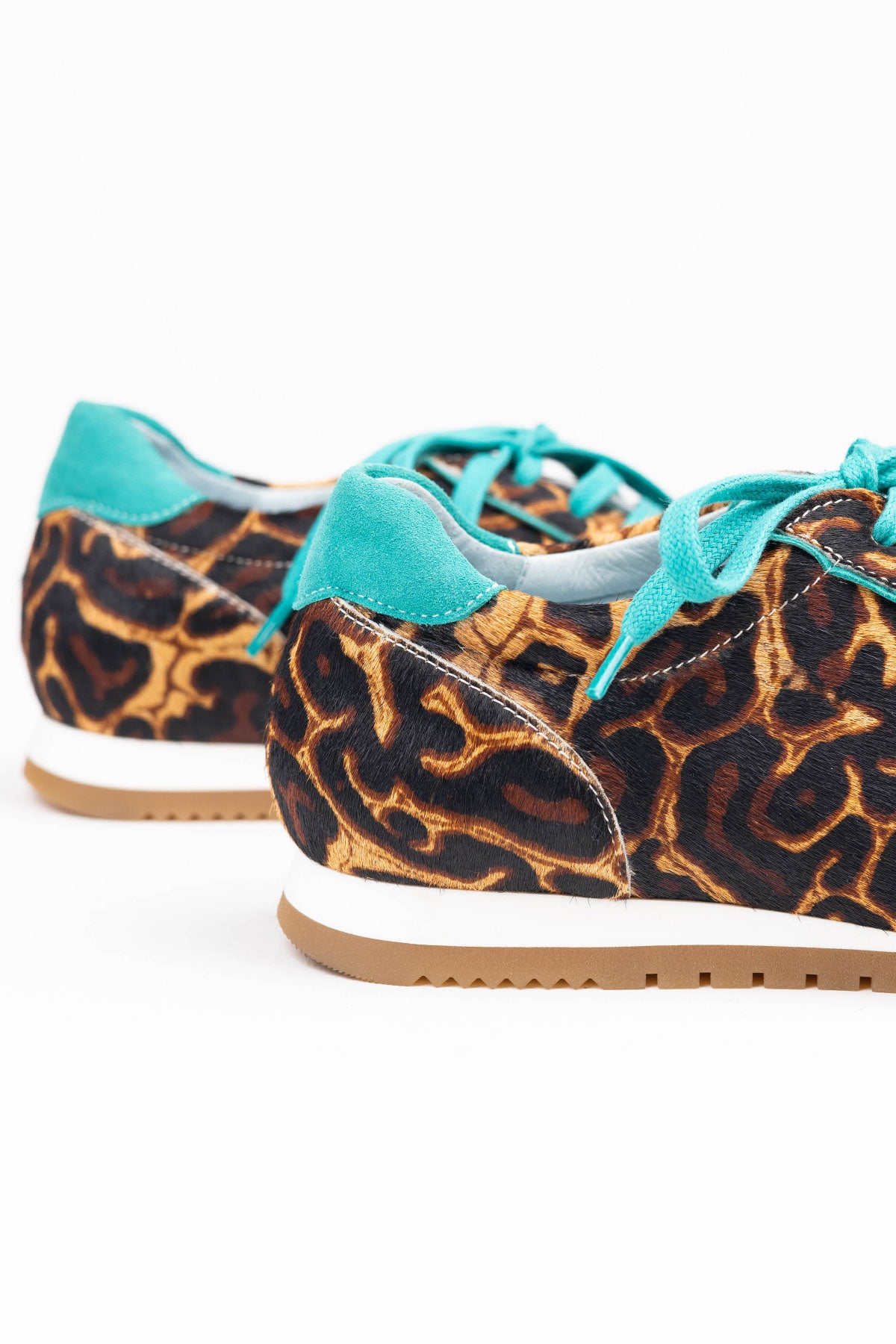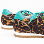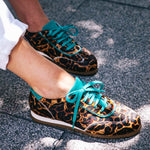 Der Running Bucarest wird handgefertigt und besteht außen aus nur 8 verschiedenen Teilen. Er kommt mit einer herausnehmbaren, noch gepolsterten Innensohle und einem kleinen, innenliegenden Keil, der nicht sichtbar ist, für ein super komfortables Erlebnis. Bucarest Turquesa ist ein Modell mit Premium-Finish, mit Zunge, Schnürsenkeln, Ferse und Kragen aus grünem Leder, im Kontrast zum Hauptprint. Die Nähte werden besonders sorgfältig verarbeitet.