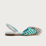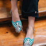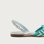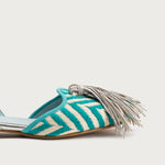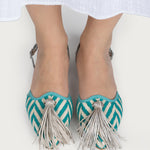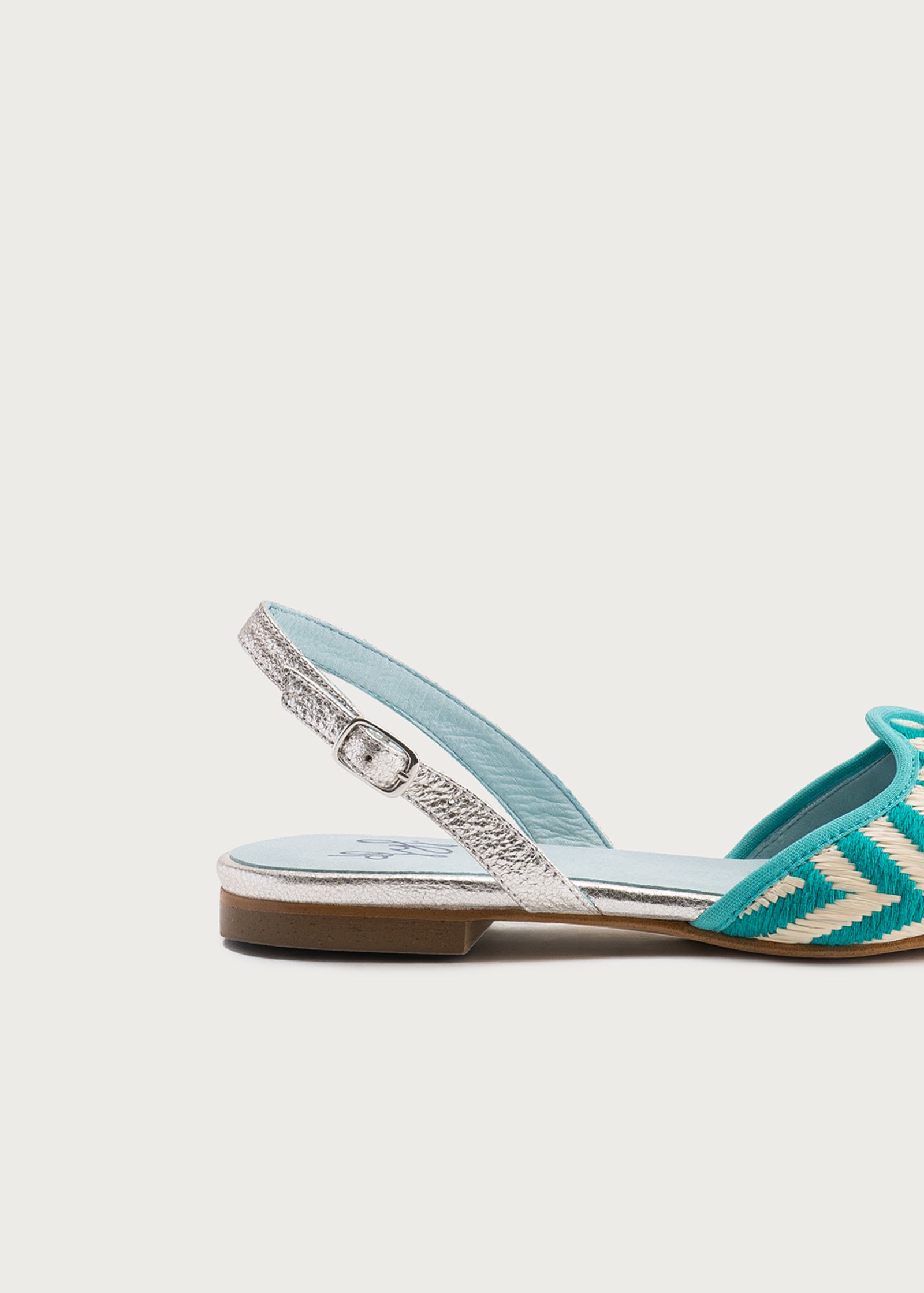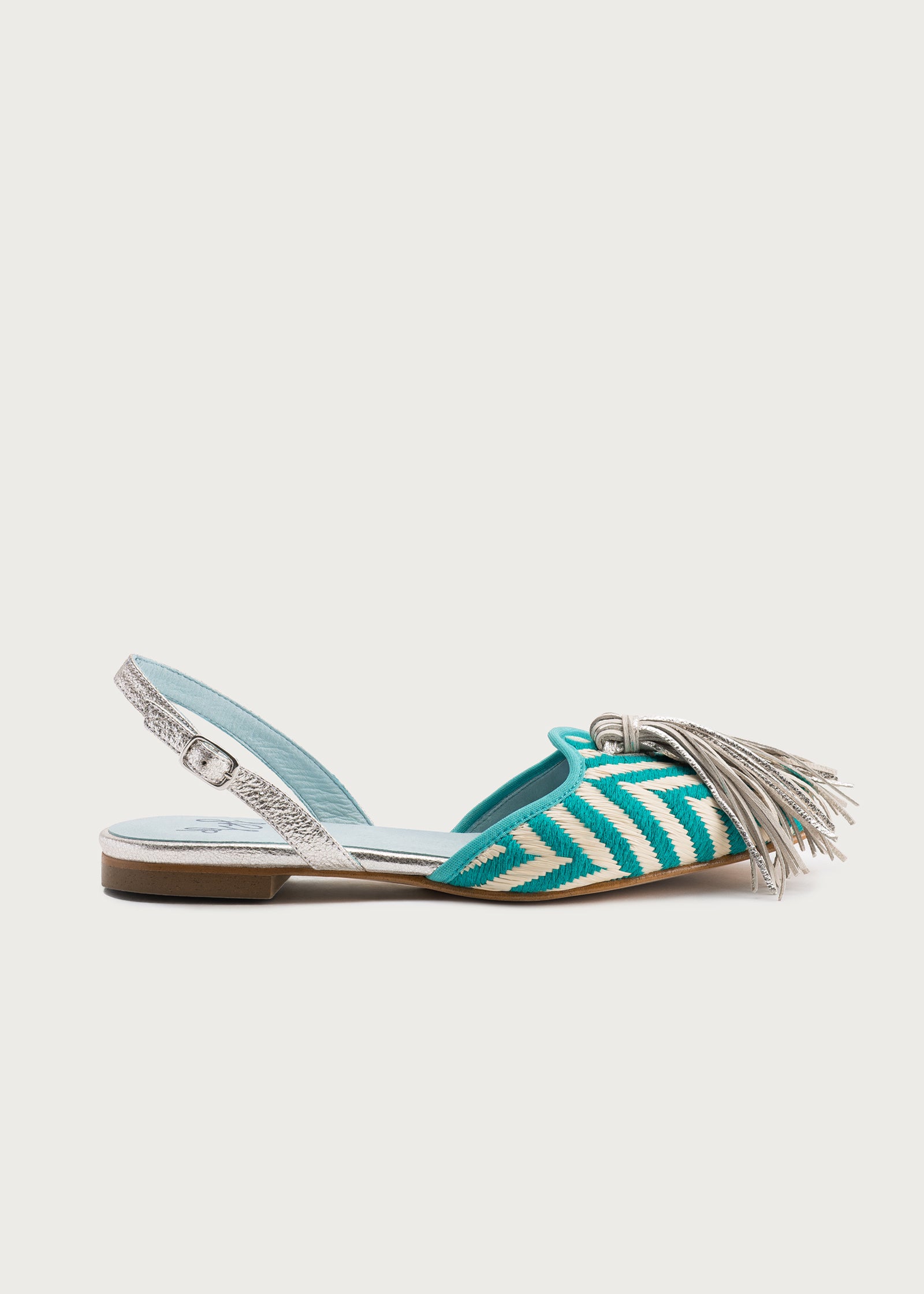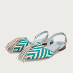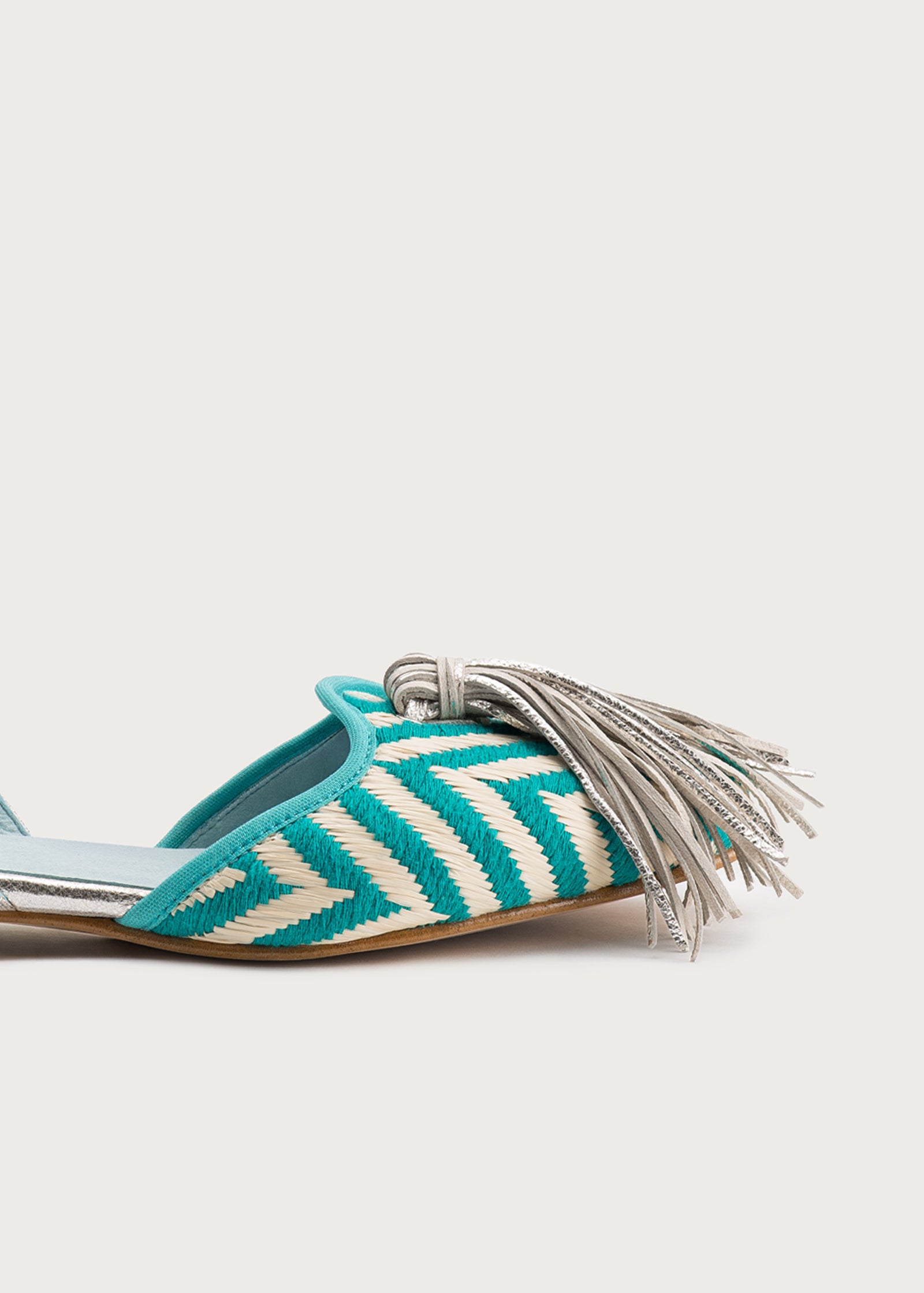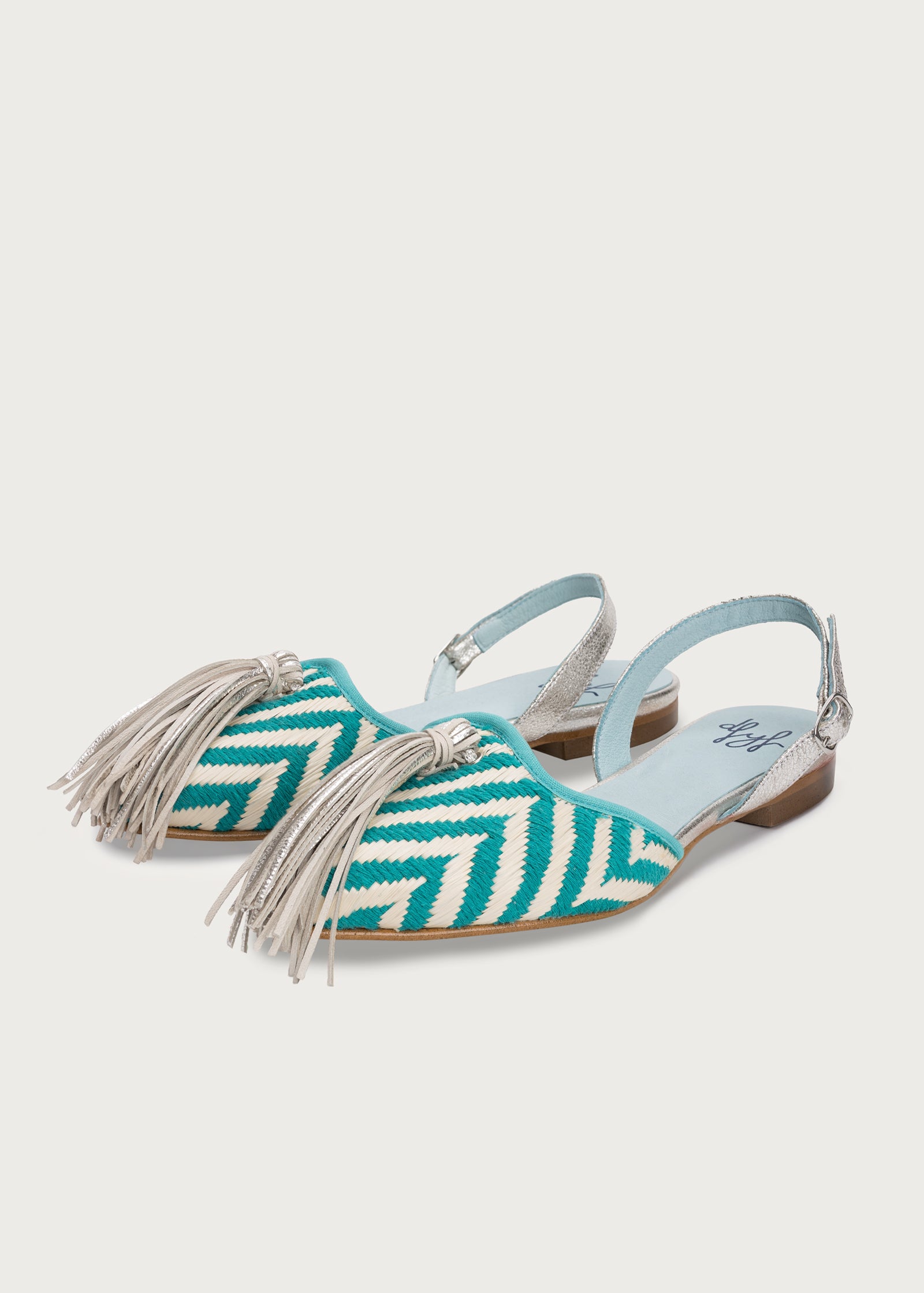 Die geschlossene Vorderseite besticht durch das Gewebe im Zickzackmuster und die dekorative Quaste am Spann, ein Detail, das Persönlichkeit und Bewegung verleiht. Die offene Rückseite verfügt über einen verstellbaren Riemen mit goldfarbener Metallschnalle, der Ästhetik und Funktionalität ausbalanciert. Ein vielseitiges und strahlendes Modell, perfekt für die Begleitung der Sommertage aus der SS26-Kollektion von Defloresyfloreros.