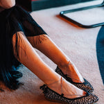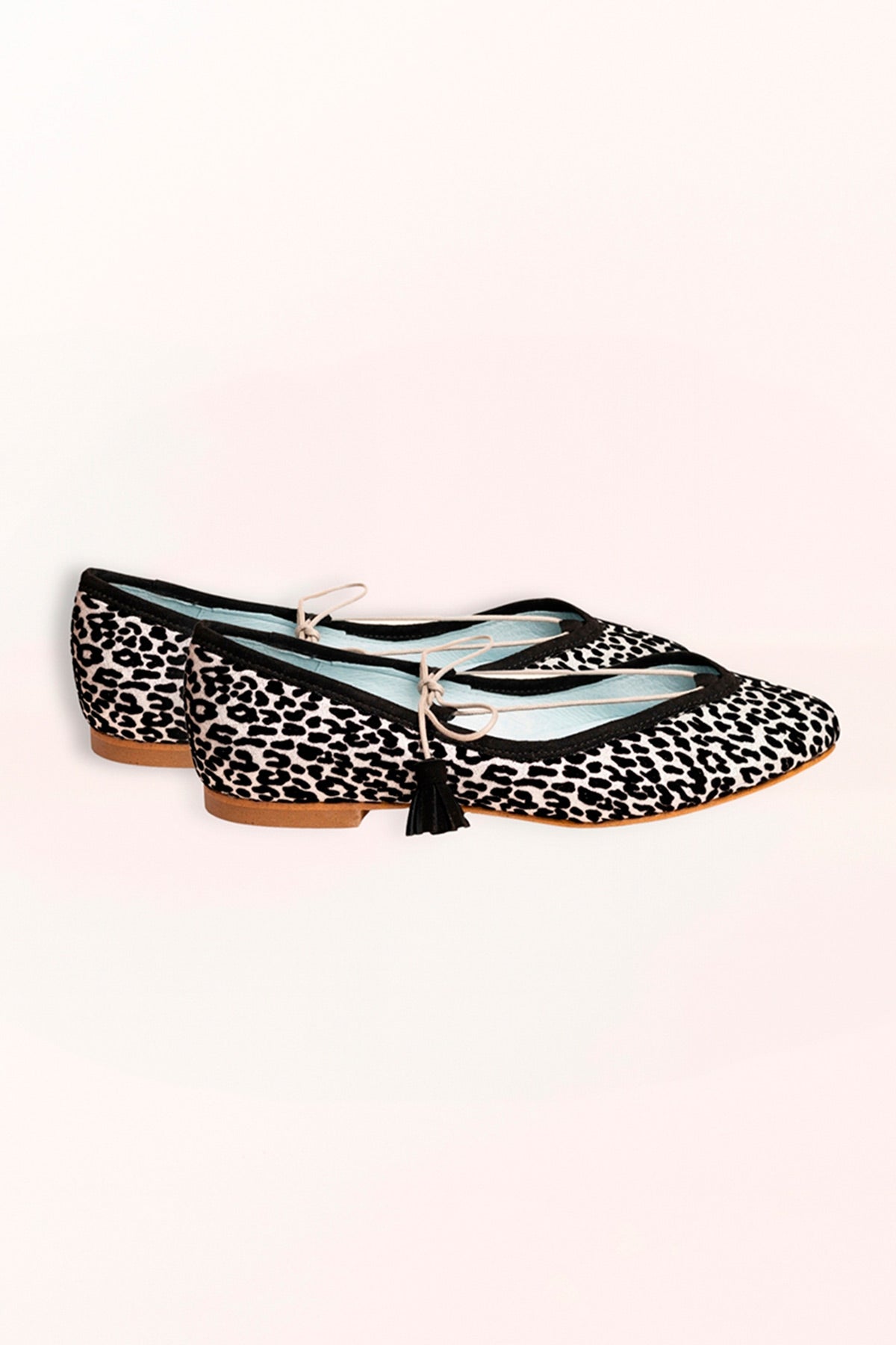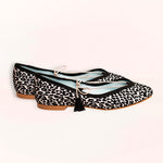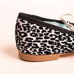 Ballerina in in spitzer Animal-Print-Optik in Silber- und Schwarztönen, aus Satin mit flockiertem Fleckenmuster und metallisiertem Kordelzug Geschlossener V-Ausschnitt. Handgefertigt und 100% in Spanien produziert. Hergestellt aus hochwertigen Rohstoffen, sorgfältig ausgewählt.