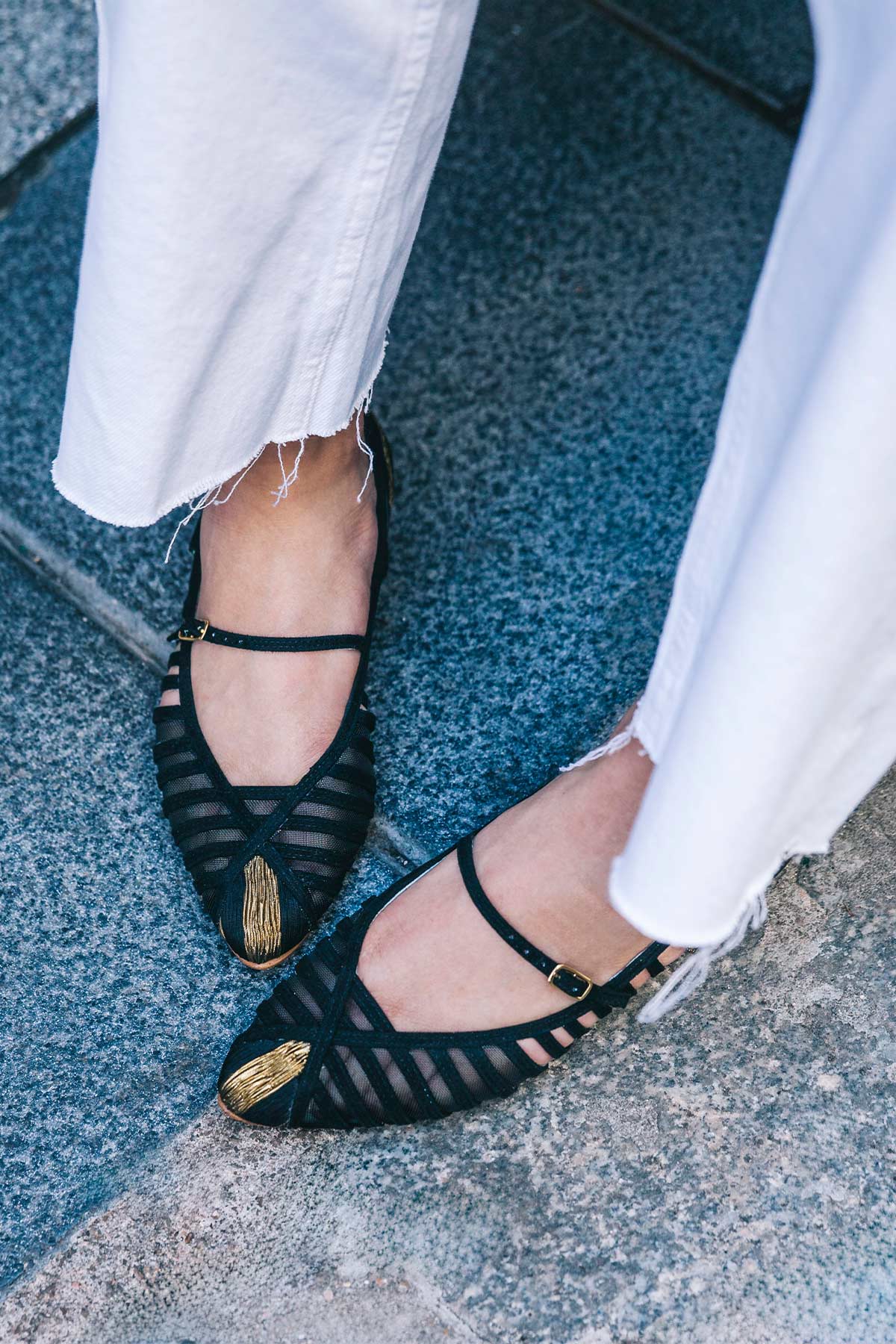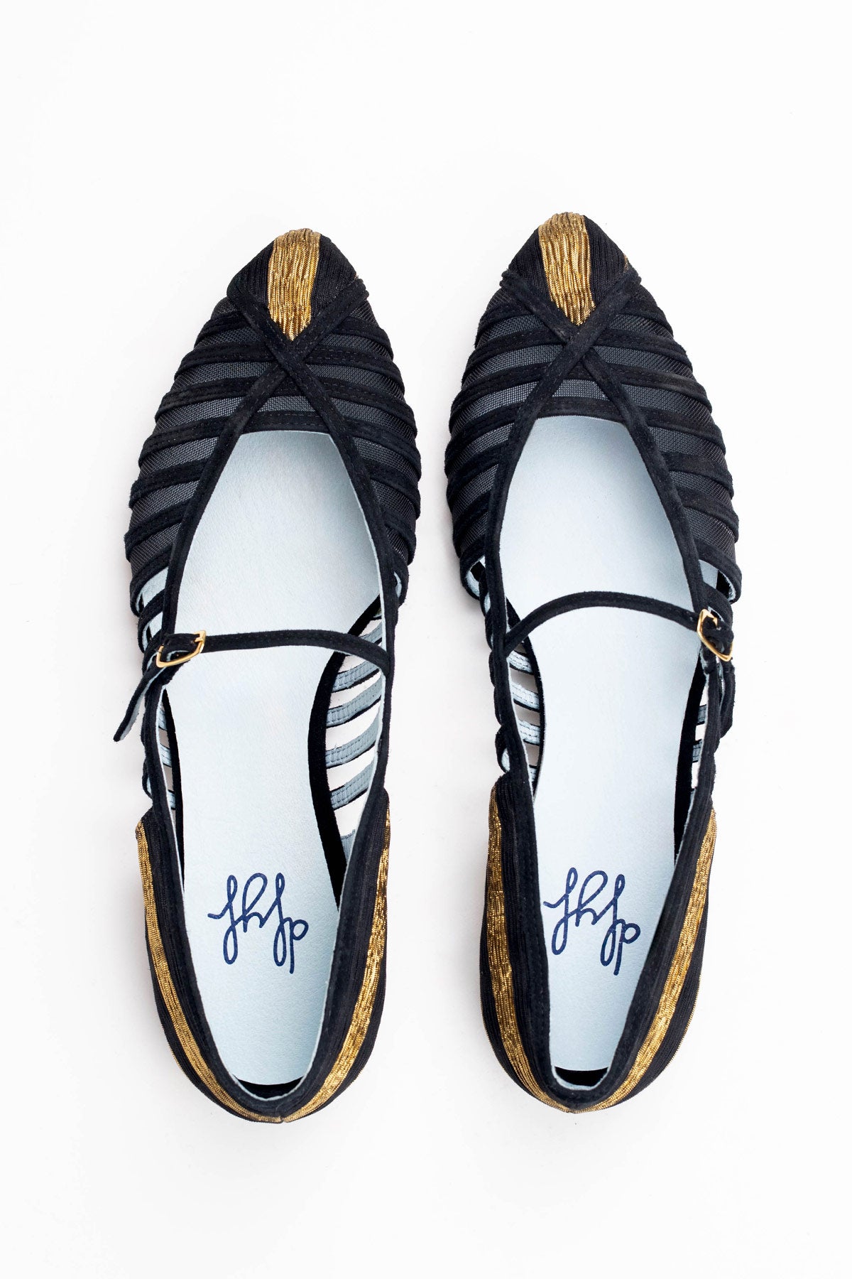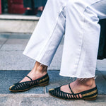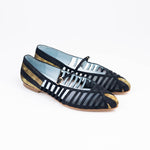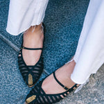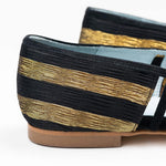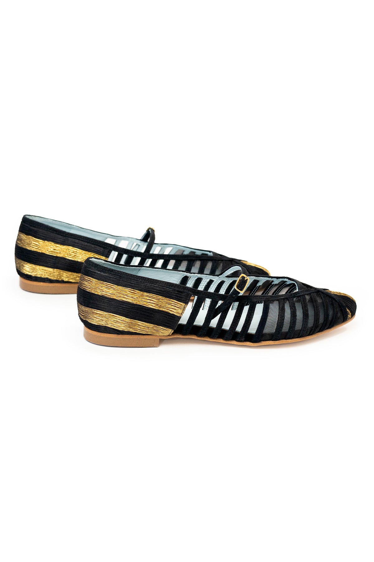 Roma Black ist unsere zarte, zweifarbige Ballerina mit Riemchen, die Schwarz, Gold und Transparenzen kombiniert. Es ist ein Design mit mehreren Aussparungen. Sie ist mit großer Präzision gefertigt, aufgrund der verschiedenen Stoffzuschnitte entlang des Schuhs. Die Vorderseite ist mit einem schwarzen, transparenten Netz ausgestattet, das die Zehen besonders zart umschließt und dem Design keine Weiblichkeit nimmt. Die Spitze und die Ferse sind aus plissiertem Seidenstoff in Gold und Schwarz gestaltet. Der restliche Schuh besteht aus schwarzem Leder.