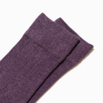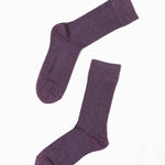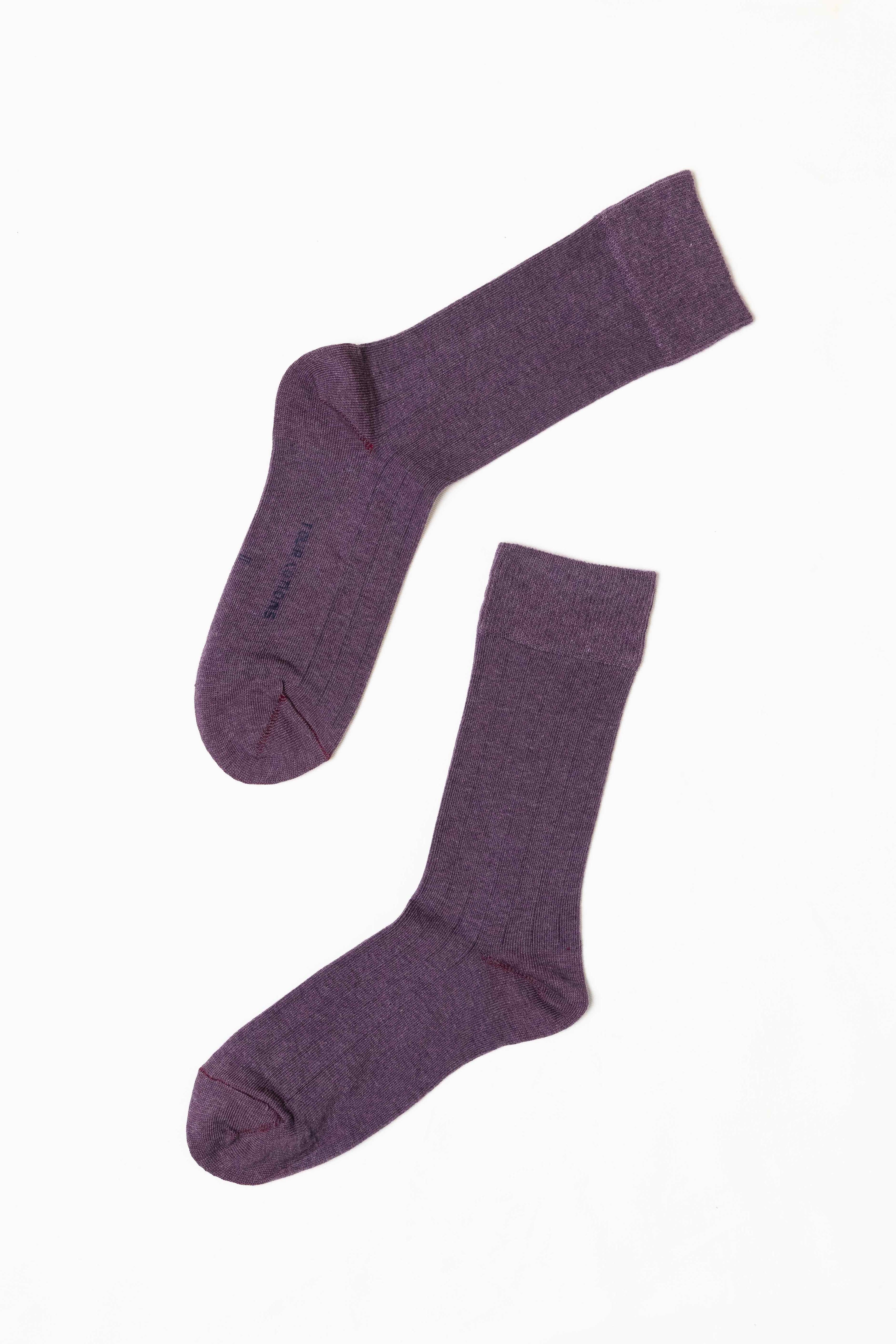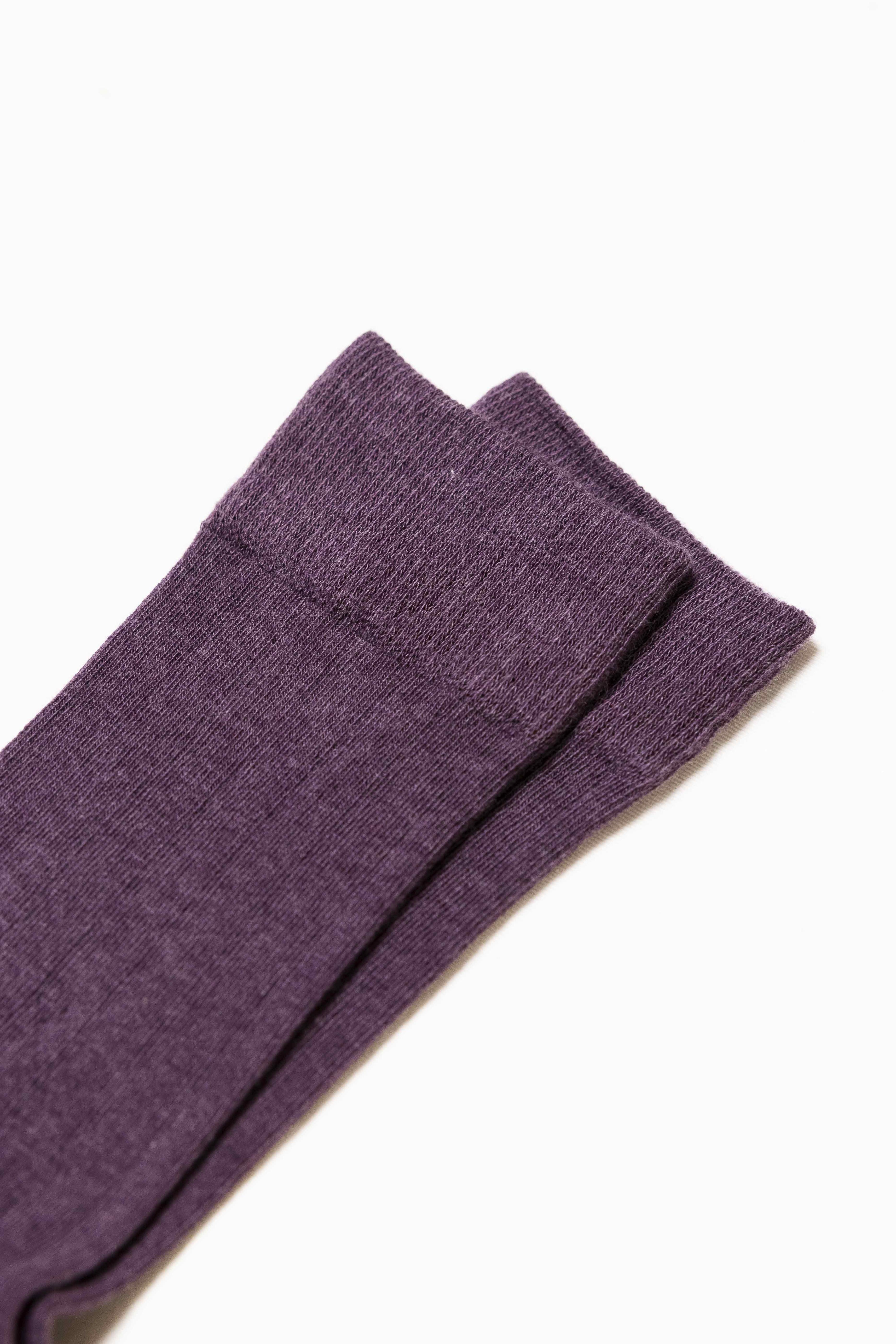 Halbhohe Baumwollsocke mit Gummi, die perfekt sitzt, ohne auf der Haut Spuren zu hinterlassen. In Viola-Ton und grauem Mikrostreifen.