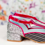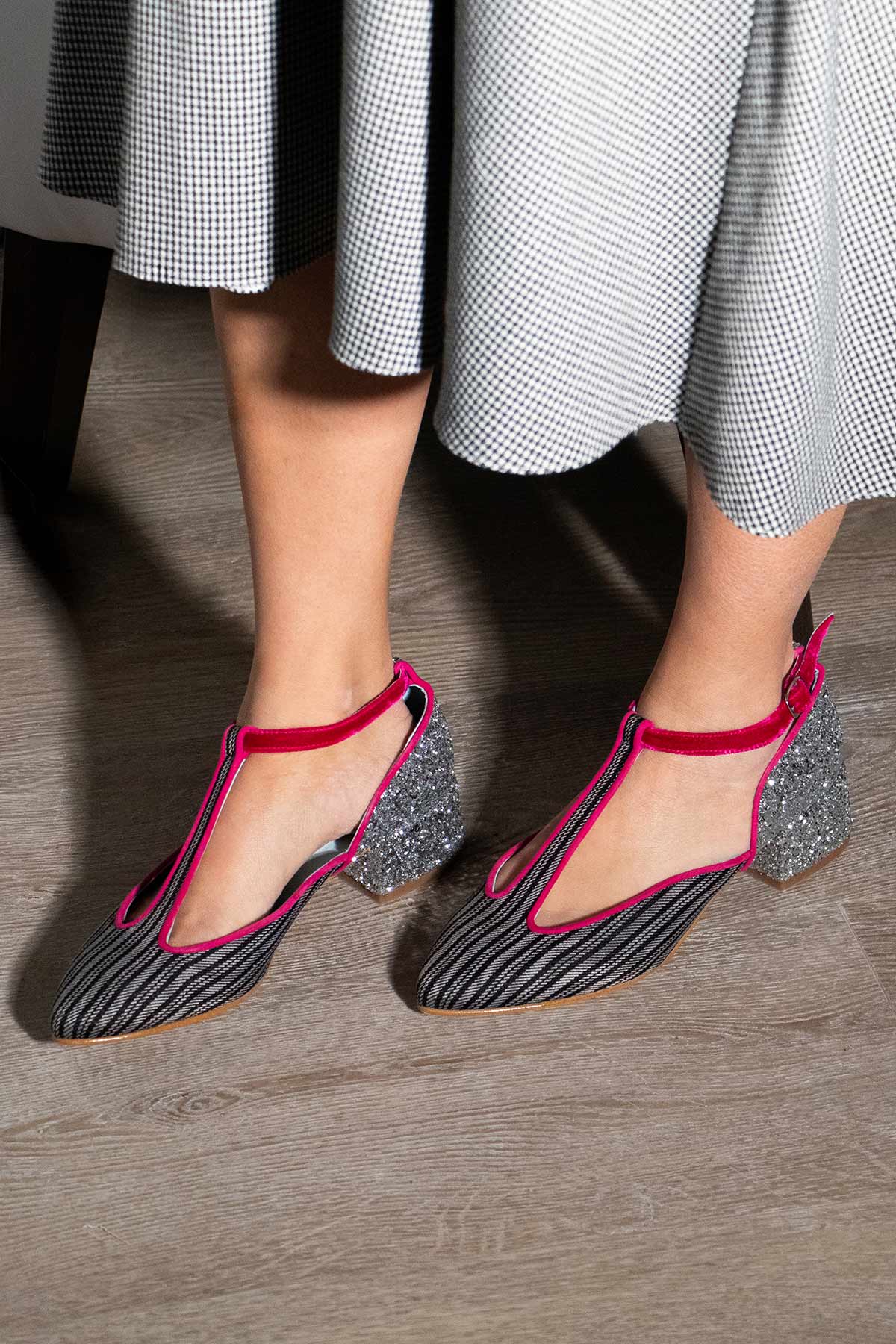 Medium heel combining glitter, fuchsia silk velvet and burlap fabric in gray tones. Contrasting fuchsia trim. Light blue leather interior. Leather sole. Only available at www.defloresyfloreros.com, Defloresyfloreros Madrid and Hotel Montera Madrid. Exclusive model from defloresyfloreros, designed and manufactured in Spain.