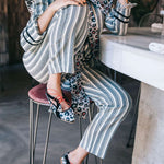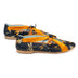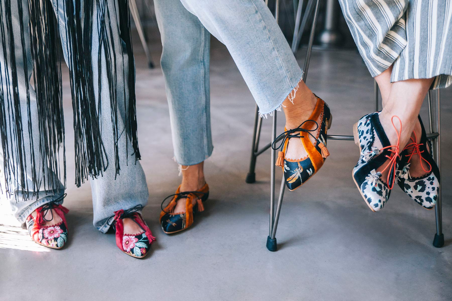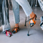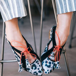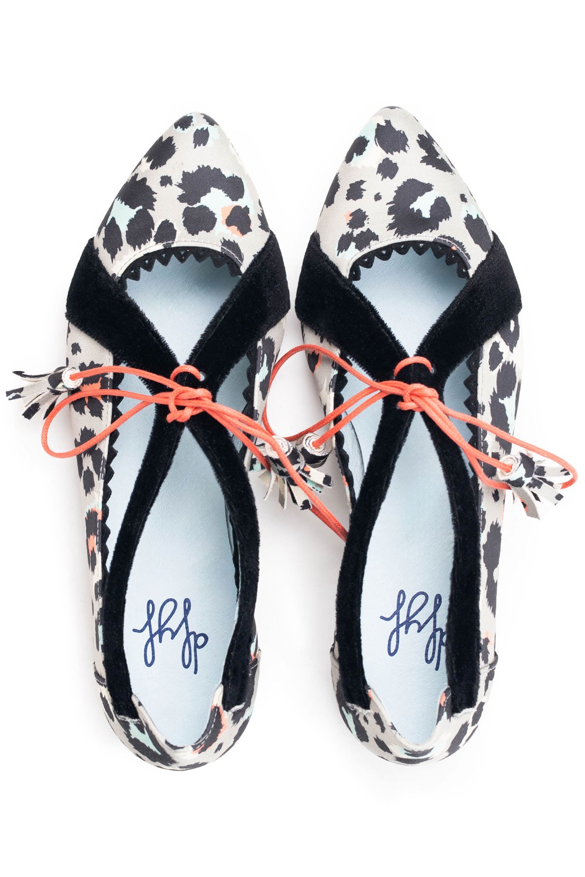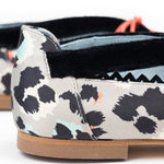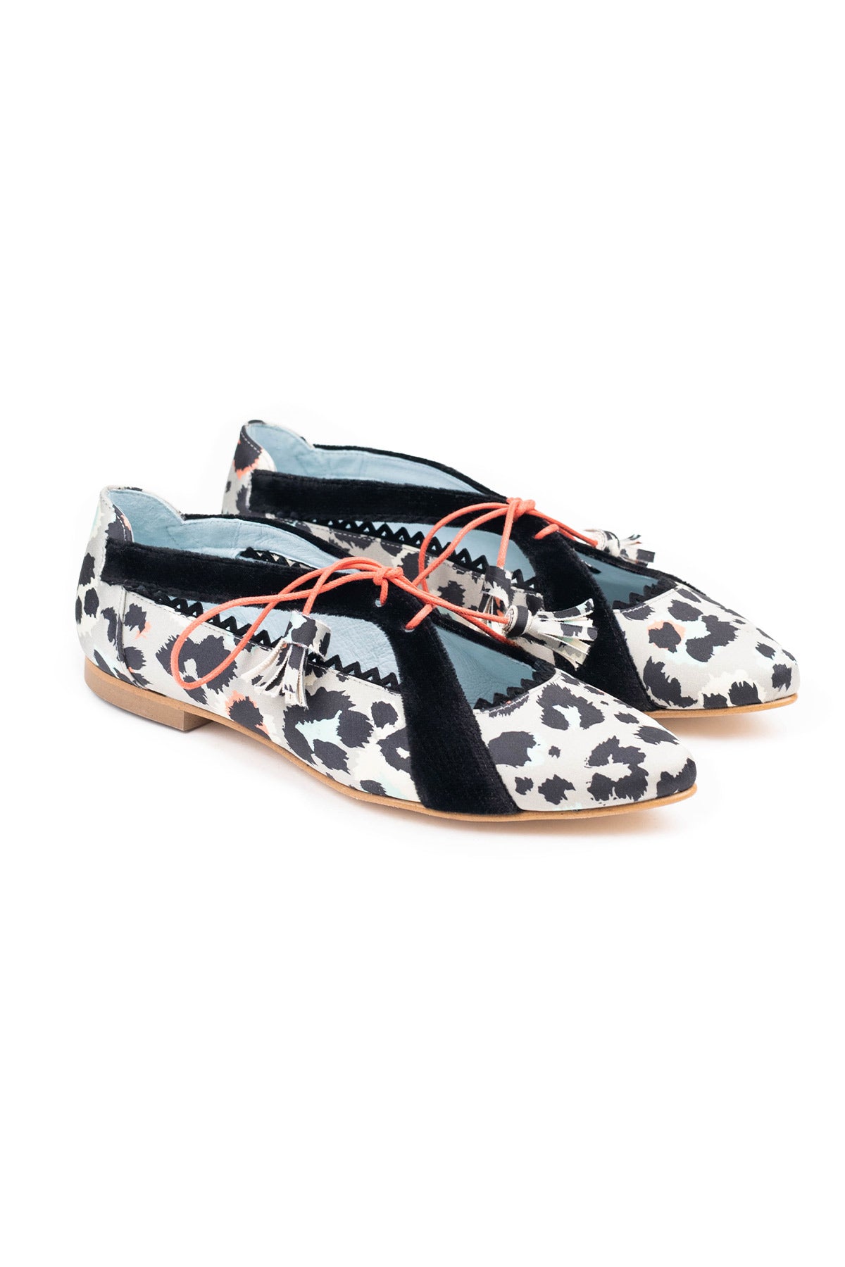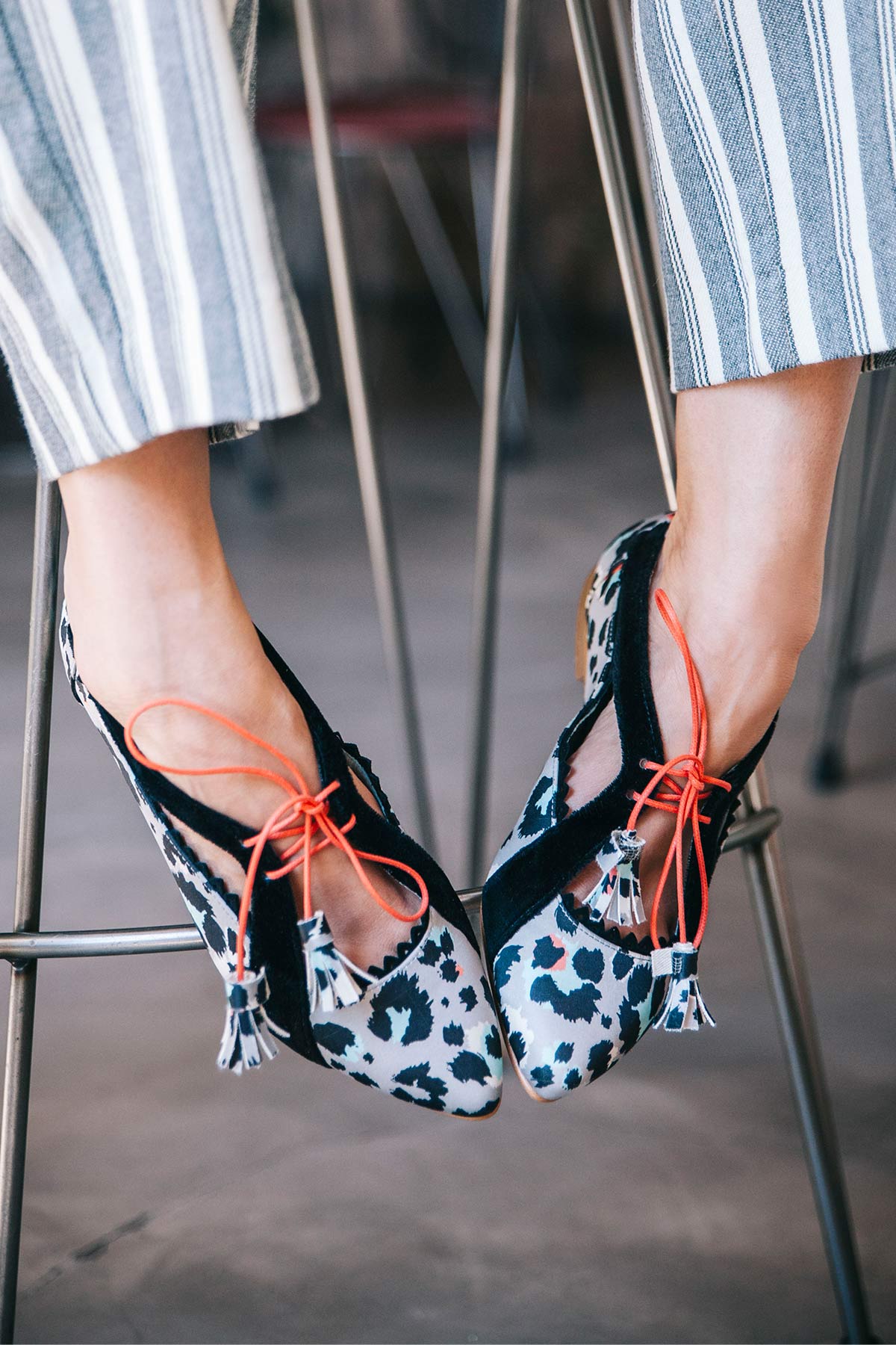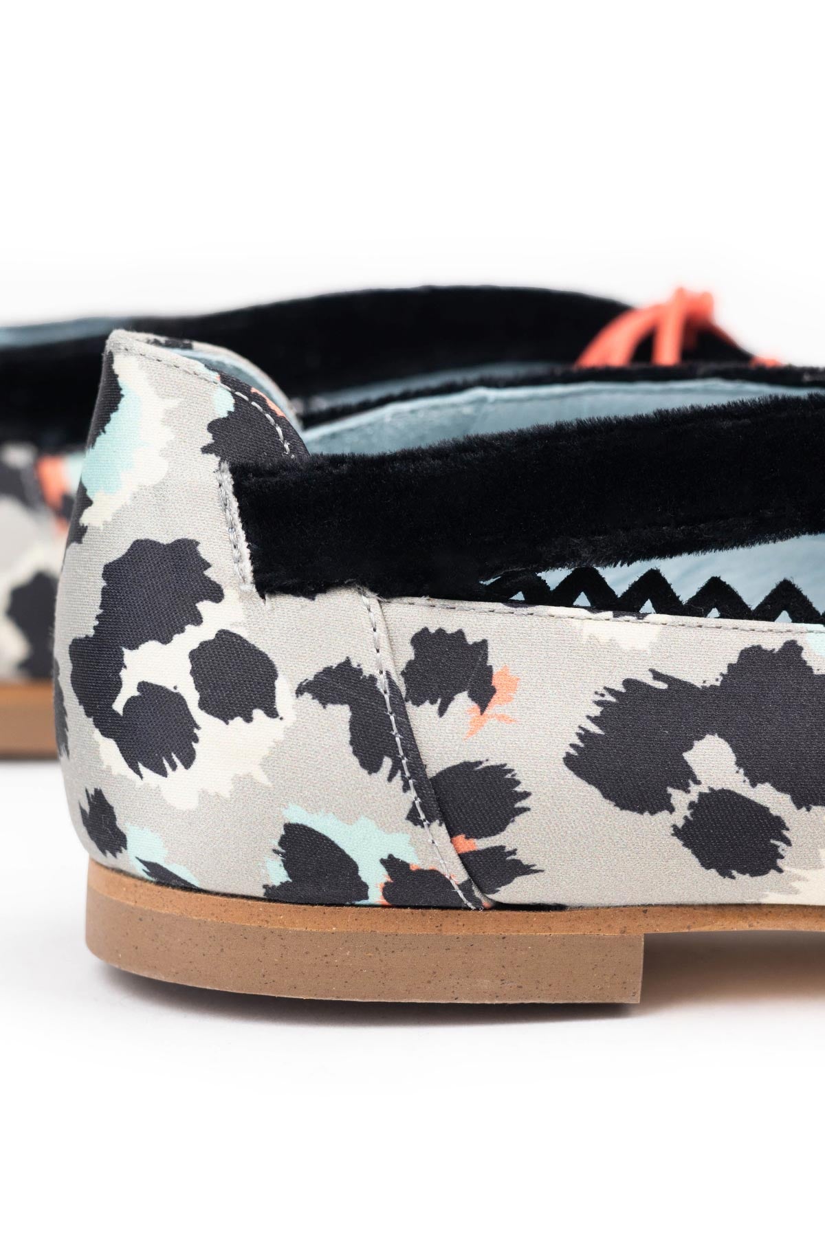 Lisboa Print is a model with a familiar look. It is made of satin printed in gray, light blue, and orange print, in line with several of our accessories for the season. A lace-up blucher shoe, with a super attractive scalloped edge, which greatly flatters the shape of the foot. The upper piece, in black velvet, runs along the sides to the heel, providing a beautiful contrast. It closes with a salmon cotton lace finished with tassels. As a detail, its zigzag perforated piece stands out, sewn between the upper and lining, a handcrafted detail of great beauty and precision.