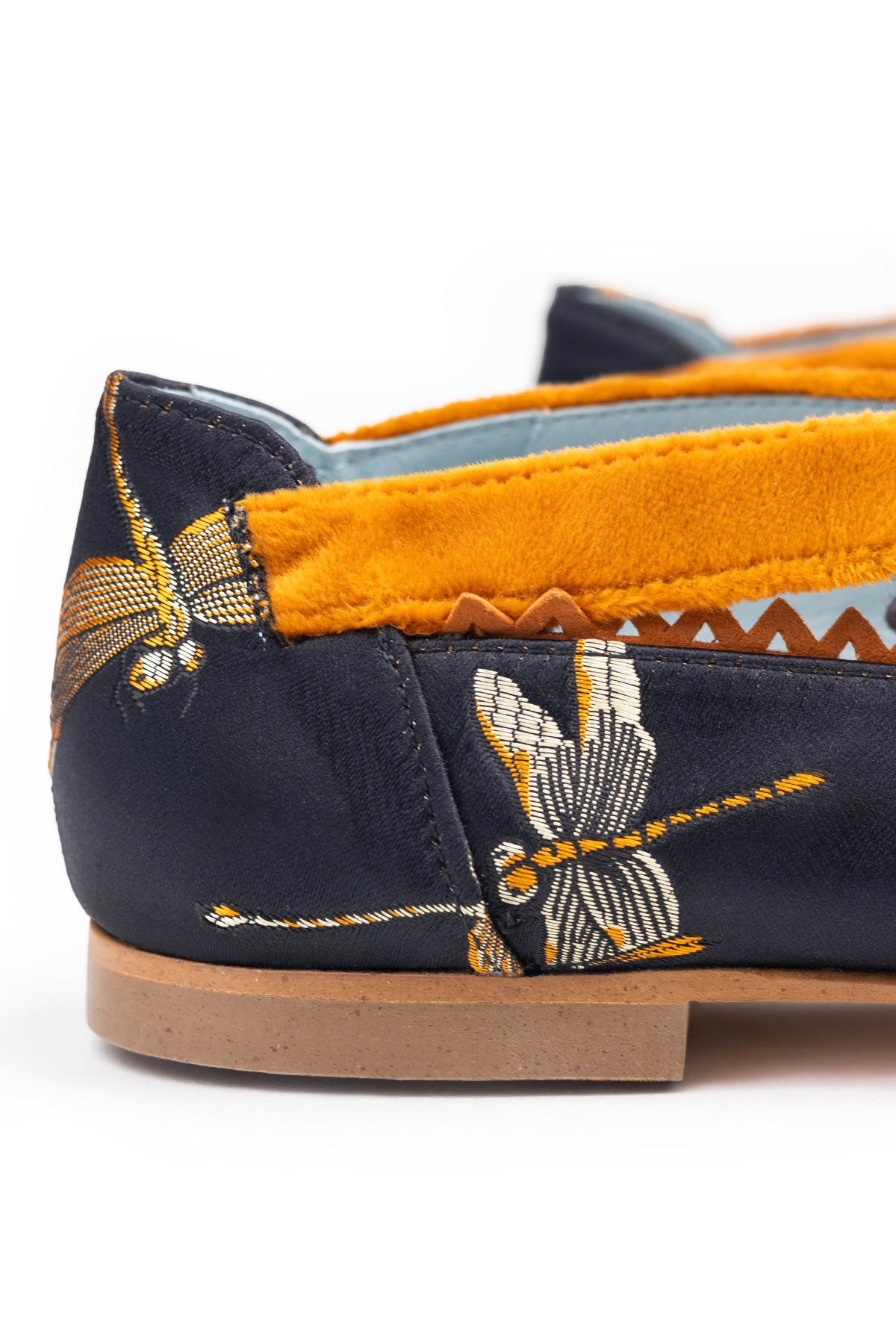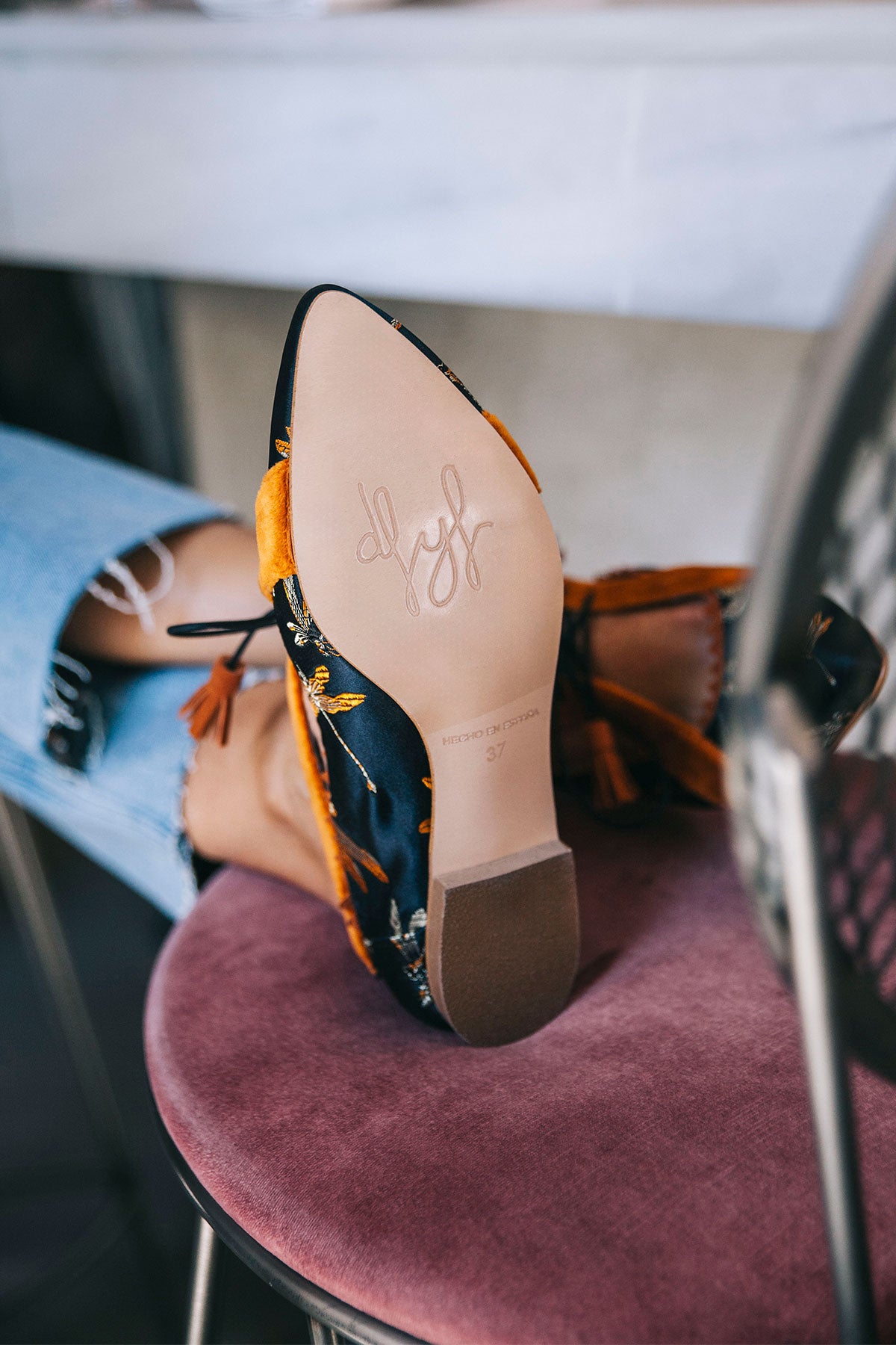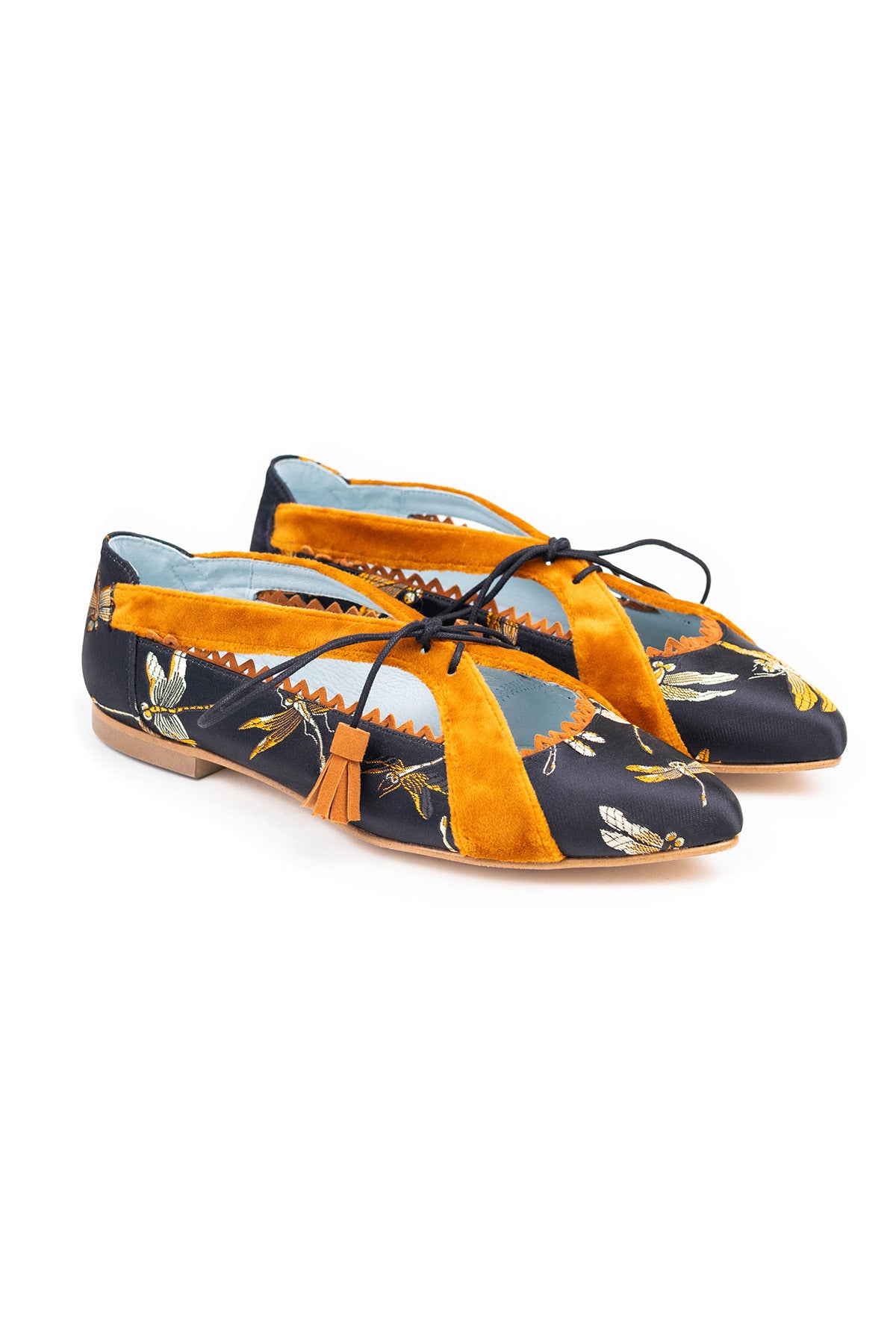Lisboa Velvet is pure elegance. It is made of black satin embroidered with ochre dragonfly motifs. A lace-up blucher shoe, with a super attractive scalloped edge, which greatly flatters the shape of the foot. The upper piece, in ochre velvet, runs along the sides to the heel, providing a beautiful contrast. It closes with a cotton lace finished with suede tassels. As a detail, its zigzag punched piece stands out, sewn between the upper and lining, a handcrafted detail of great beauty and precision.