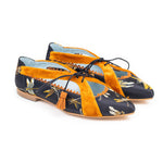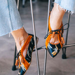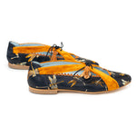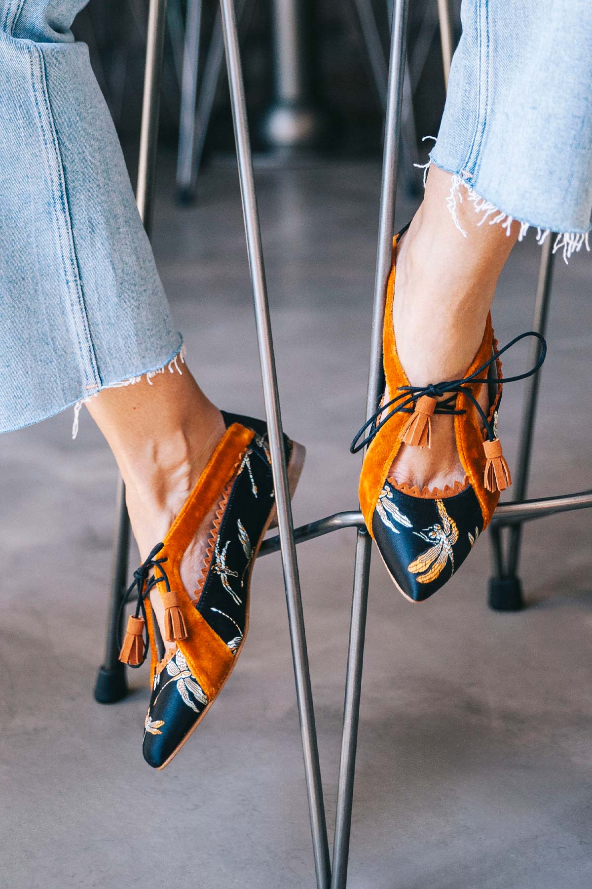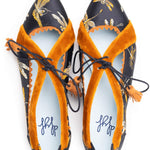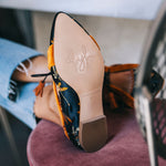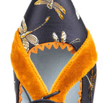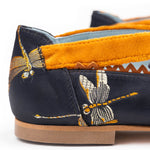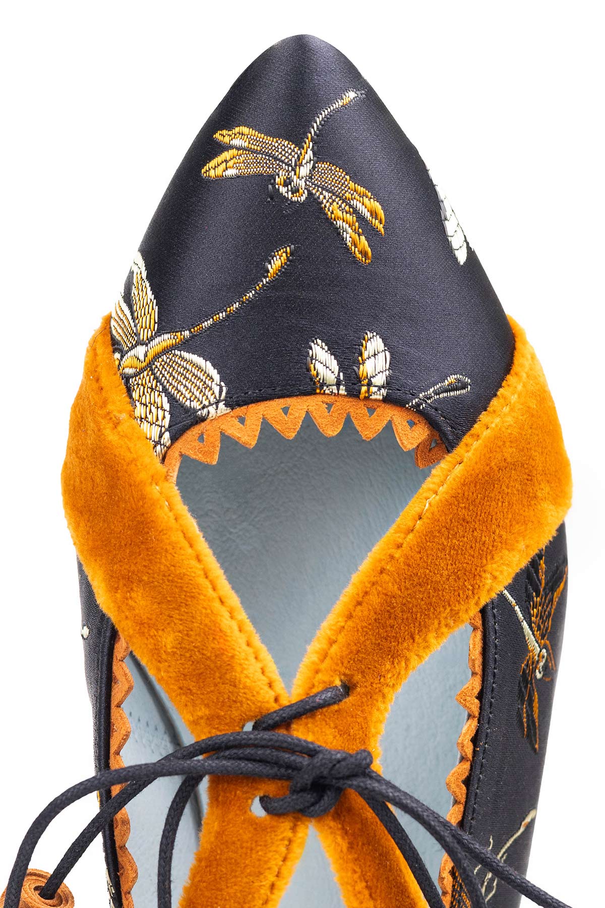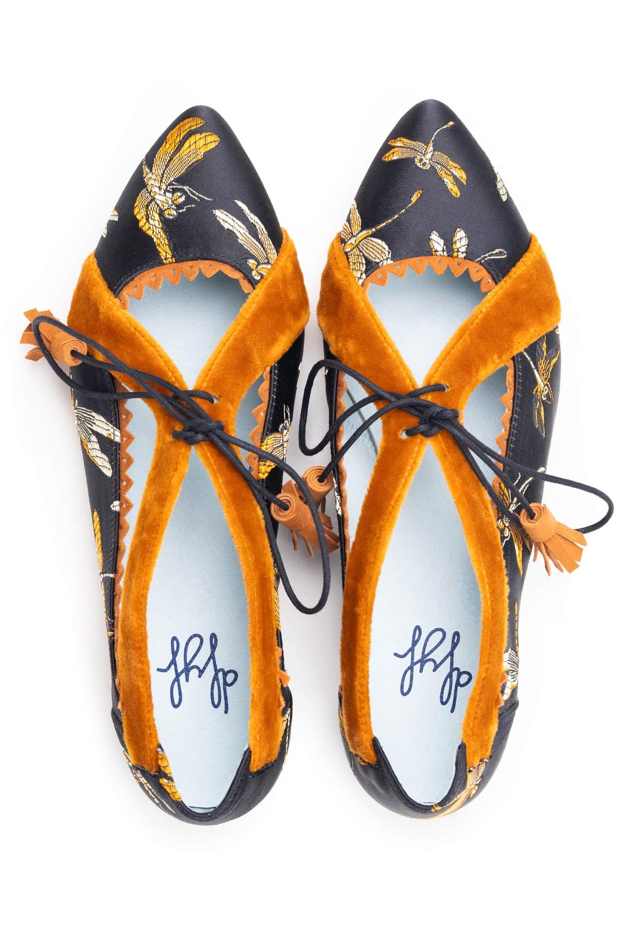 Lisboa Velvet is pure elegance. It is made of black satin embroidered with ochre dragonfly motifs. A lace-up blucher shoe, with a super attractive scalloped edge, which greatly flatters the shape of the foot. The upper piece, in ochre velvet, runs along the sides to the heel, providing a beautiful contrast. It closes with a cotton lace finished with suede tassels. As a detail, its zigzag punched piece stands out, sewn between the upper and lining, a handcrafted detail of great beauty and precision.