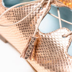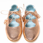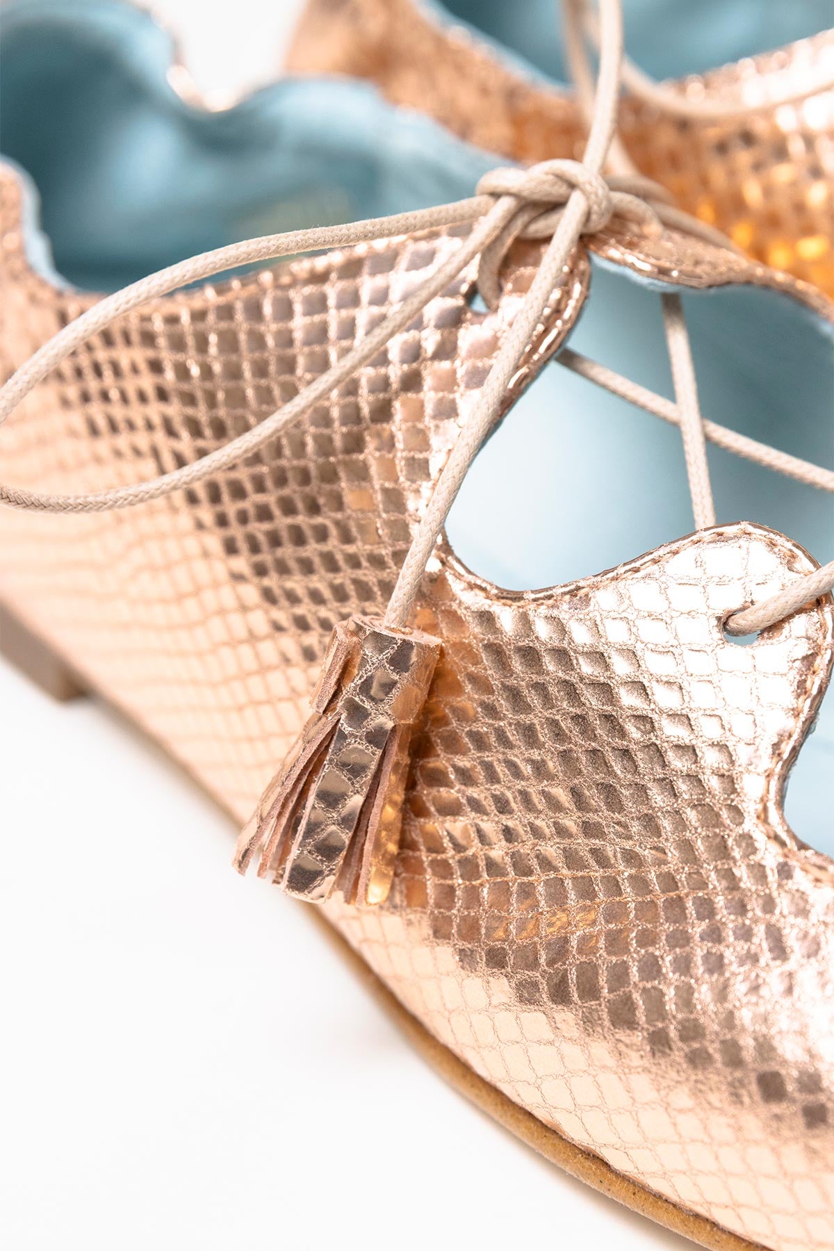 Here comes our gummy shoe. Moscú Brisa is not a blucher like the others. It is a design halfway between a blucher and a ballet flat, due to its organic finish and great flexibility. This original creation by deflores features a shiny pink leather cut, without trim, and with closed waves to keep the foot well secured. It ties with matching leather tassel laces, giving it a wonderfully naive touch. At the back, it has an elastic rock and roll band for a perfect fit. A great novelty suitable for mothers and daughters, with a very sweet style.