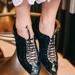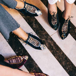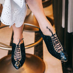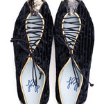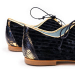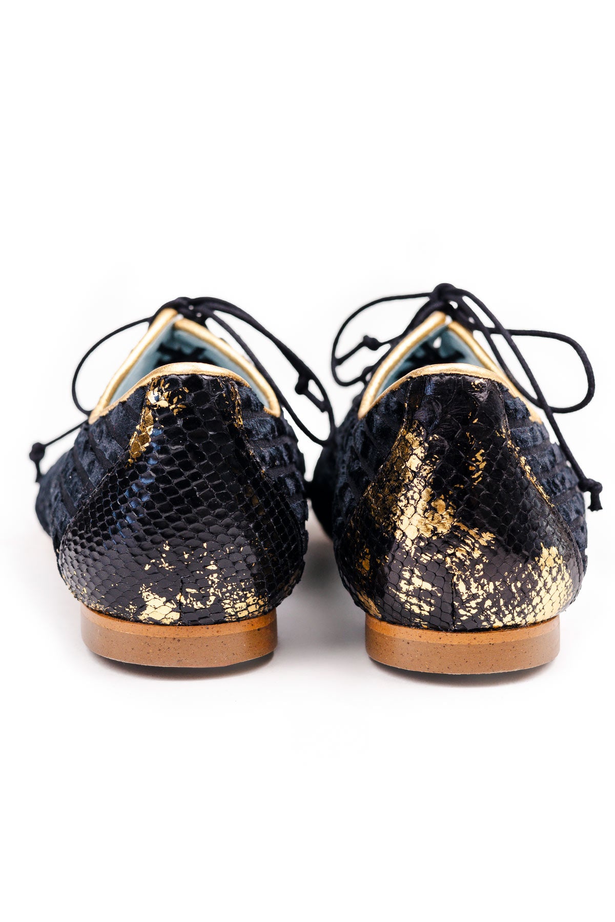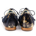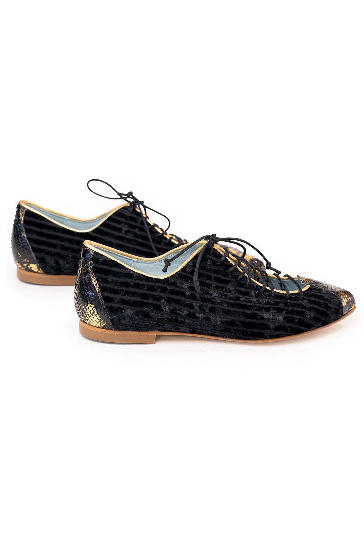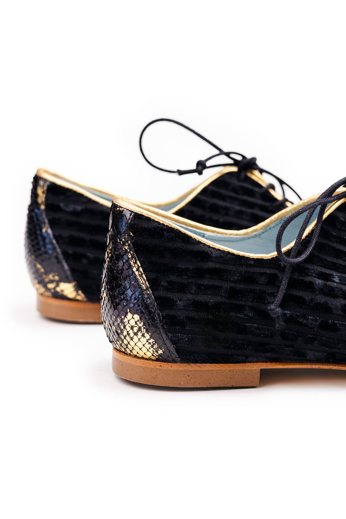 Python Sweden Gold is a blucher with a super exclusive original design. Its main feature is the large central opening, hand-finished with contrasting suede trim, which closes and adjusts with laces. It is a striped silk velvet shoe, in elegant black and gold. Its characteristic and trendy detail is the python, which decorates the toe and heel, in a multicolor finish achieved using an airbrush on already shed python skin.