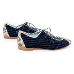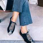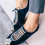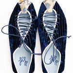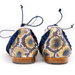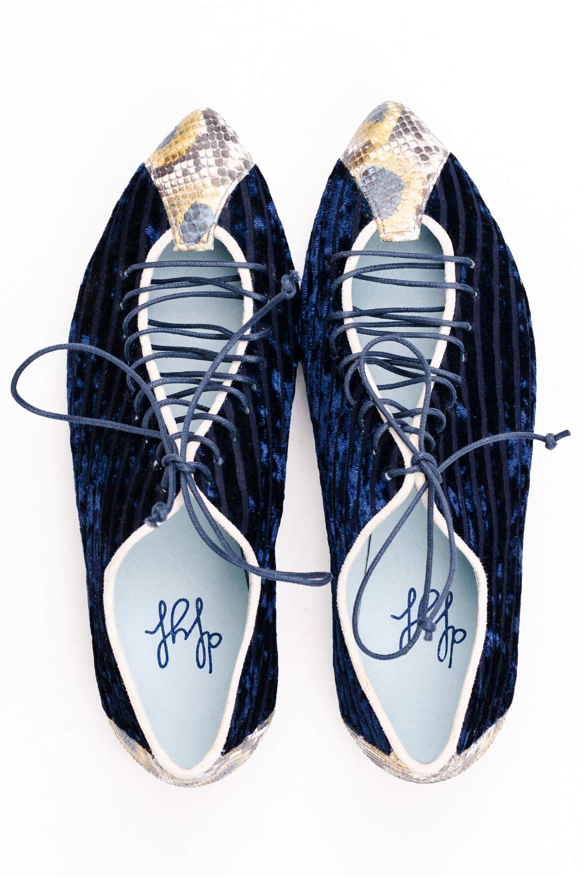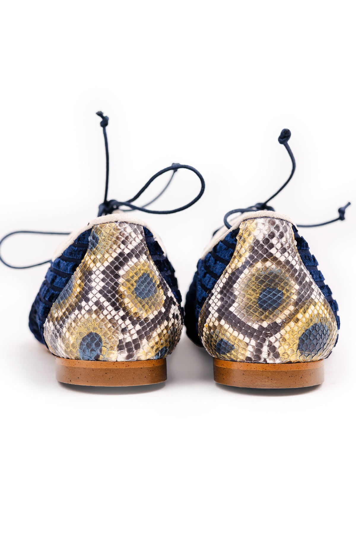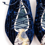 Python Sweden Navy is a blucher with a super exclusive original design. Its main feature is the large central opening, hand-finished with contrasting suede trim, which closes and adjusts with laces. It is a striped silk velvet shoe in an elegant navy color. Its characteristic and trendy detail is the python, which decorates the toe and heel, in a multicolor finish achieved using an airbrush on already tanned python leather.