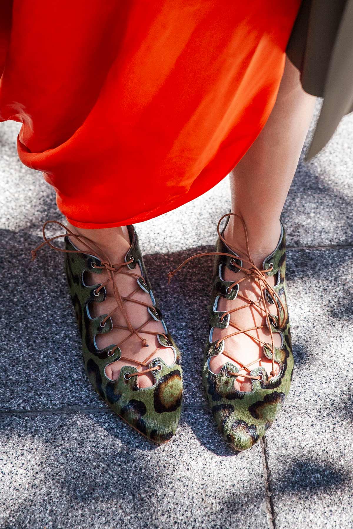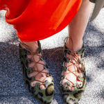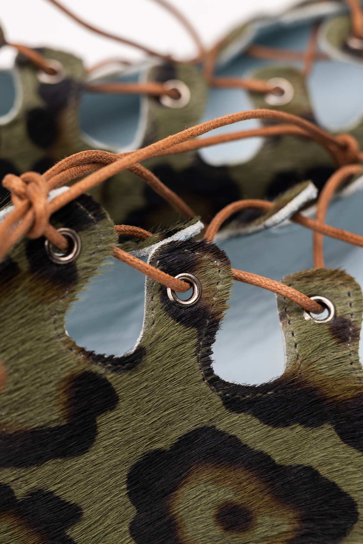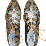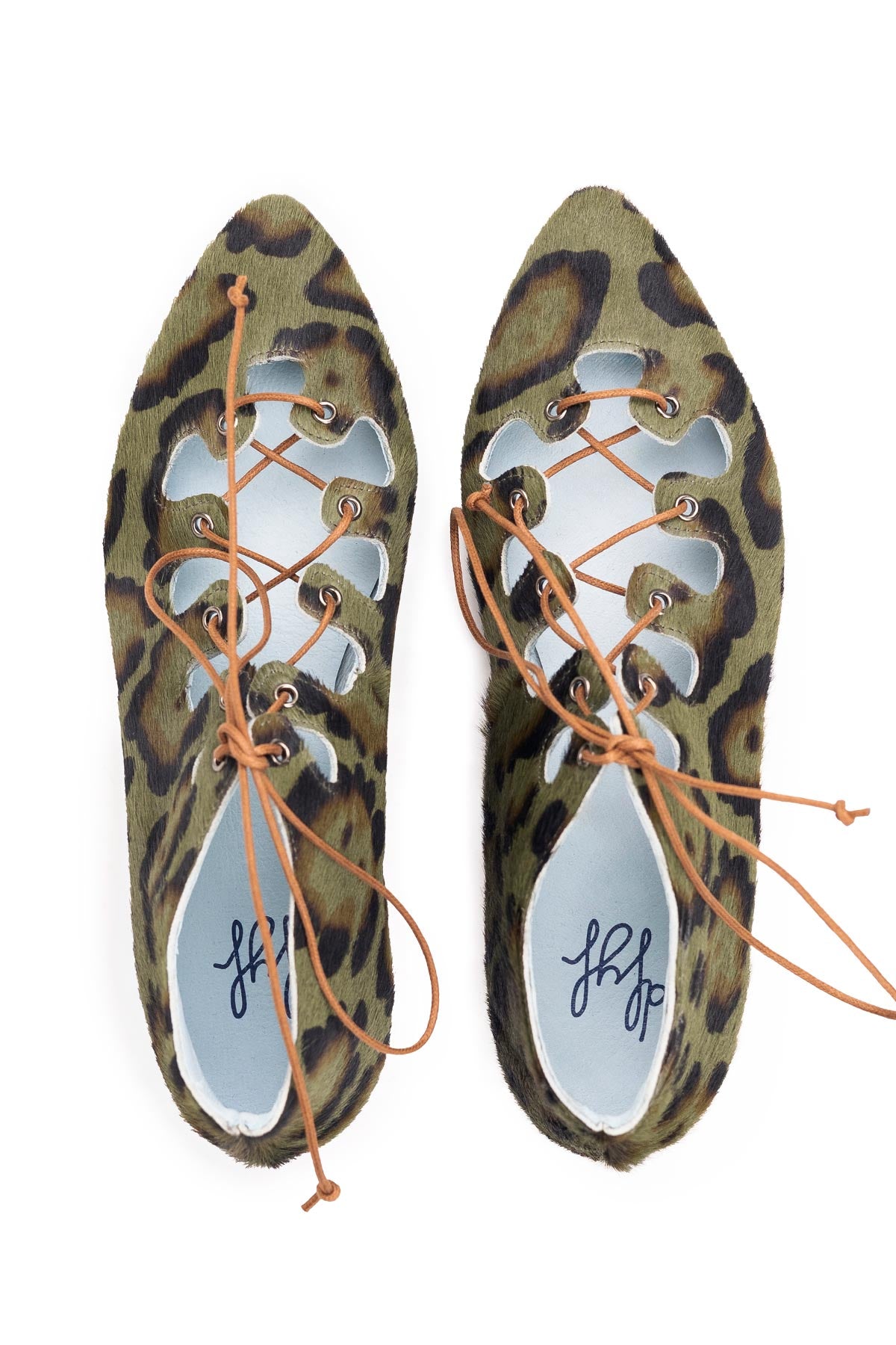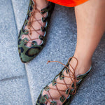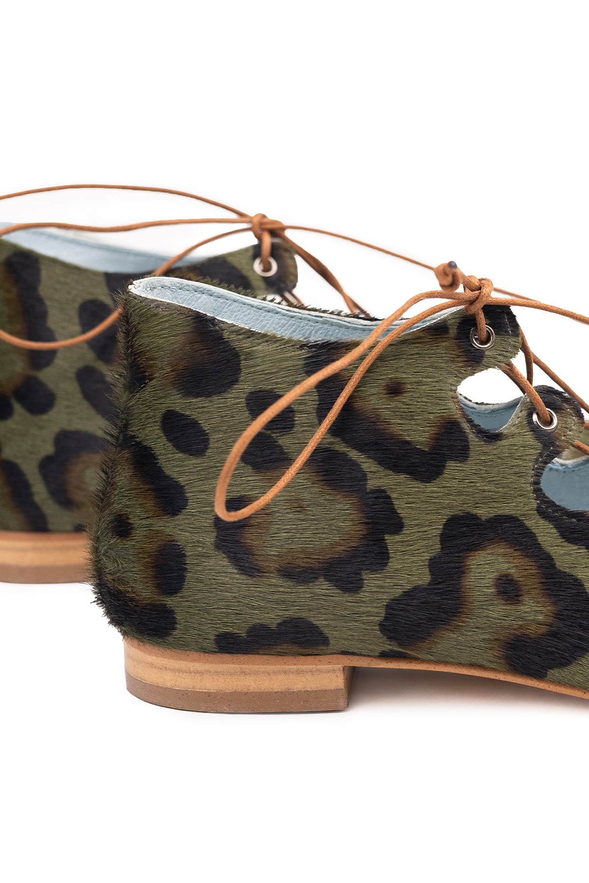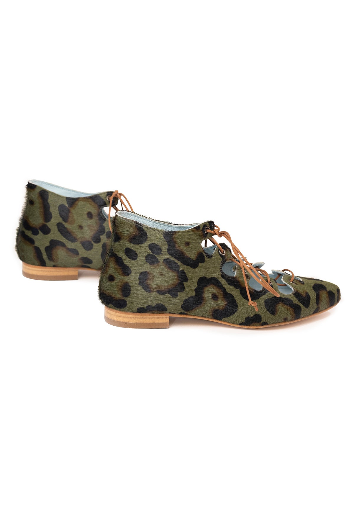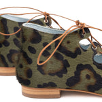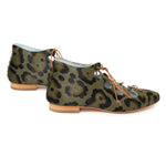 Berlin Caza is a semi-ankle boot model that will delight lovers of the hunting print. It stands out for its scalloped opening, with various waves, contrasting lace-up closure, and a pointed toe that elongates the leg. They are made of green hunting pony leather with brown spots that create an elegant animal print.