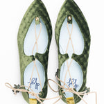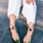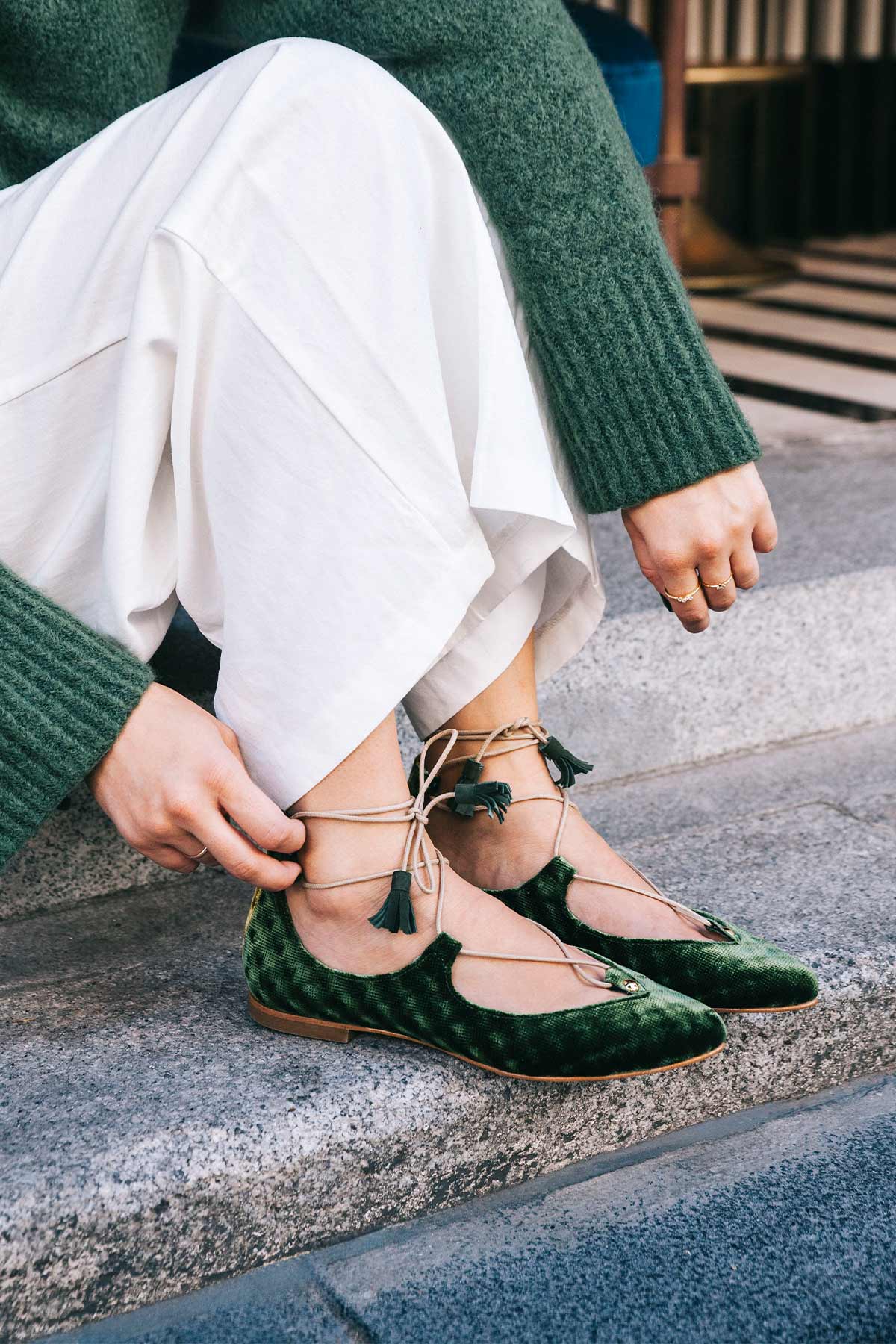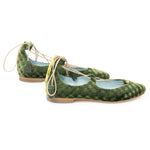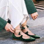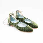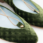 This ankle-tied ballerina design is presented in embossed silk velvet in moss green. Londres Caza is comfortable, versatile, and perfect from mid-season to the coldest winter. It comes with a removable wool insole. The laces are finished with moss green suede tassels, and the back features a velvet strip in a softer tone.