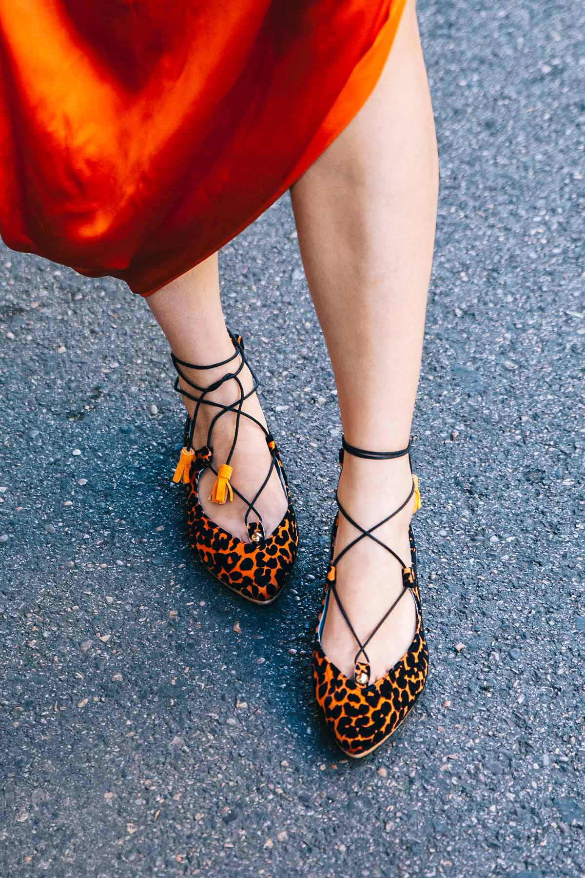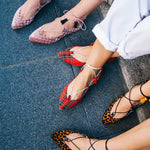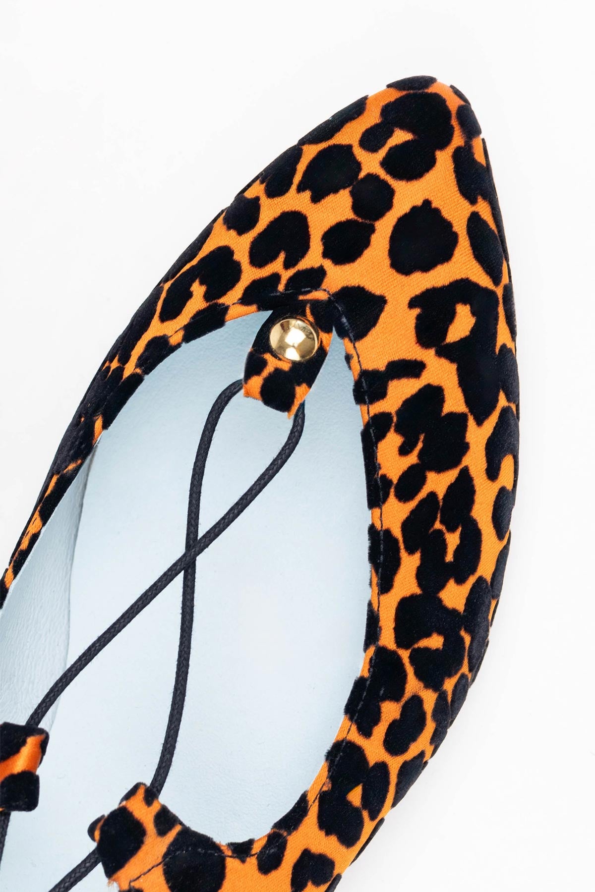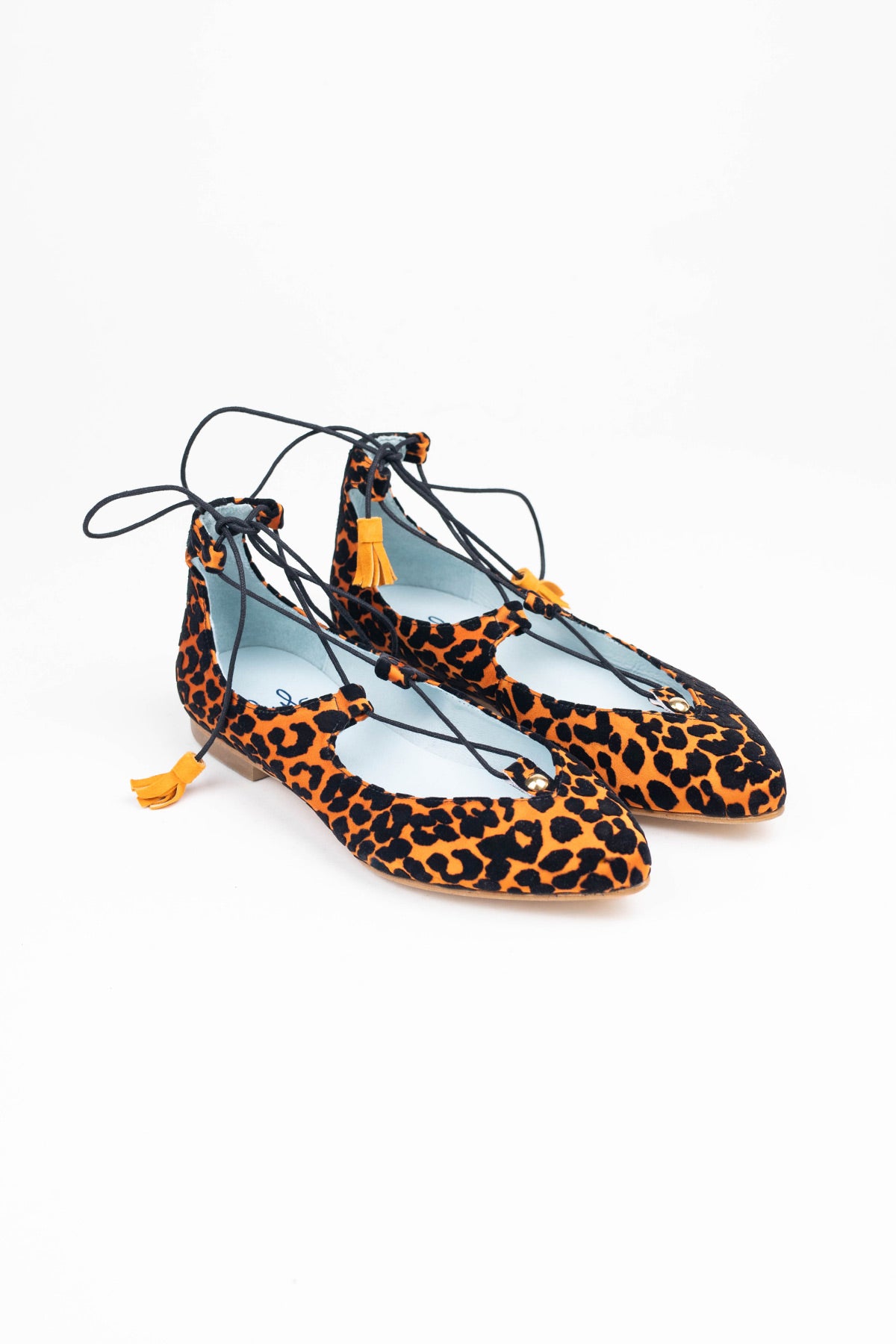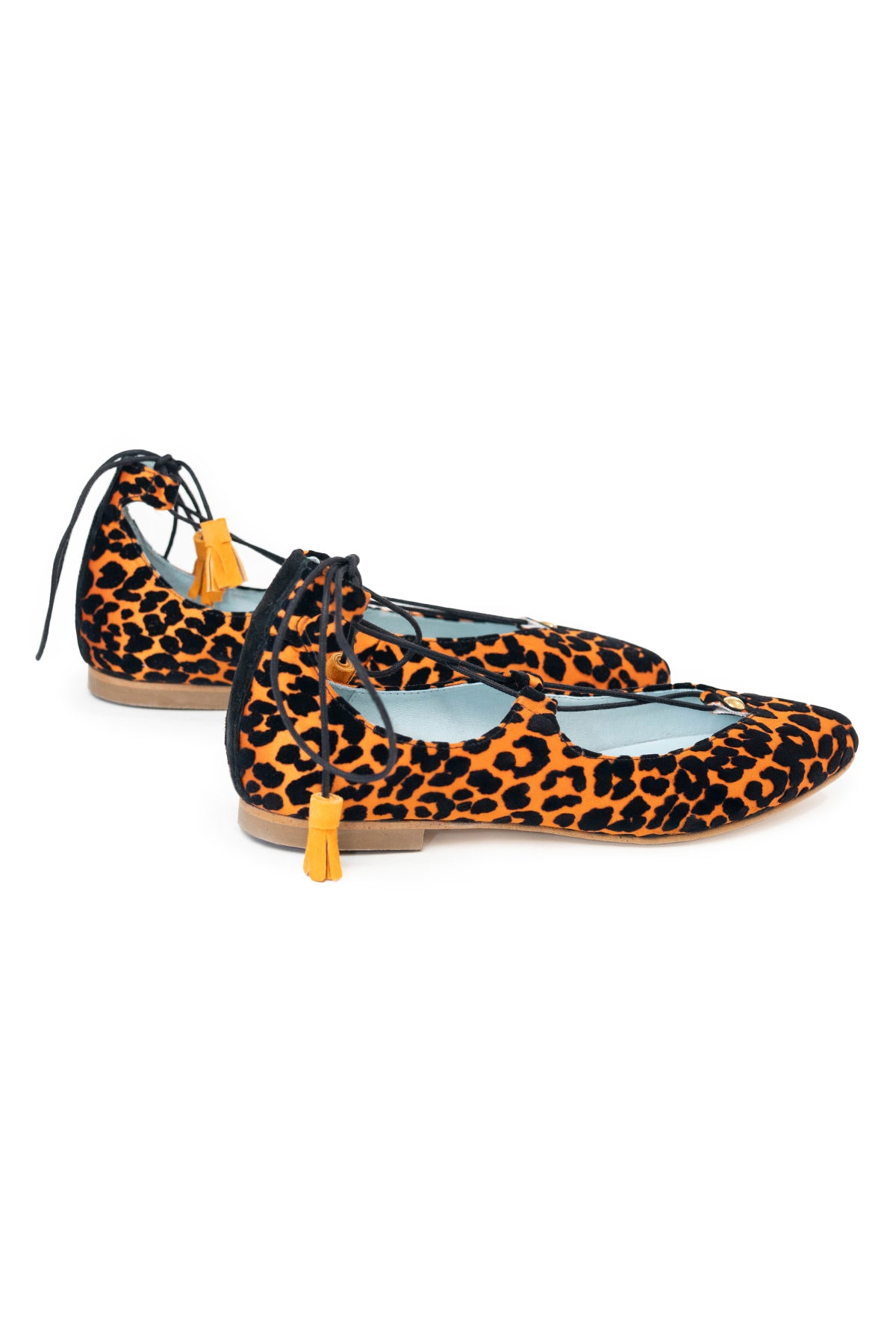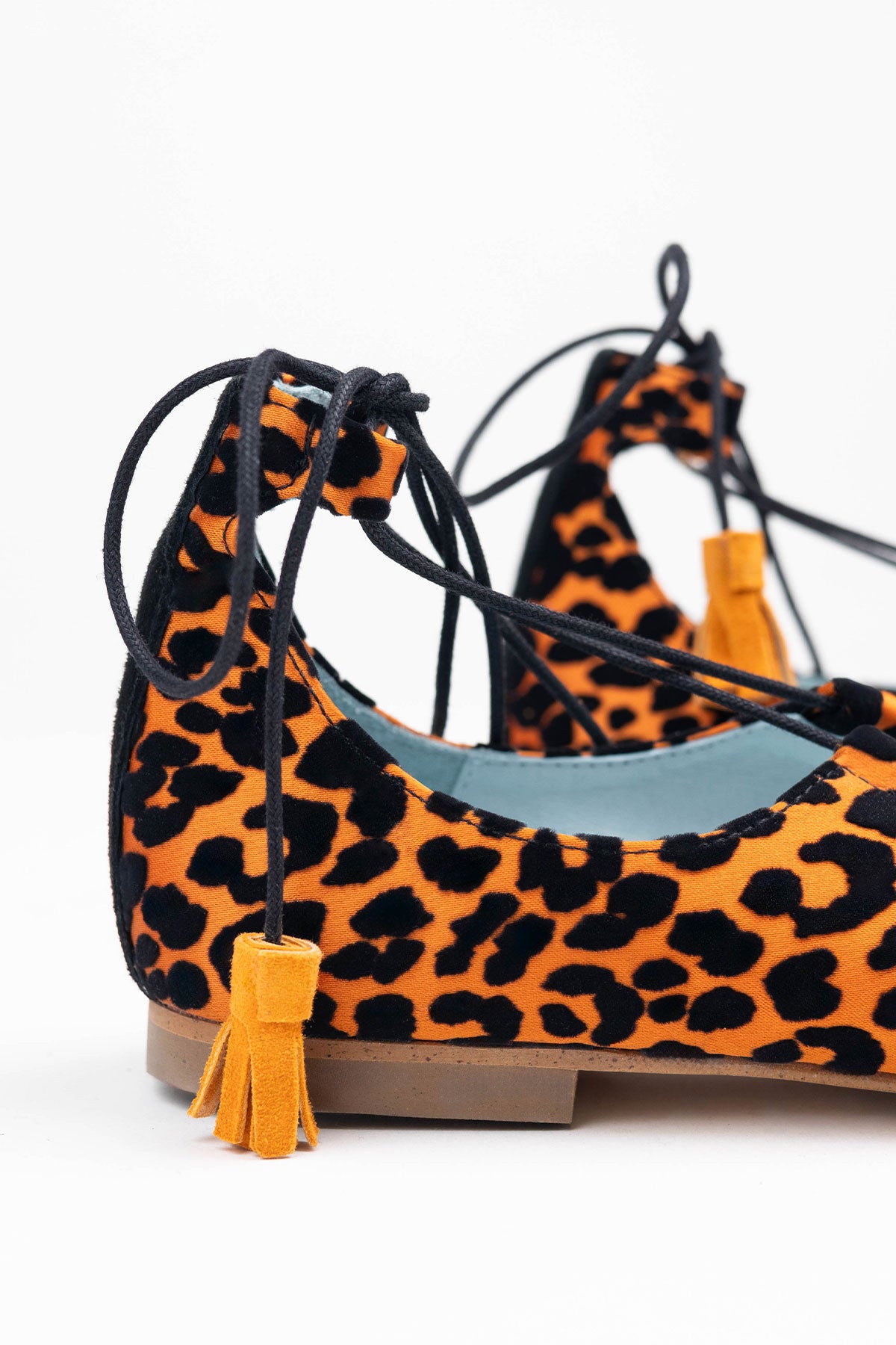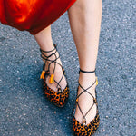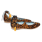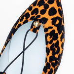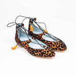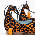 This ballerina design tied at the ankle wraps the foot thanks to its laces finished with suede tassels. The Londres Leo come in an animal print of flocked velvet over an intense orange. A very comfortable and striking design.