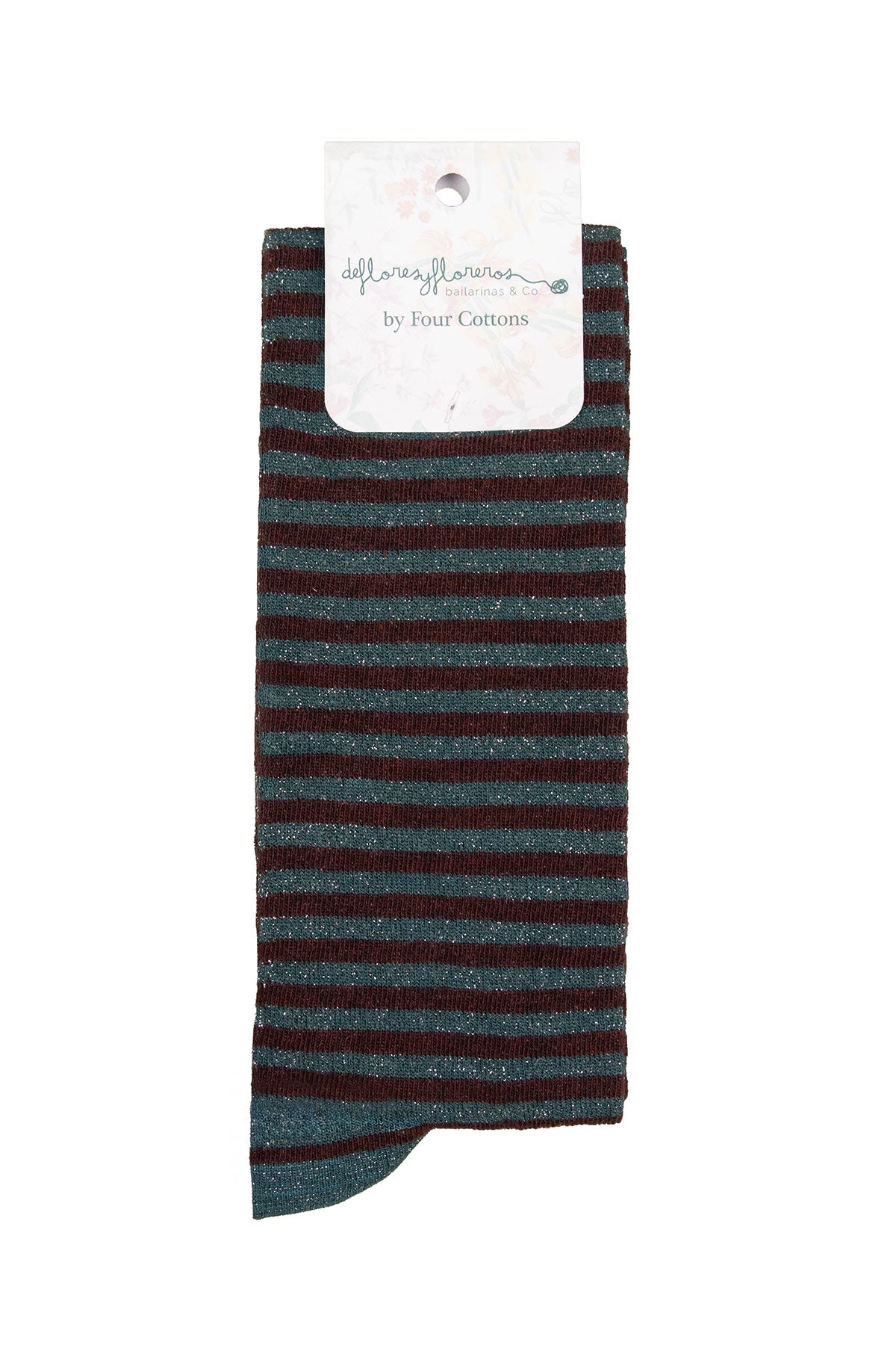 Calcetín de algodón de caña alta bicolor y detalles glitter. Diseño con puntera y faja del mismo color y estampado de rayas.