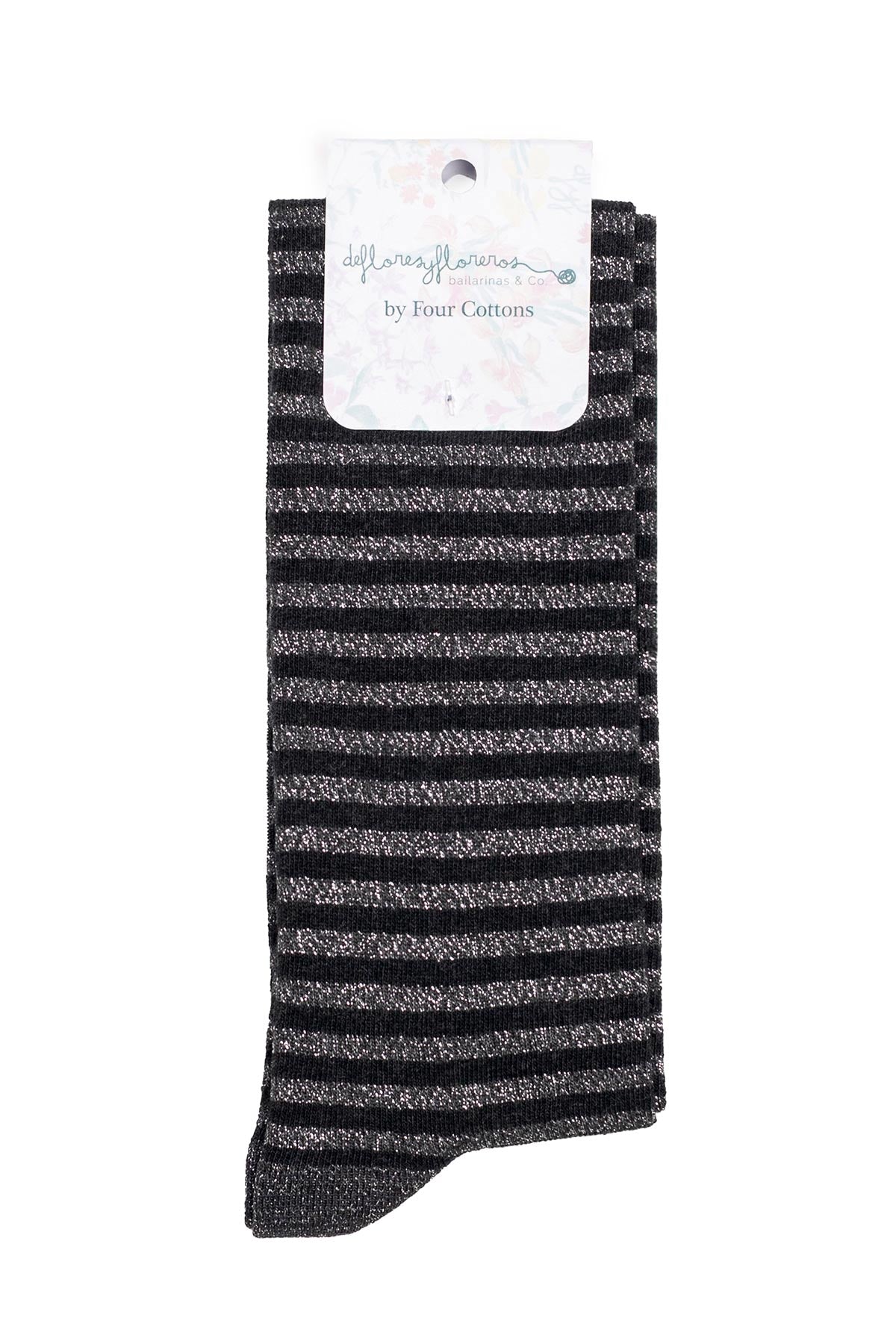 Calcetín de algodón de caña alta bicolor y detalles glitter. Diseño con puntera y faja del mismo color y estampado de rayas.