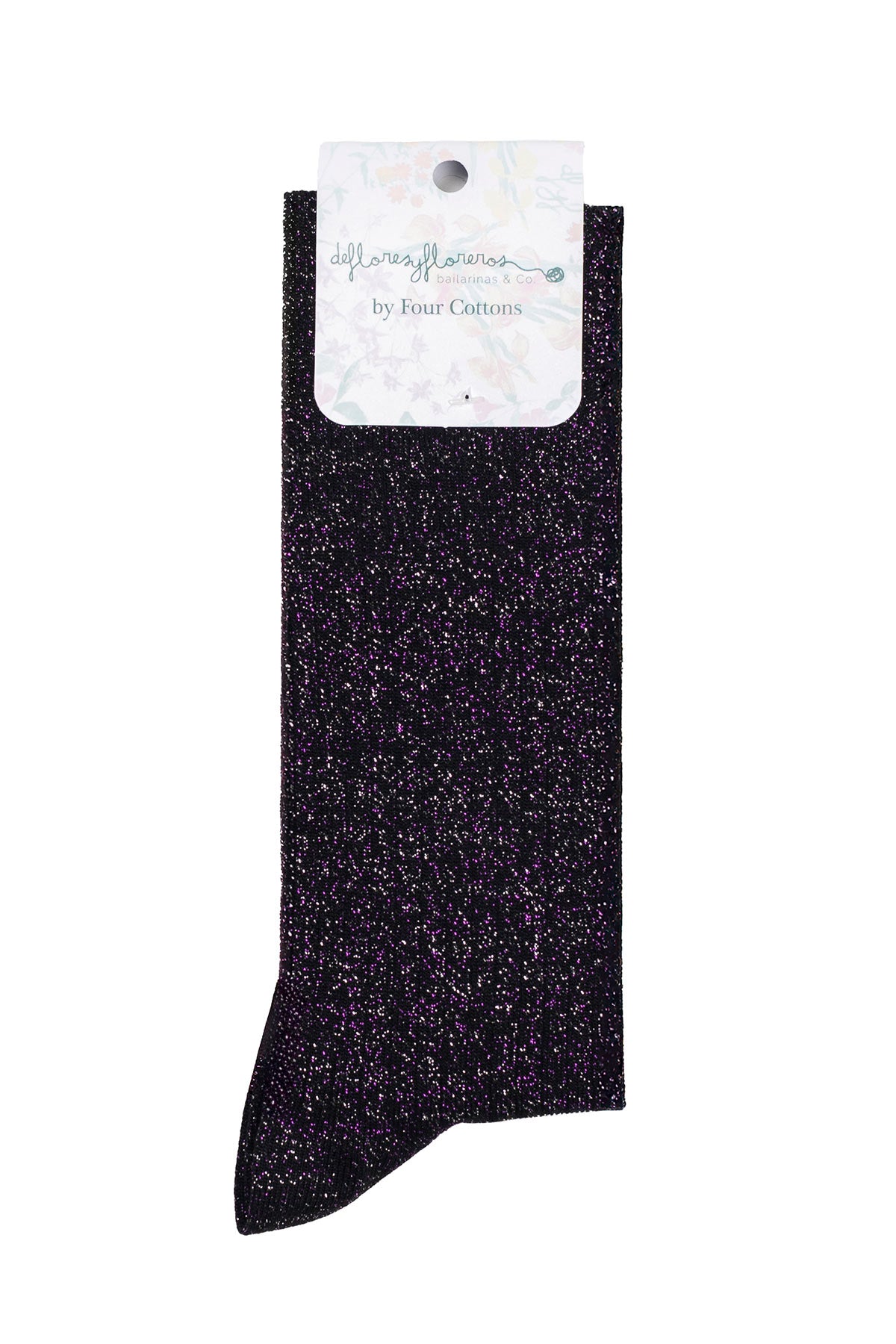 Calcetín de algodón de caña alta bicolor. Diseño con puntera y faja del mismo color y glitter.