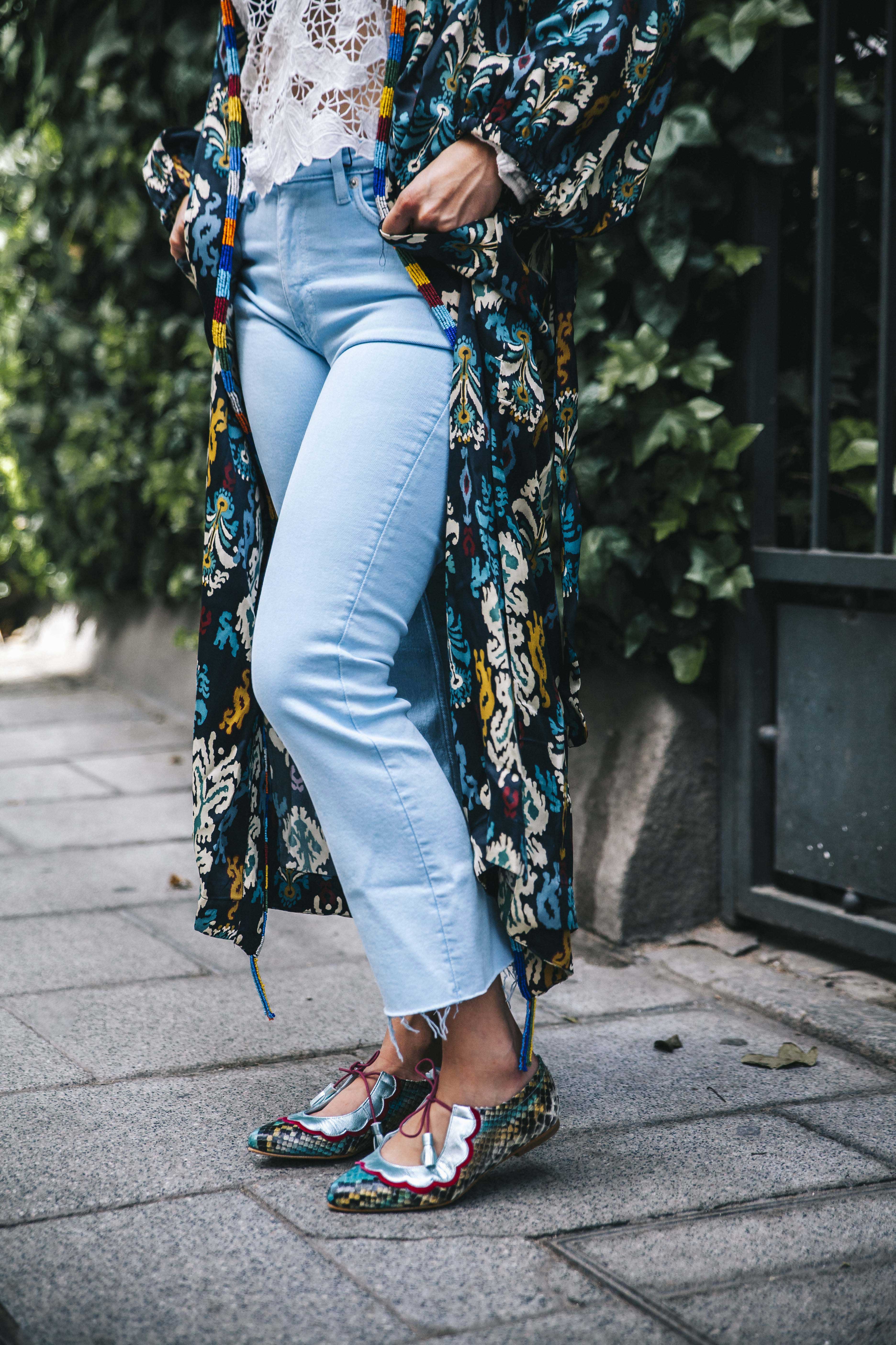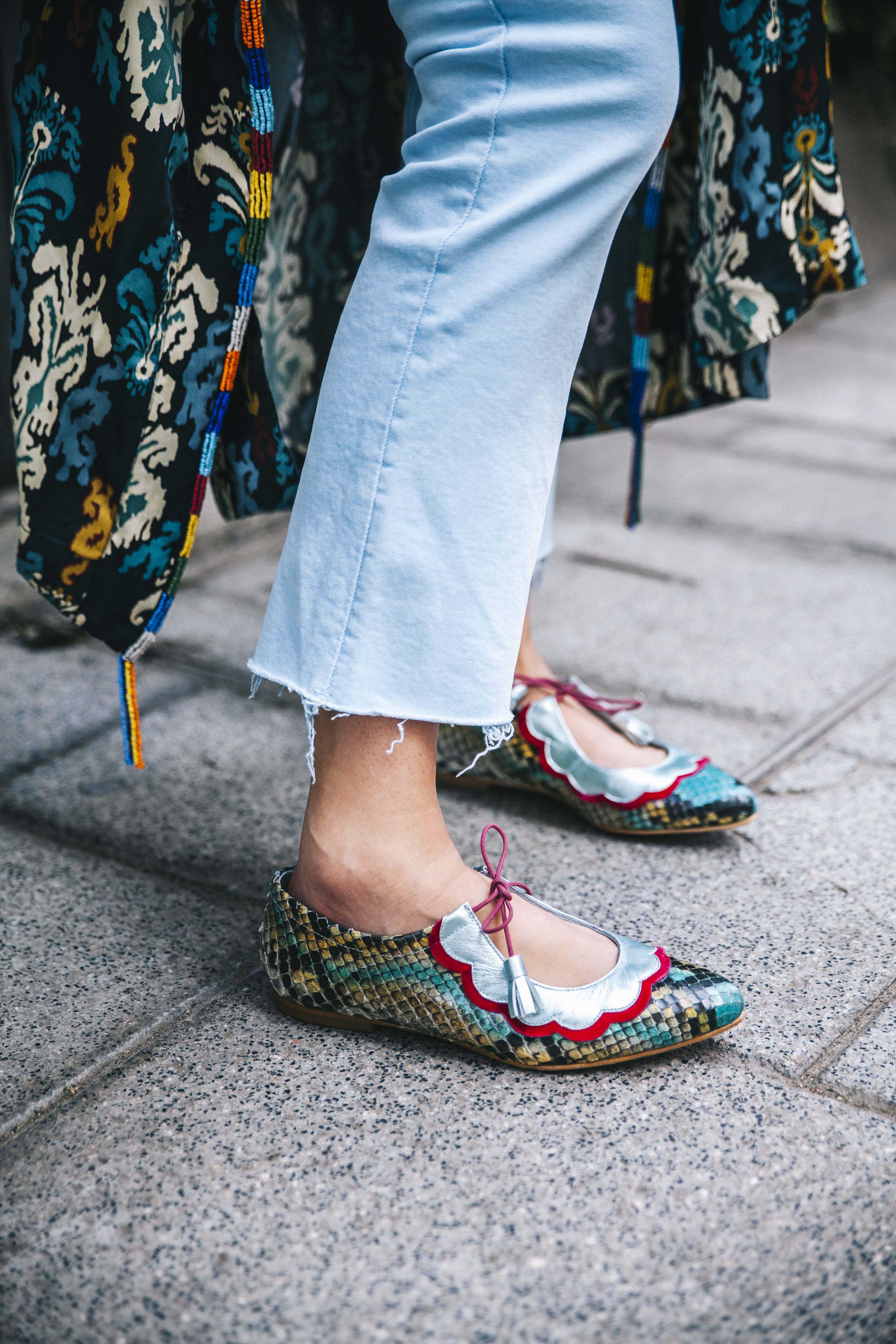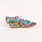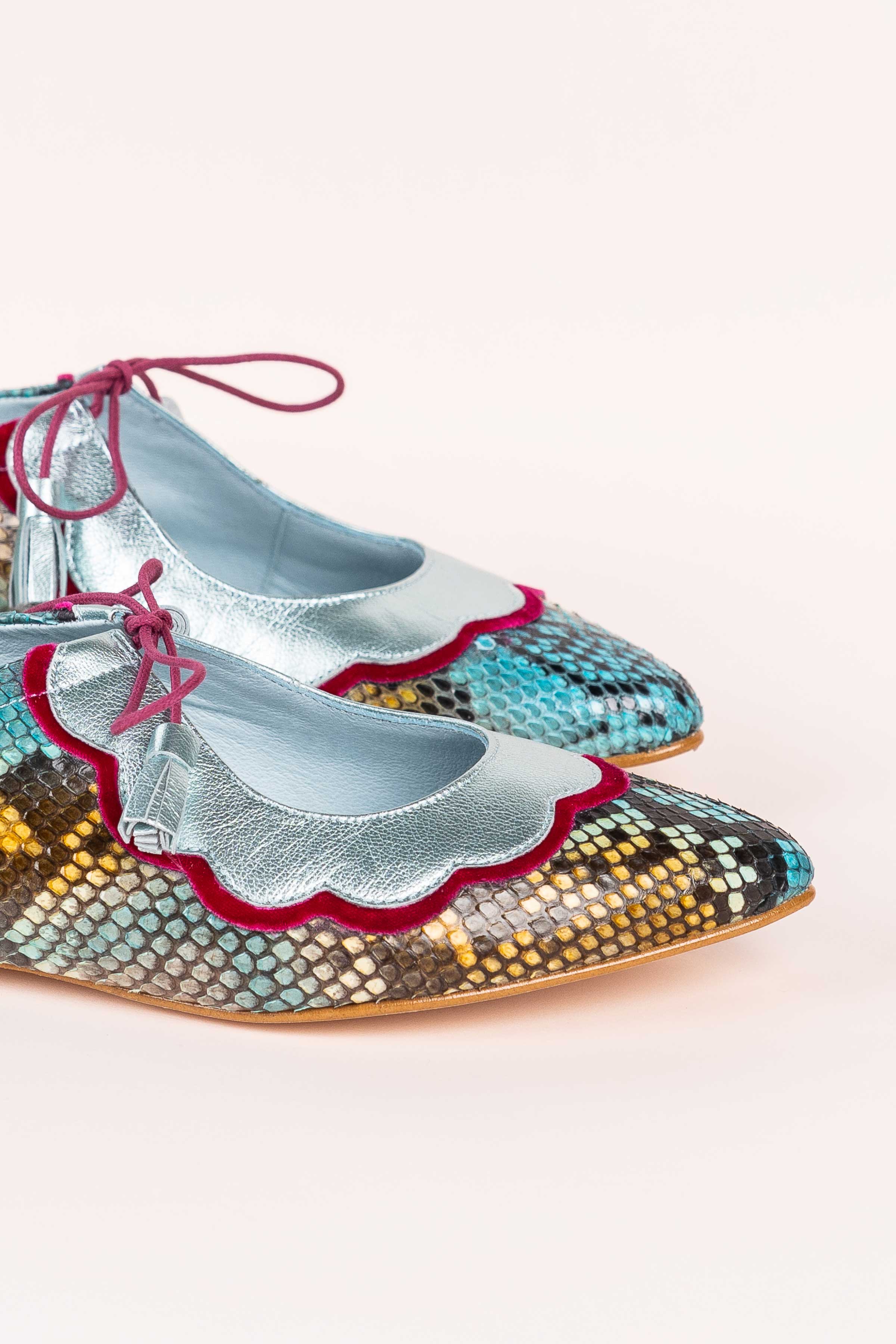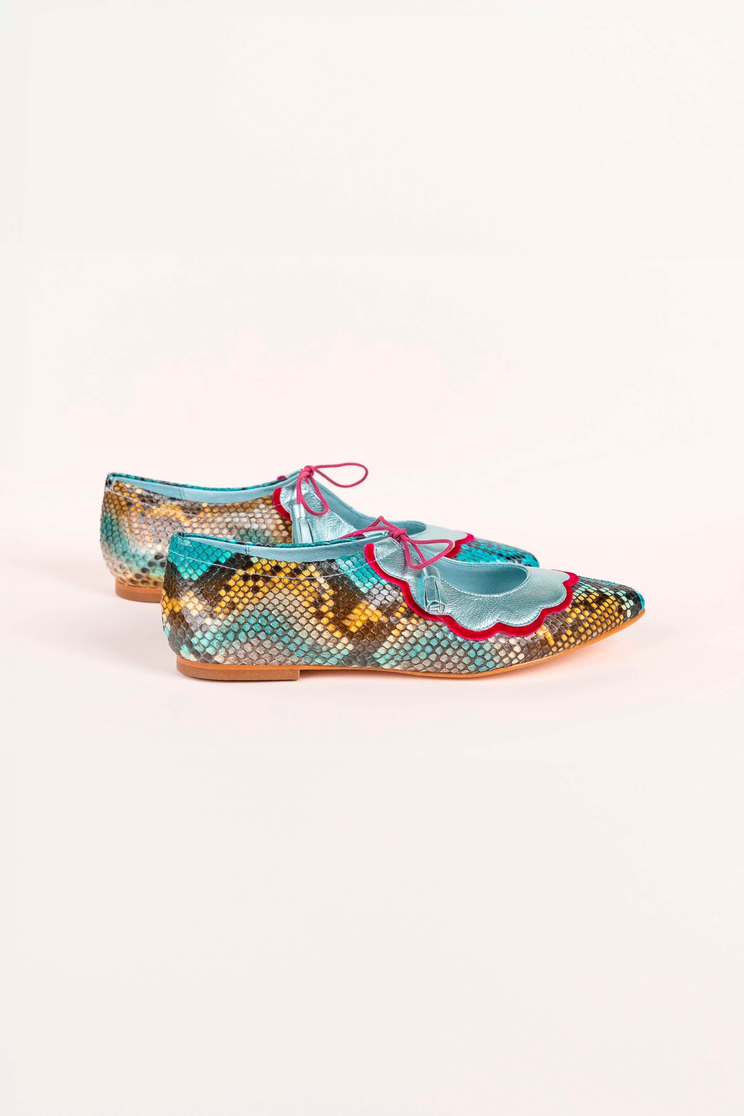 Flat blucher in completely hand-painted natural python skin, with a contrasting double top ruffle• Made in Spain. All our models have a 1.5cm internal wedge. 100% leather interior. Leather sole. Exclusive model from defloresyfloreros, designed and manufactured in Spain.